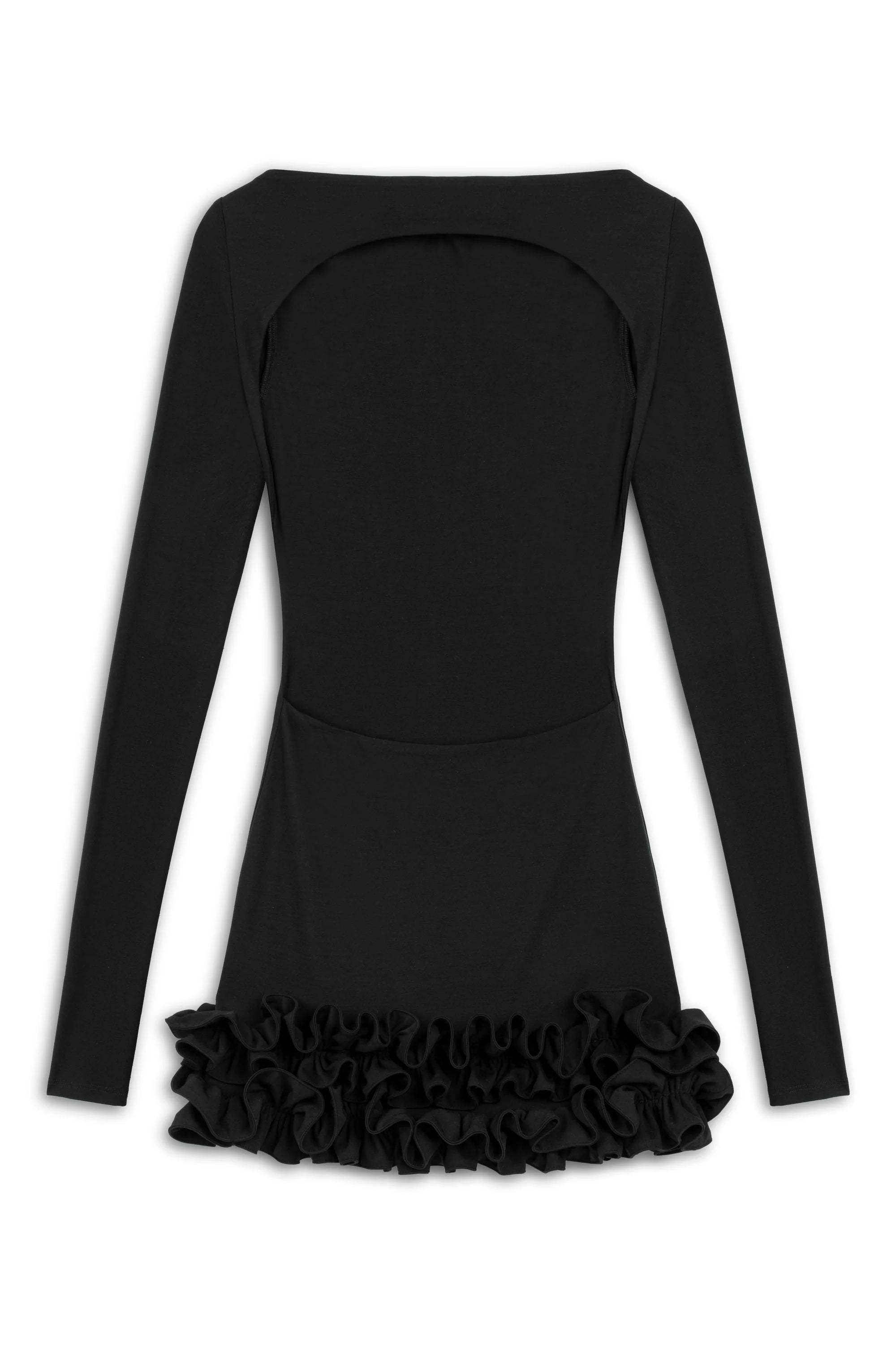 Feminine and bold, this slim-fit jersey mini dress offers a true-to-size silhouette with elegant charm. Featuring a boat neckline and long sleeves, it stuns with a deep open back for a dramatic touch. The ruffled hemline adds playful movement, while the unlined knit fabric keeps it lightweight and comfortable. A standout piece for effortlessly chic occasions.