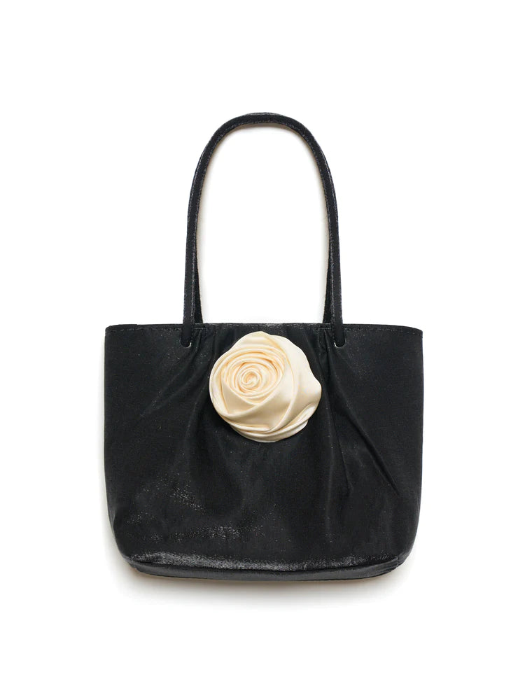 Complete your look with a touch of elegance, courtesy of our Maya Mini Bag. Crafted from a shimmery taffeta fabric, this dainty bag features matching fabric handles and a delicate satin rose trim. It's the perfect accessory for adding a touch of romance to any outfit.