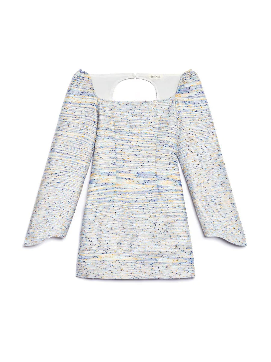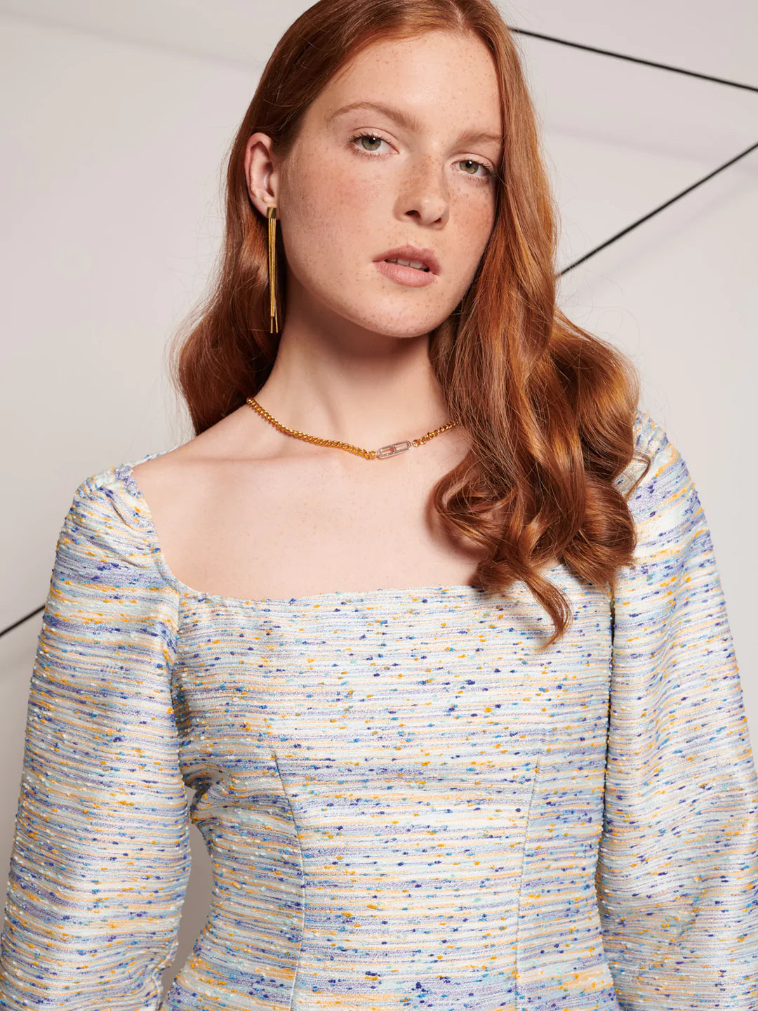 You reference this mixed-coloured weave, tactile to the touch - you had to have this pop of difference in your wardrobe. This fitted style hugged your silhouette, featuring an elasticated square neckline - had you seen this before? People look twice as you walk by; the full-length sleeves are finished with curved hems.