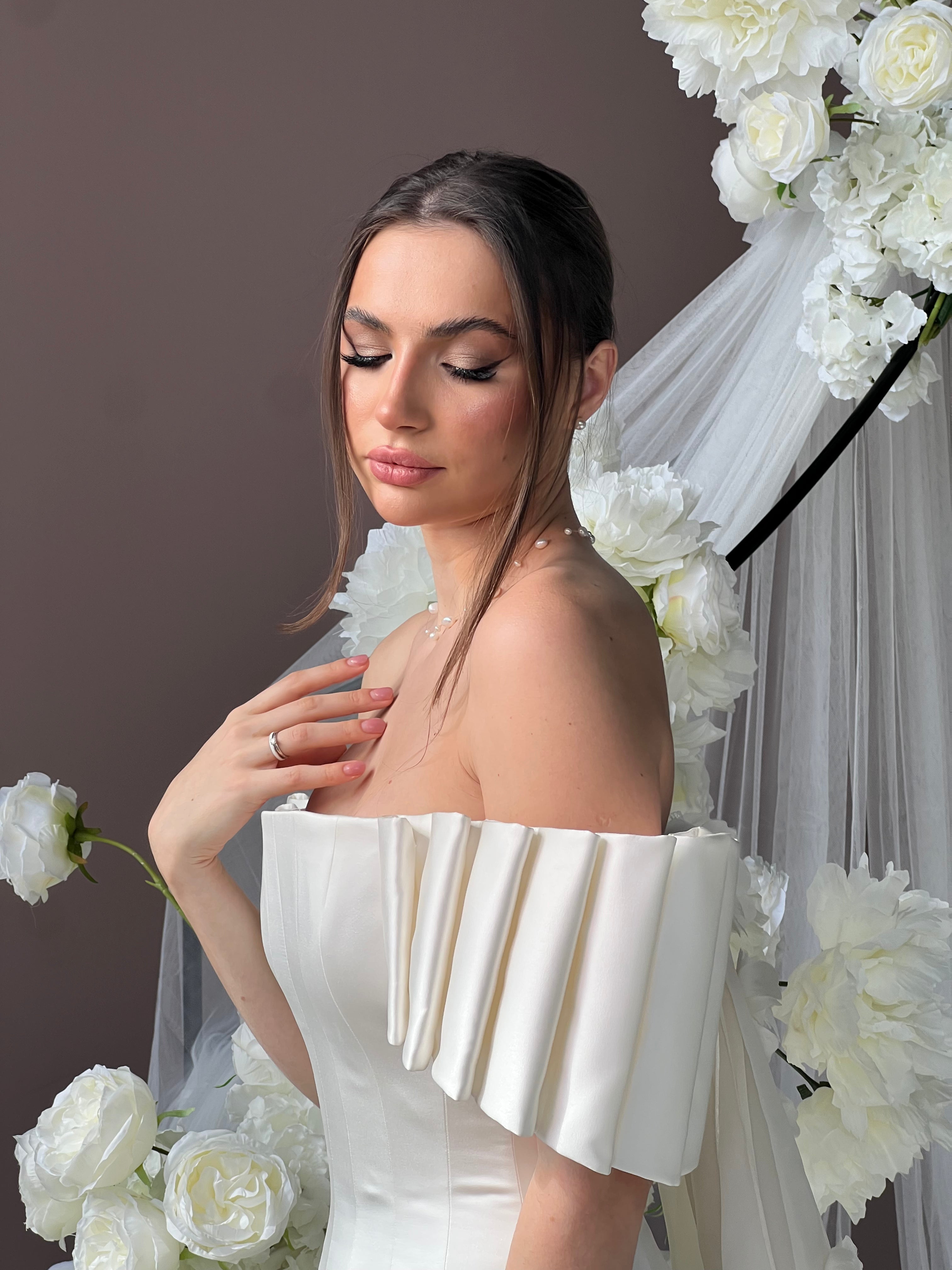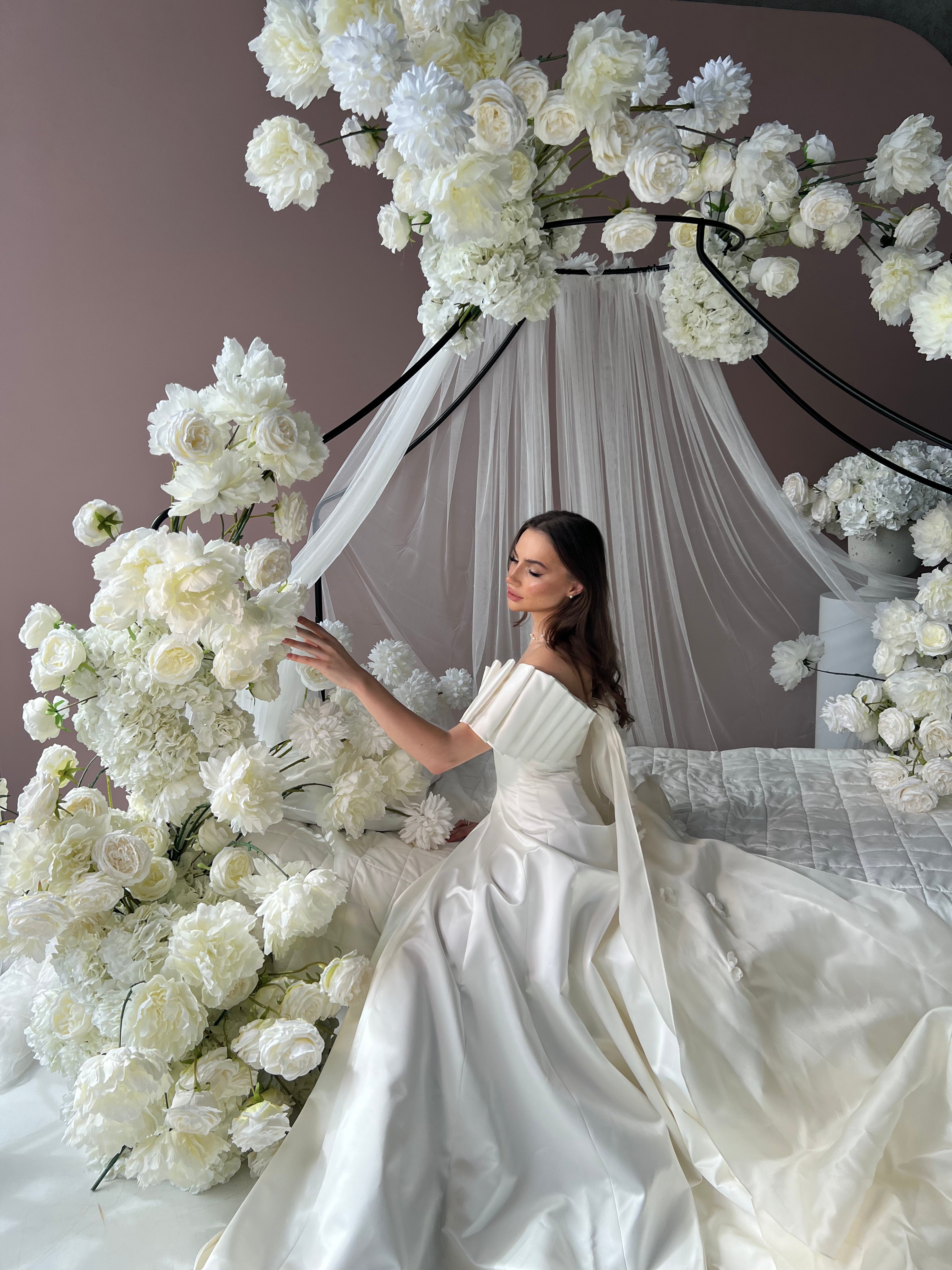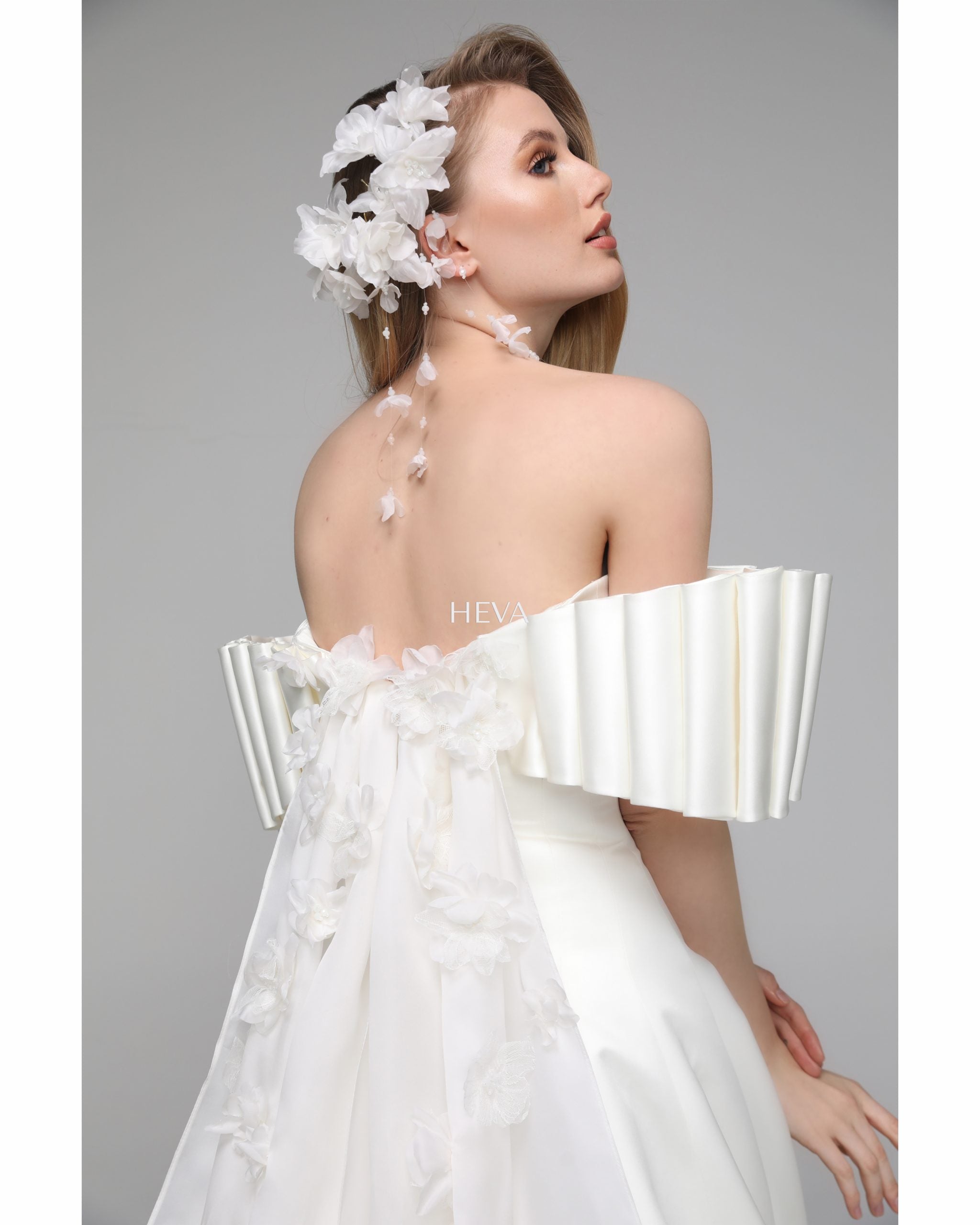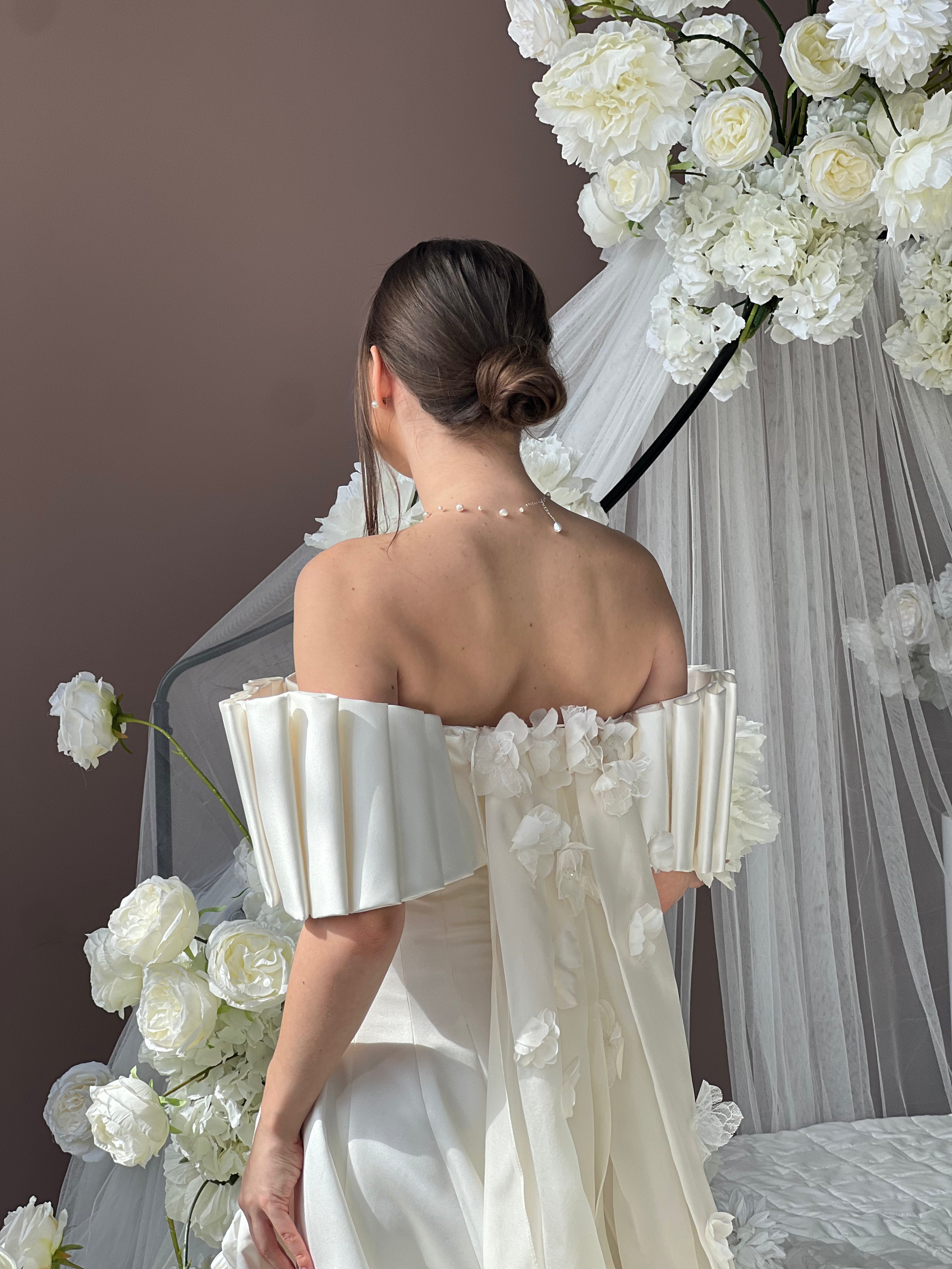 In this design, we created a beautiful harmony with 3-dimensional handmade flowers on satin fabric. The silk organza tail on the back complements the simplicity of the design with magnificence. We naïve this powerful image with handmade flower details. Our favorite detail in this design is the arms.