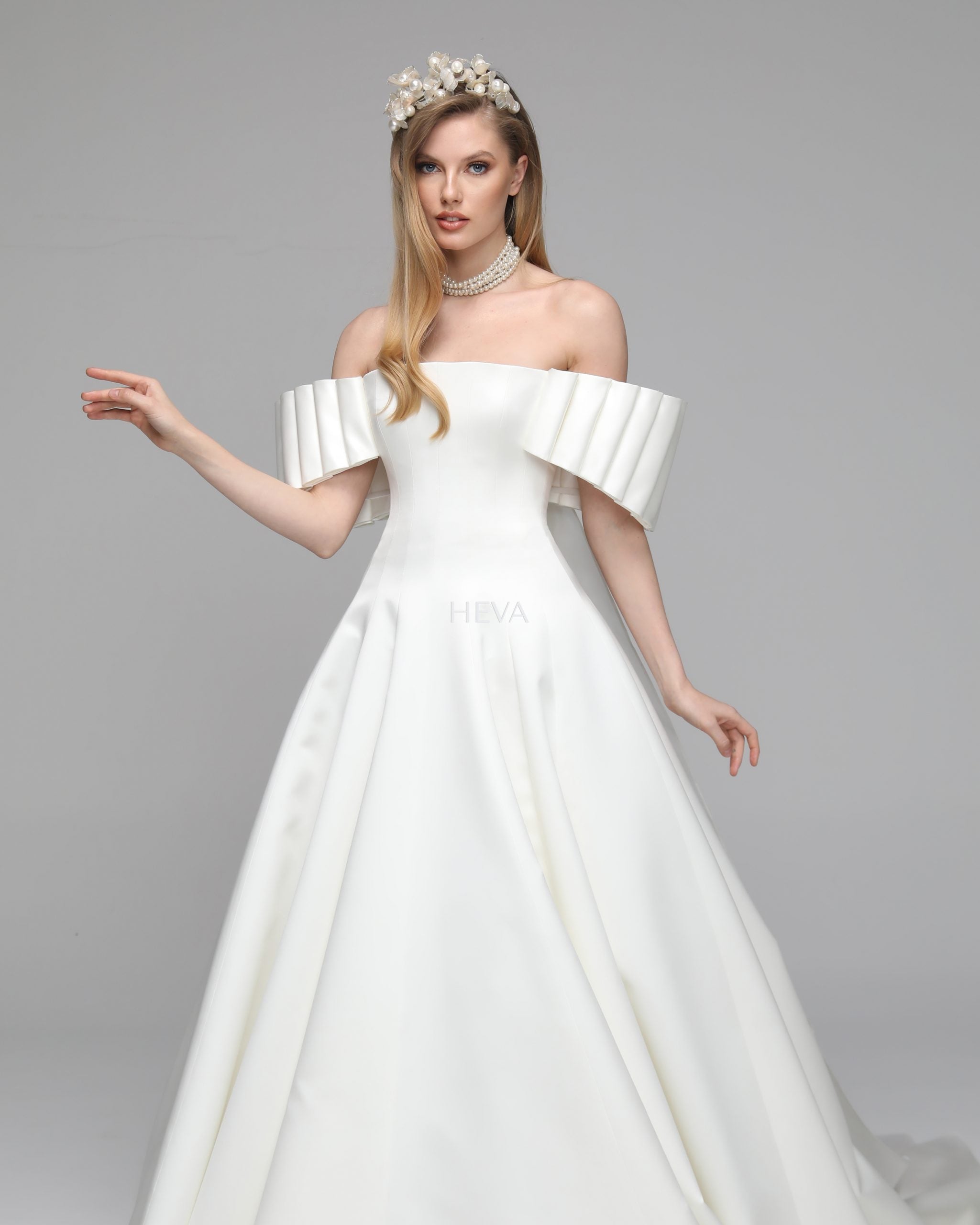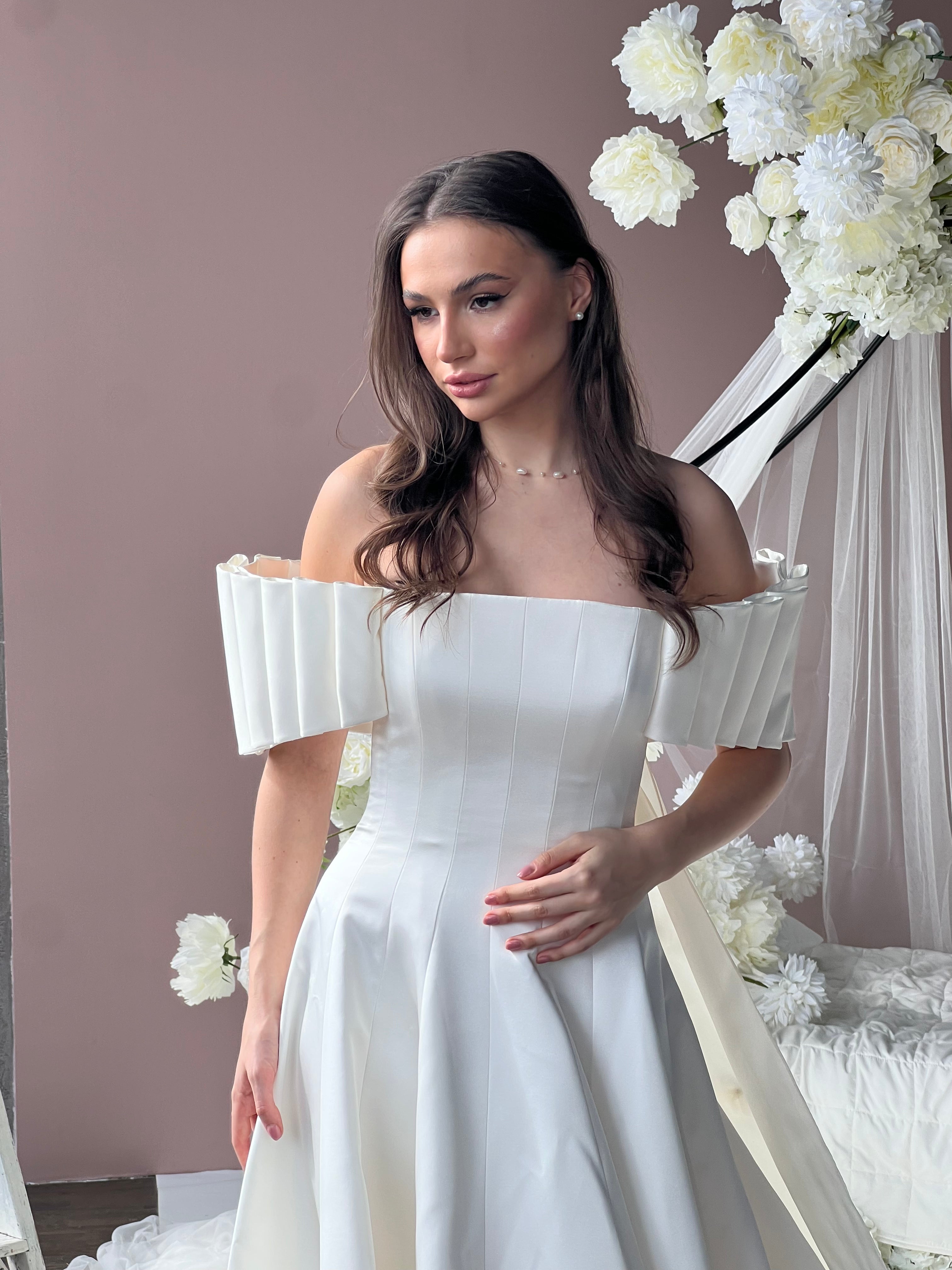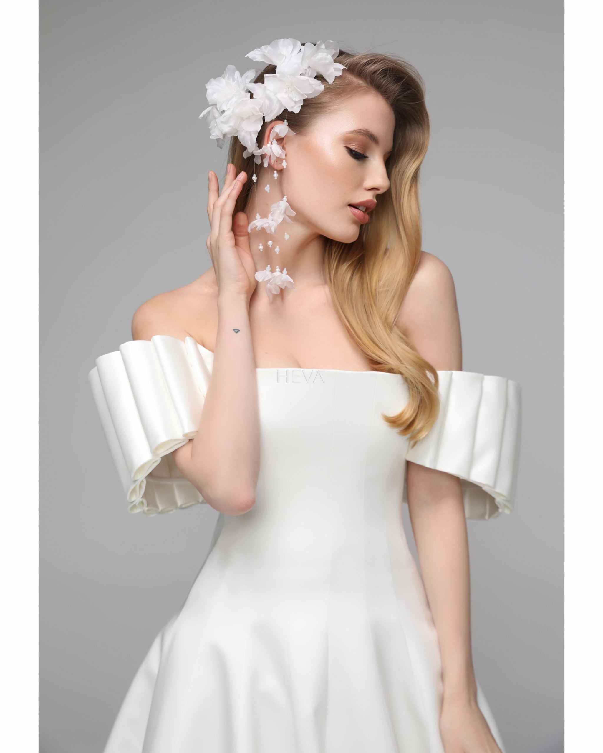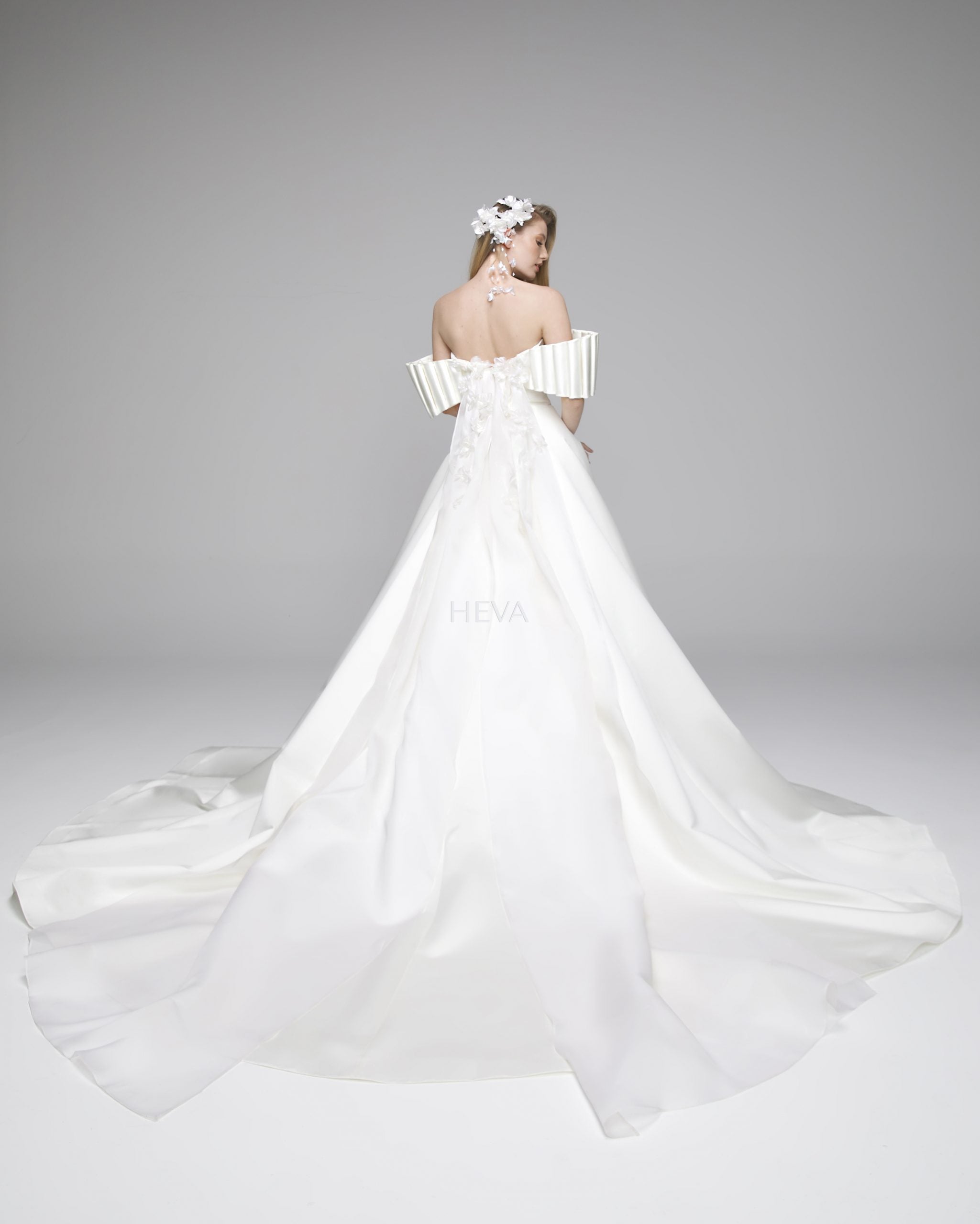 In this design, we created a beautiful harmony with 3-dimensional handmade flowers on satin fabric. The silk organza tail on the back complements the simplicity of the design with magnificence. We naïve this powerful image with handmade flower details. Our favorite detail in this design is the arms.