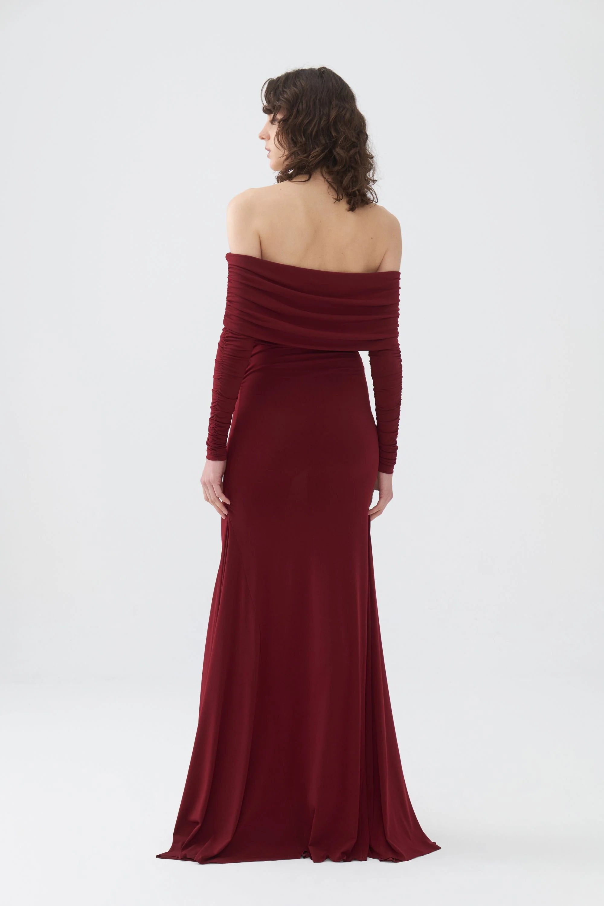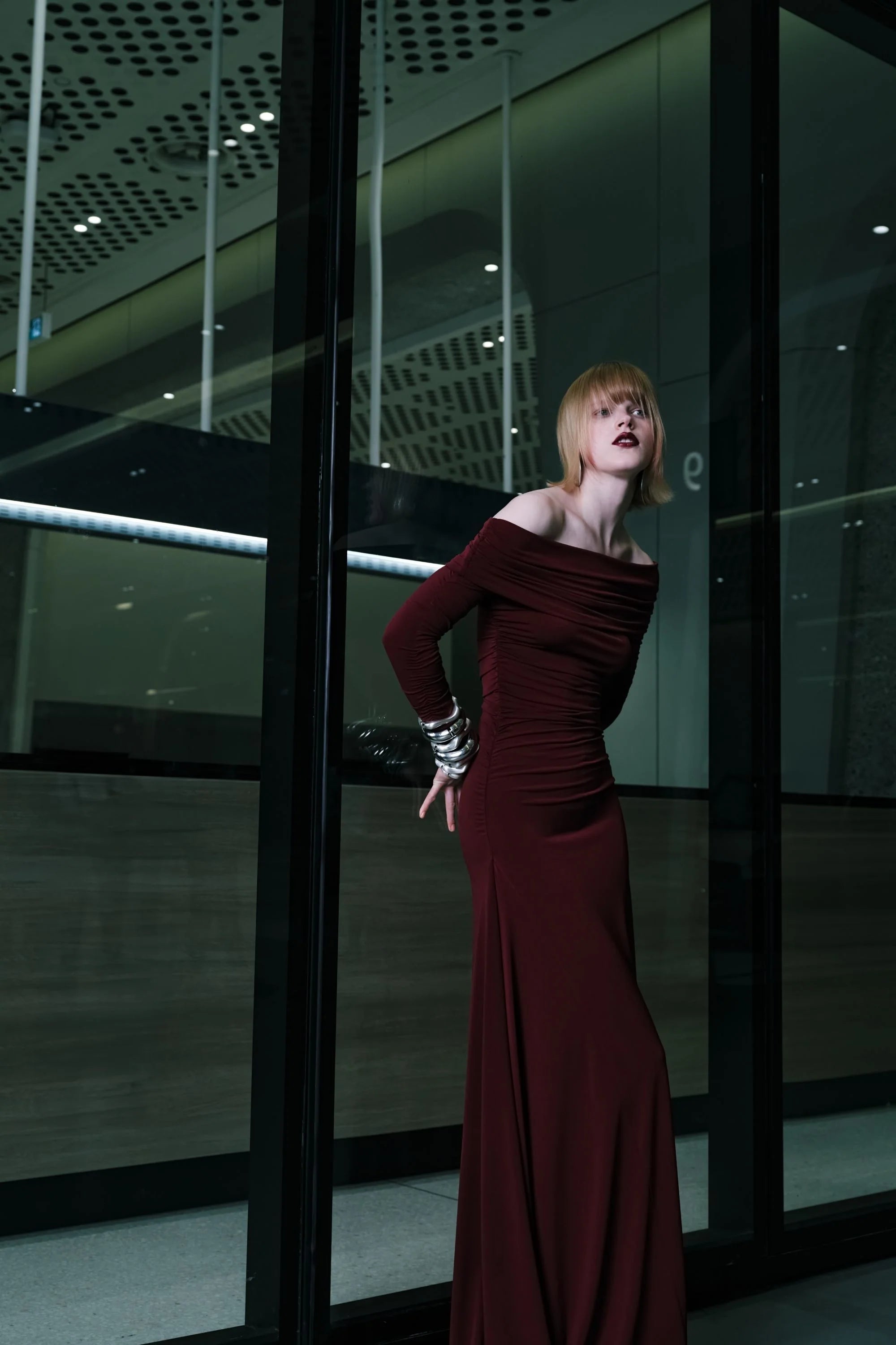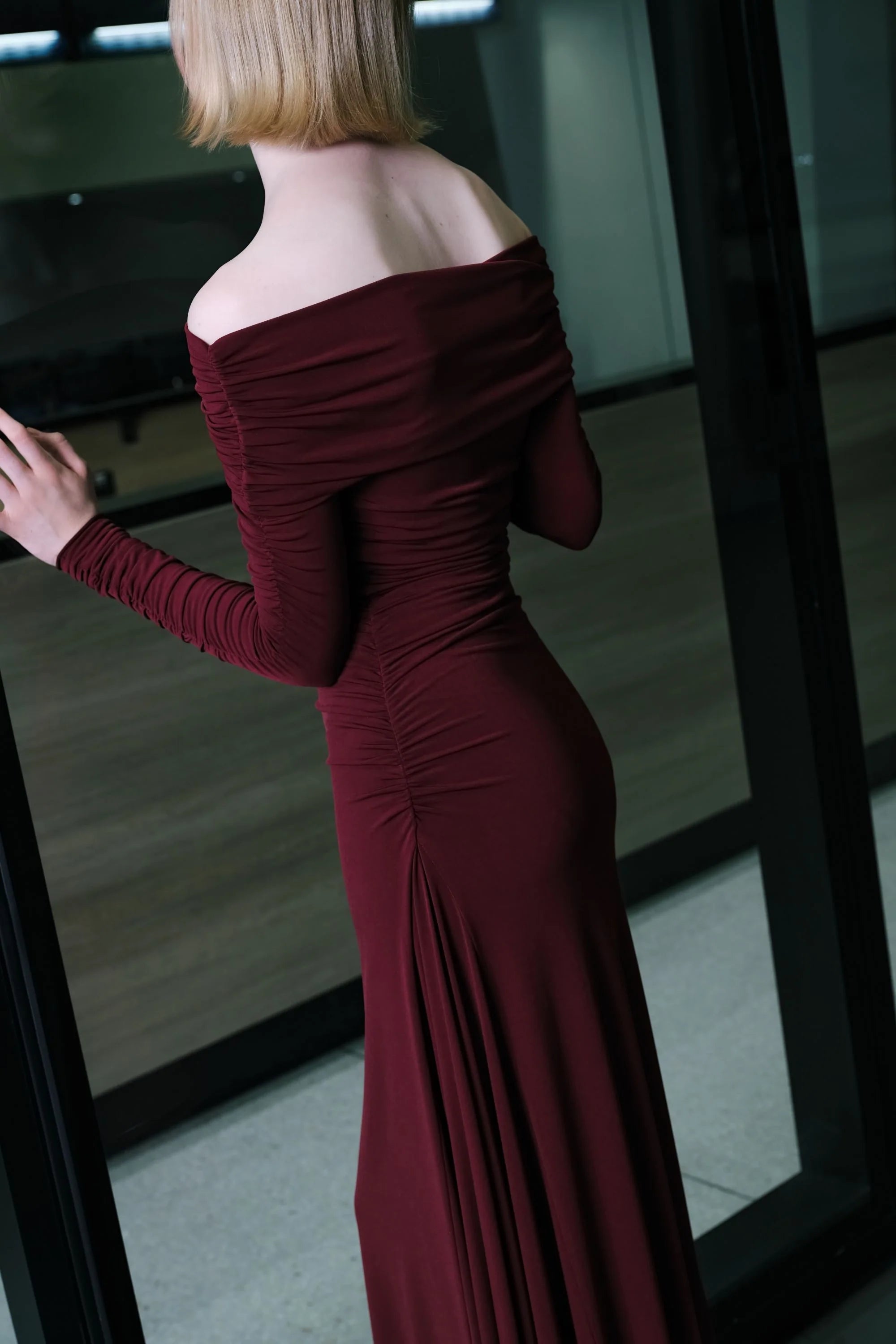 Slim fit, full fit, unlined, long sleeves, no zipper, flexible fabric, straight neck, off-the-shoulder and layered design, maxi dress.