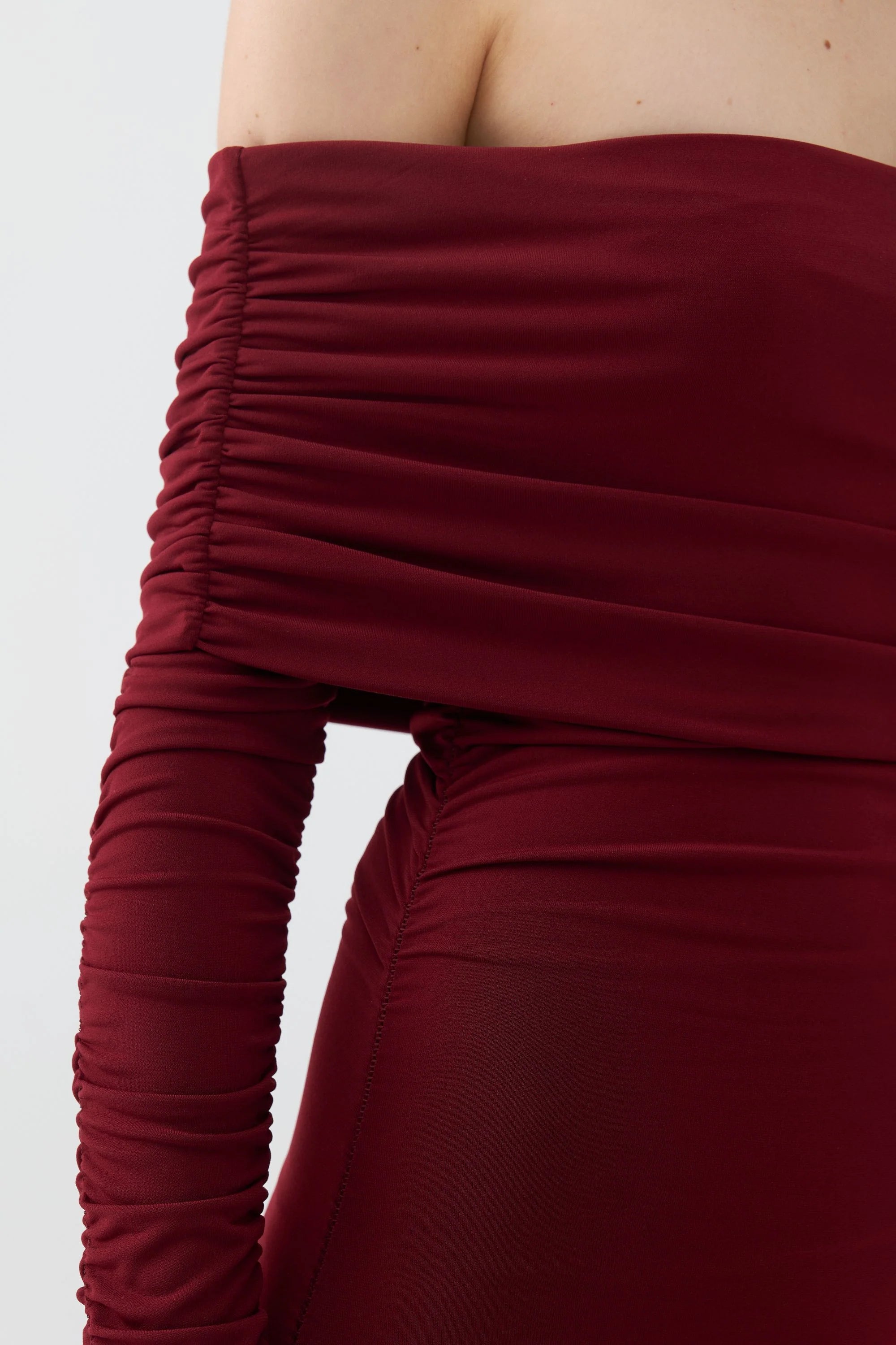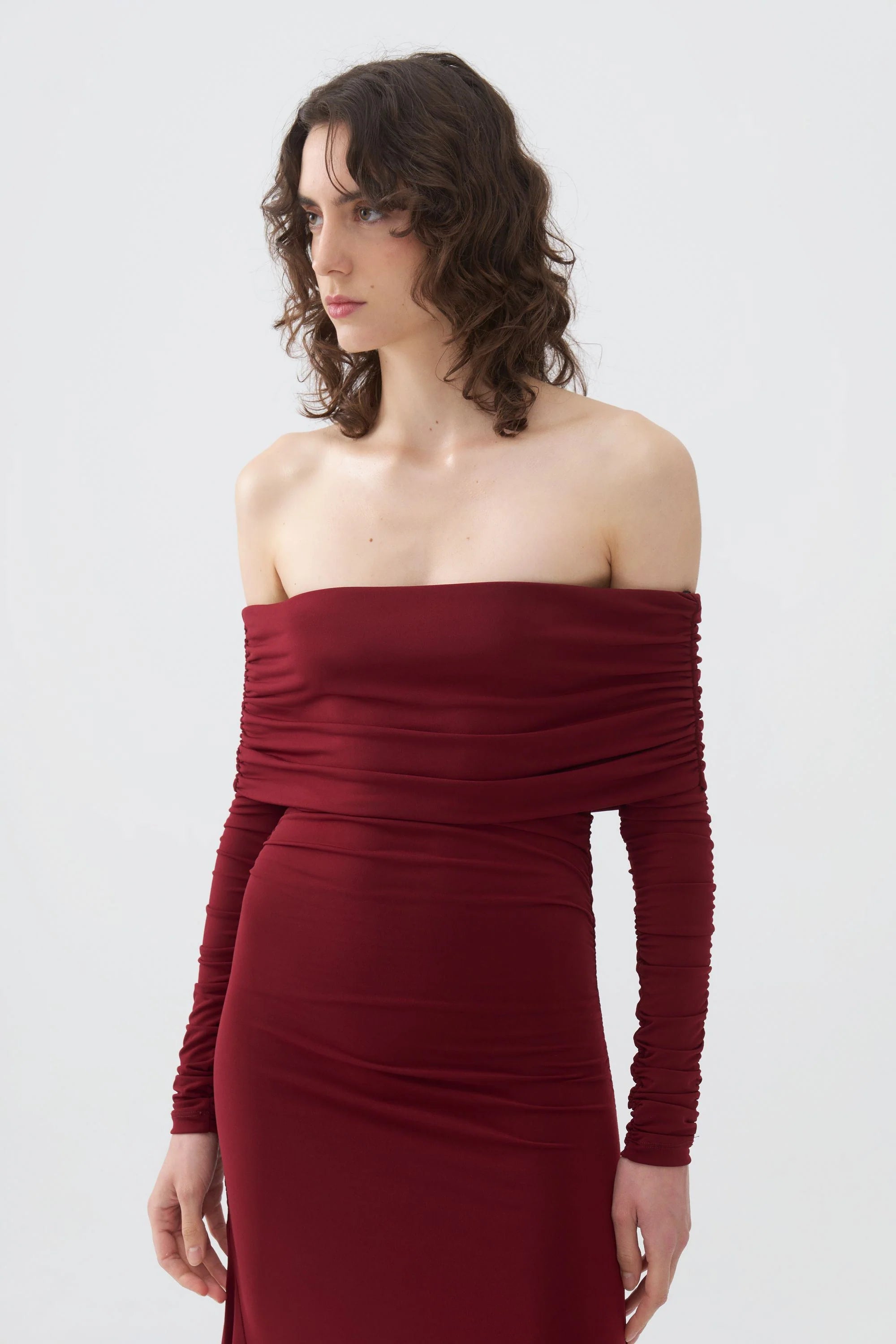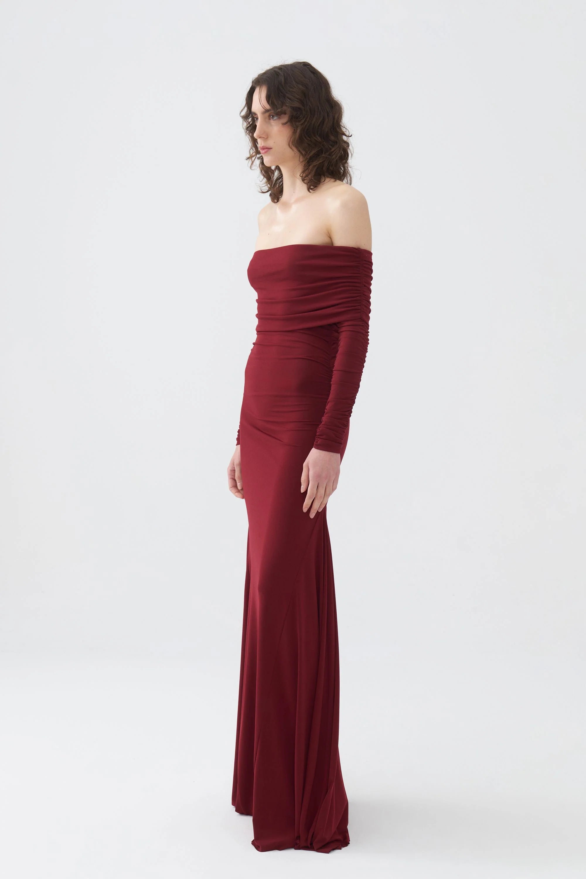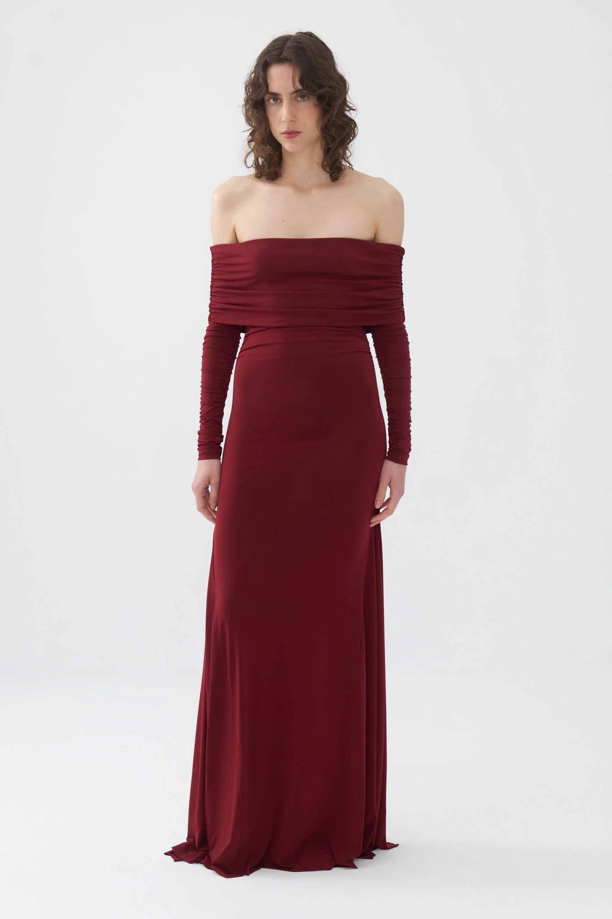 Slim fit, full fit, unlined, long sleeves, no zipper, flexible fabric, straight neck, off-the-shoulder and layered design, maxi dress.