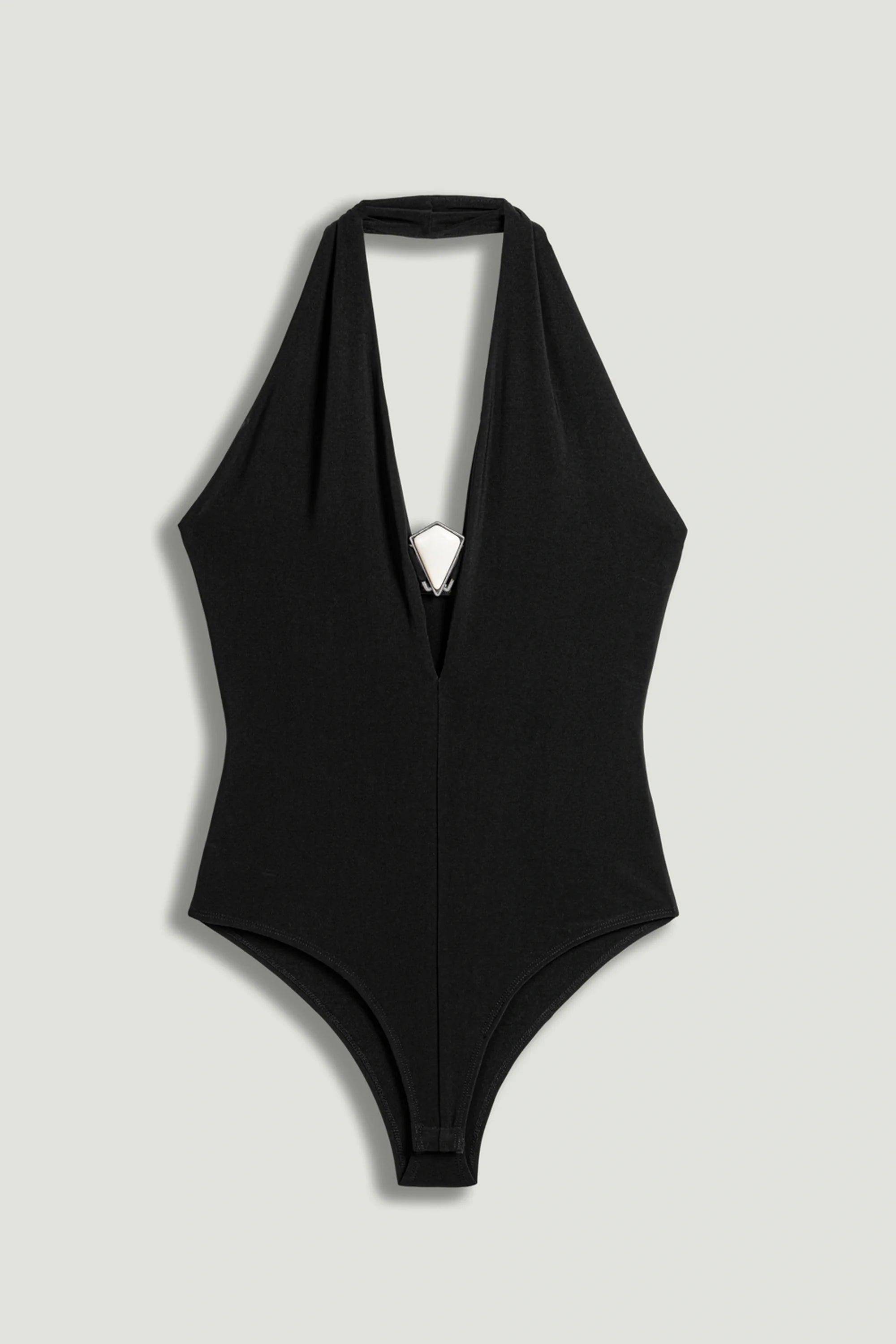 A sleek halter blouse with a deep V neckline, designed to create a clean and elongated silhouette. Minimal yet striking, it pairs effortlessly with both tailored and relaxed bottoms.