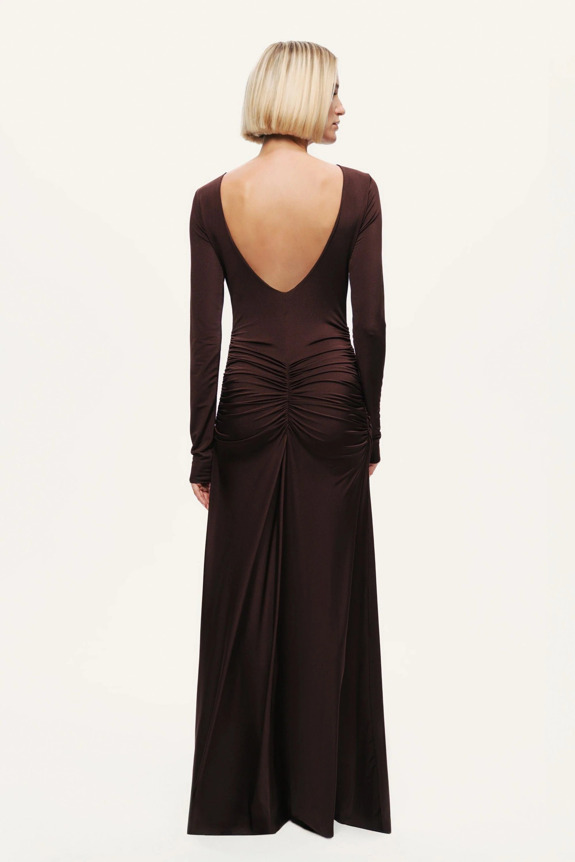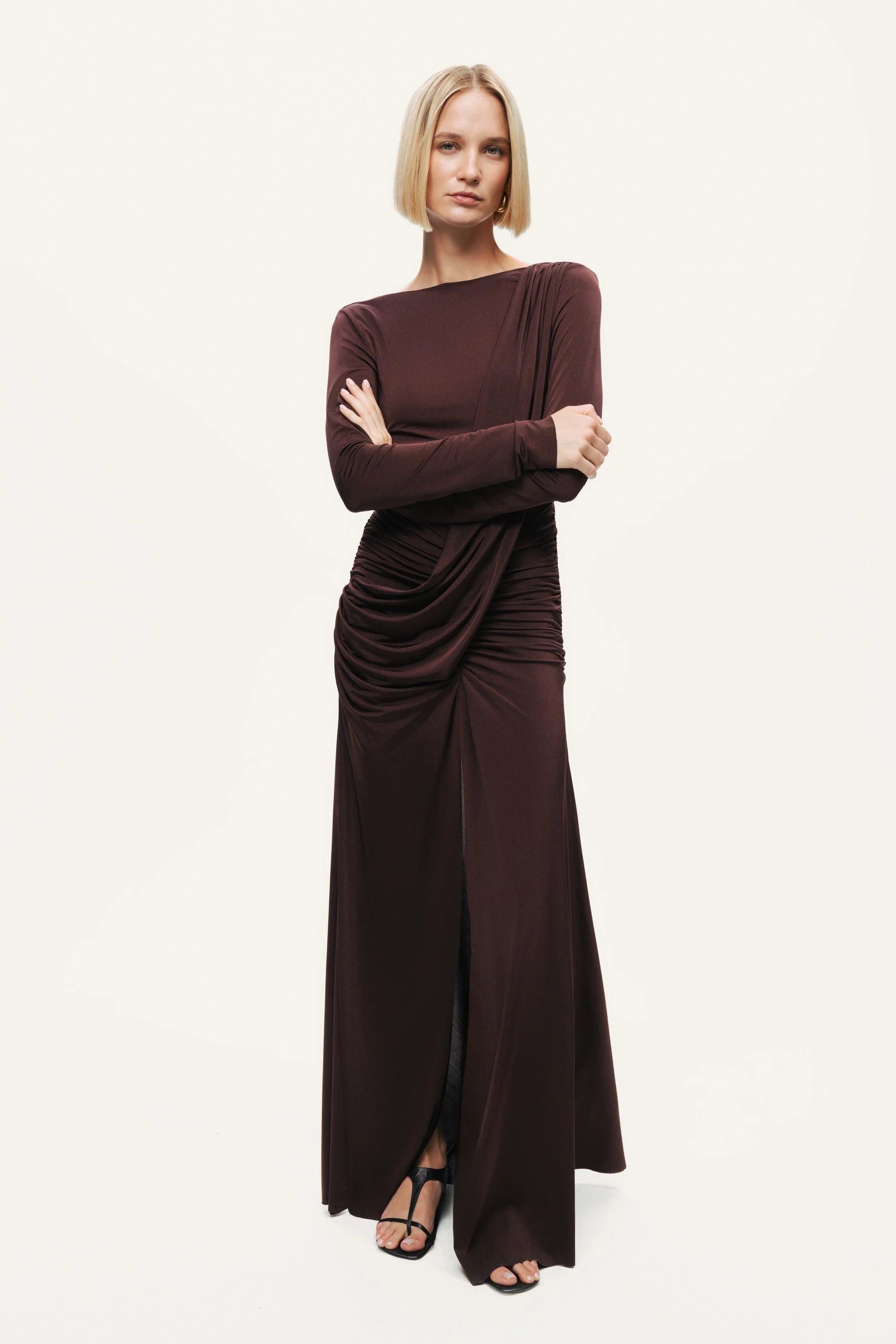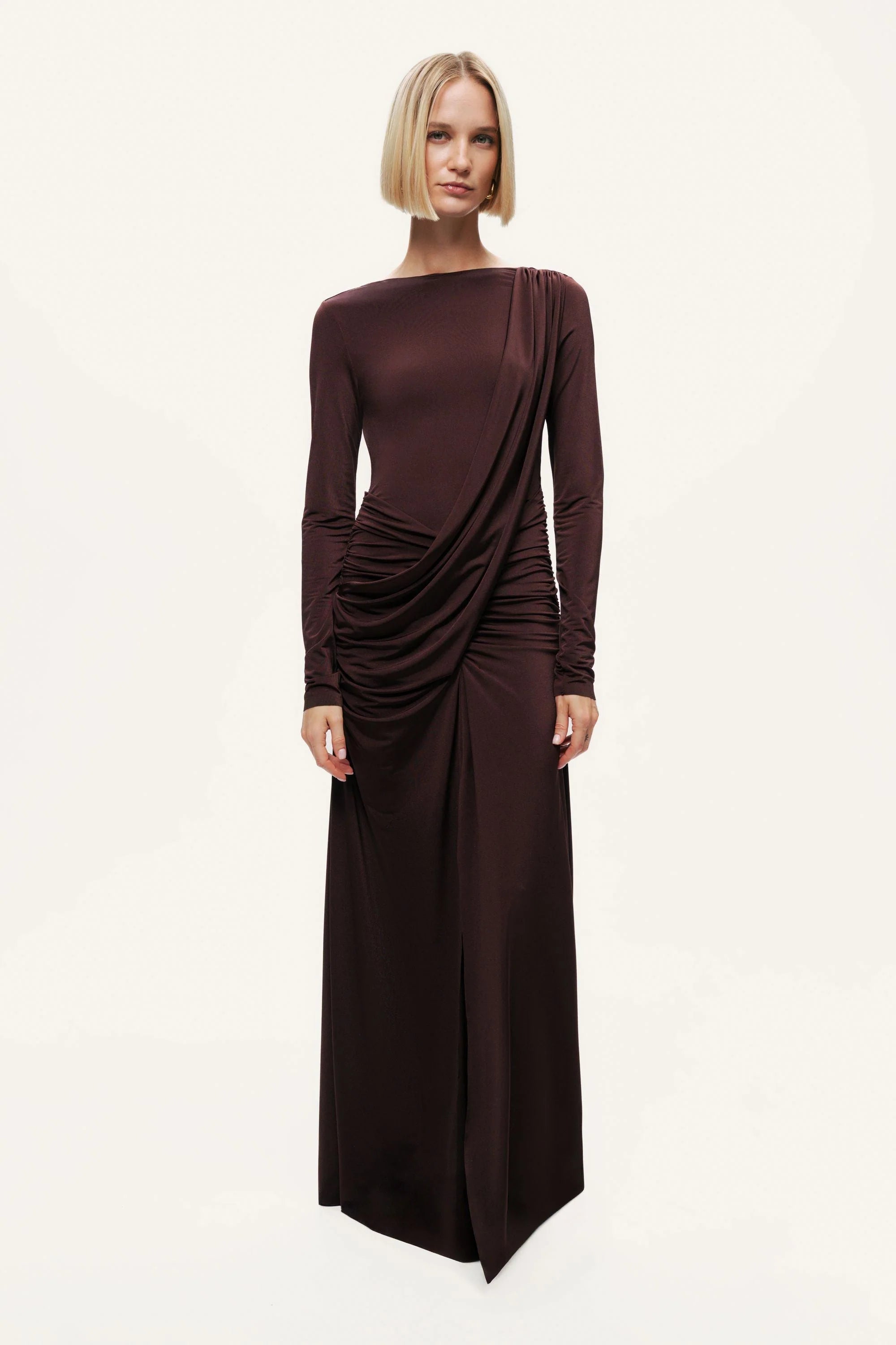 Elegantly fluid and alluring, this full-length dress features a bateau neckline and long sleeves balanced by an...
