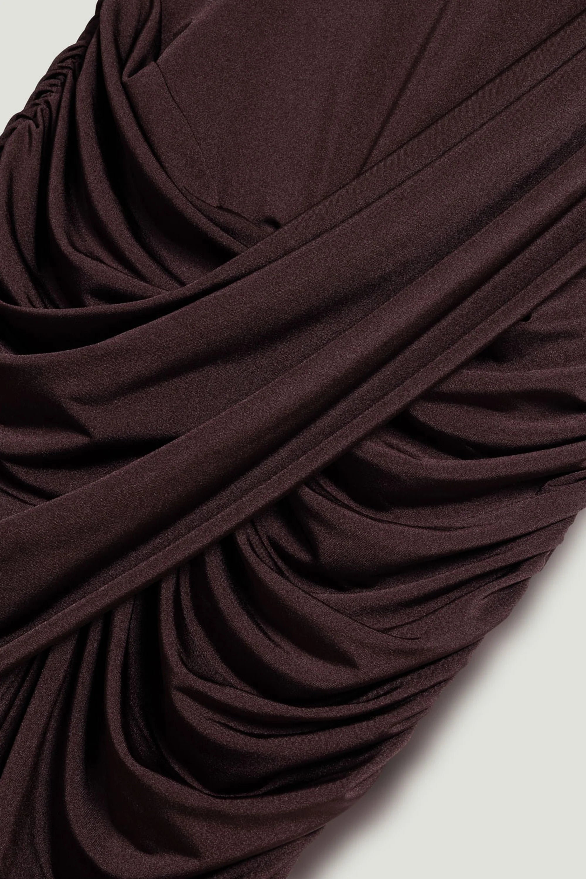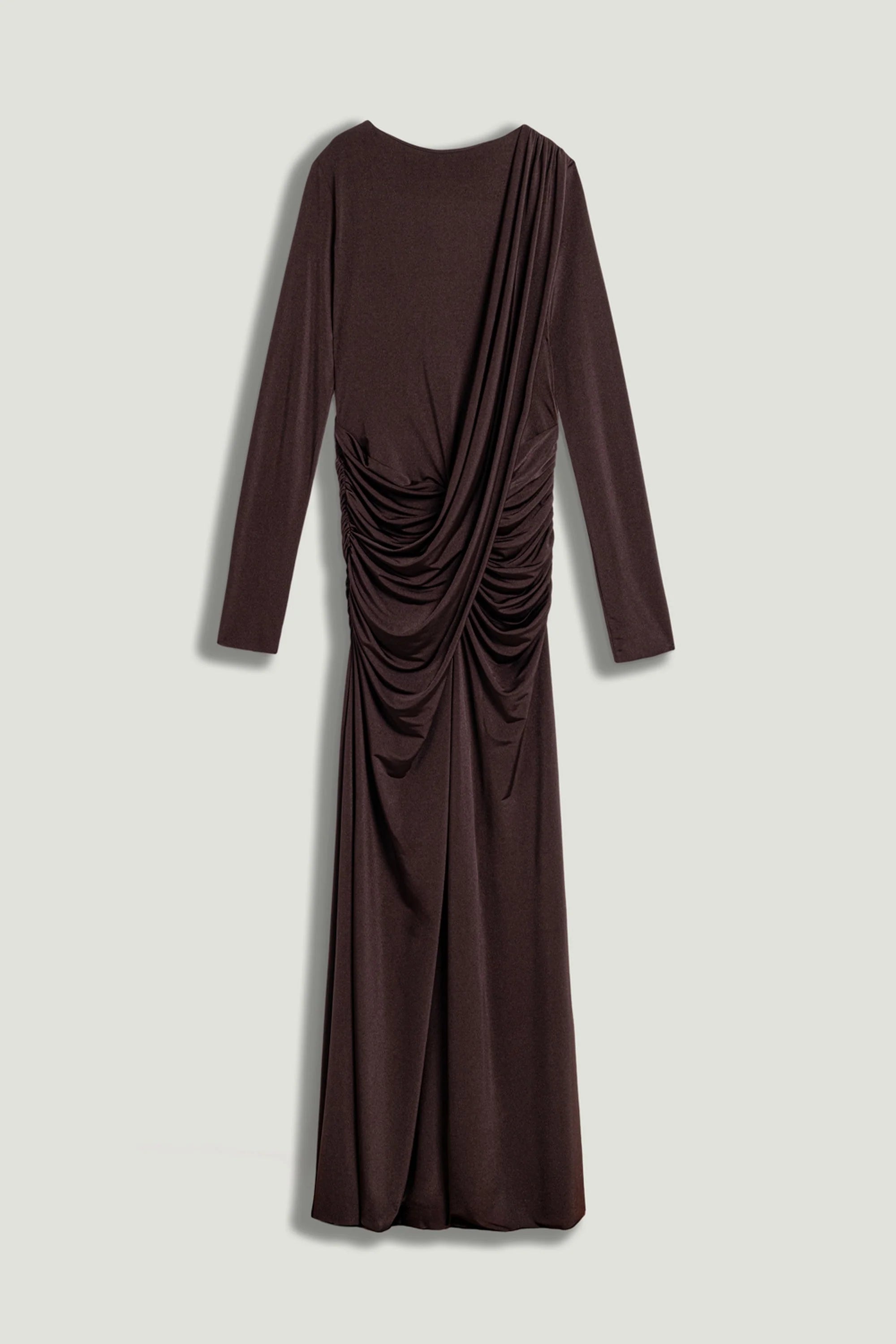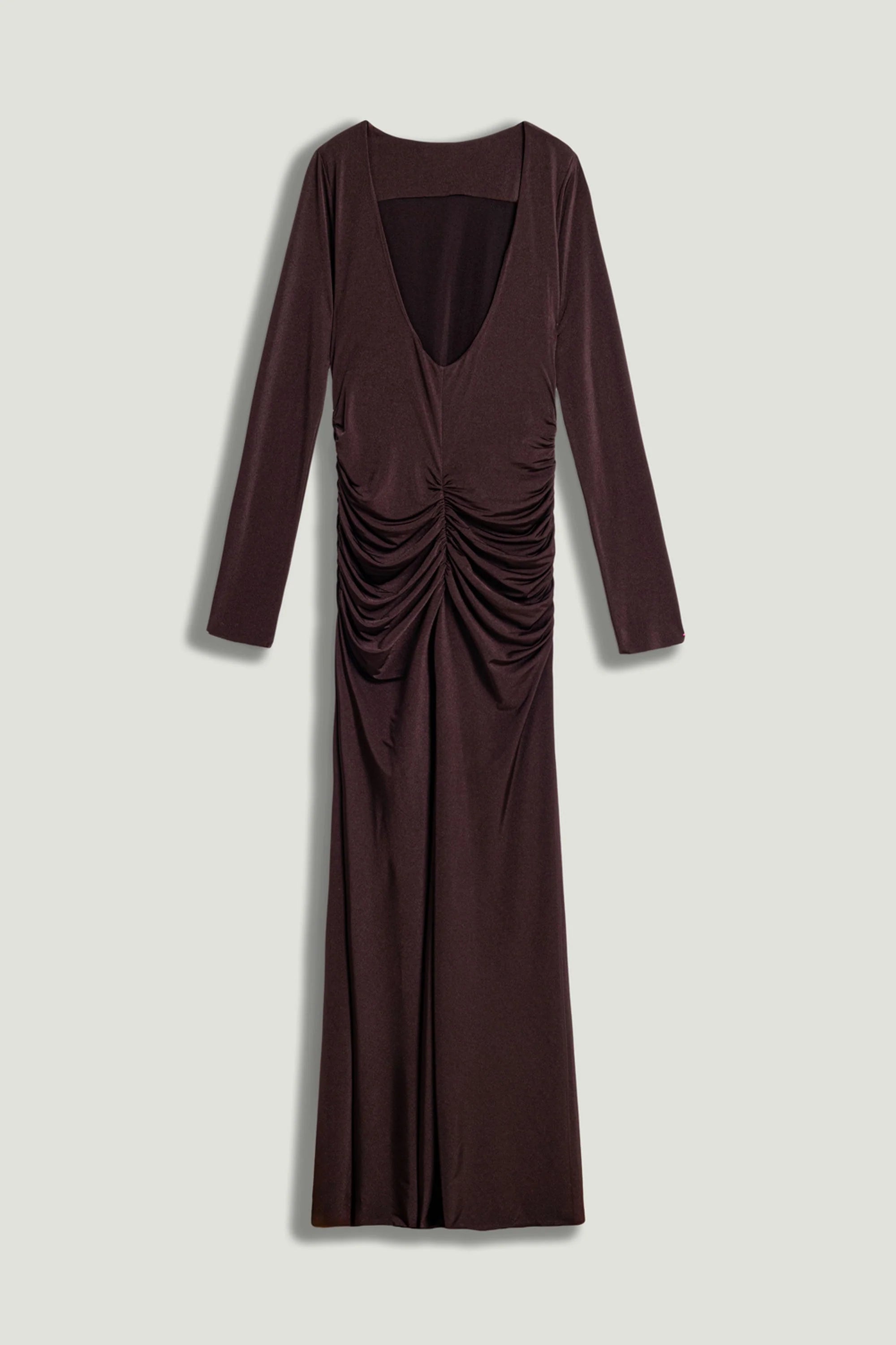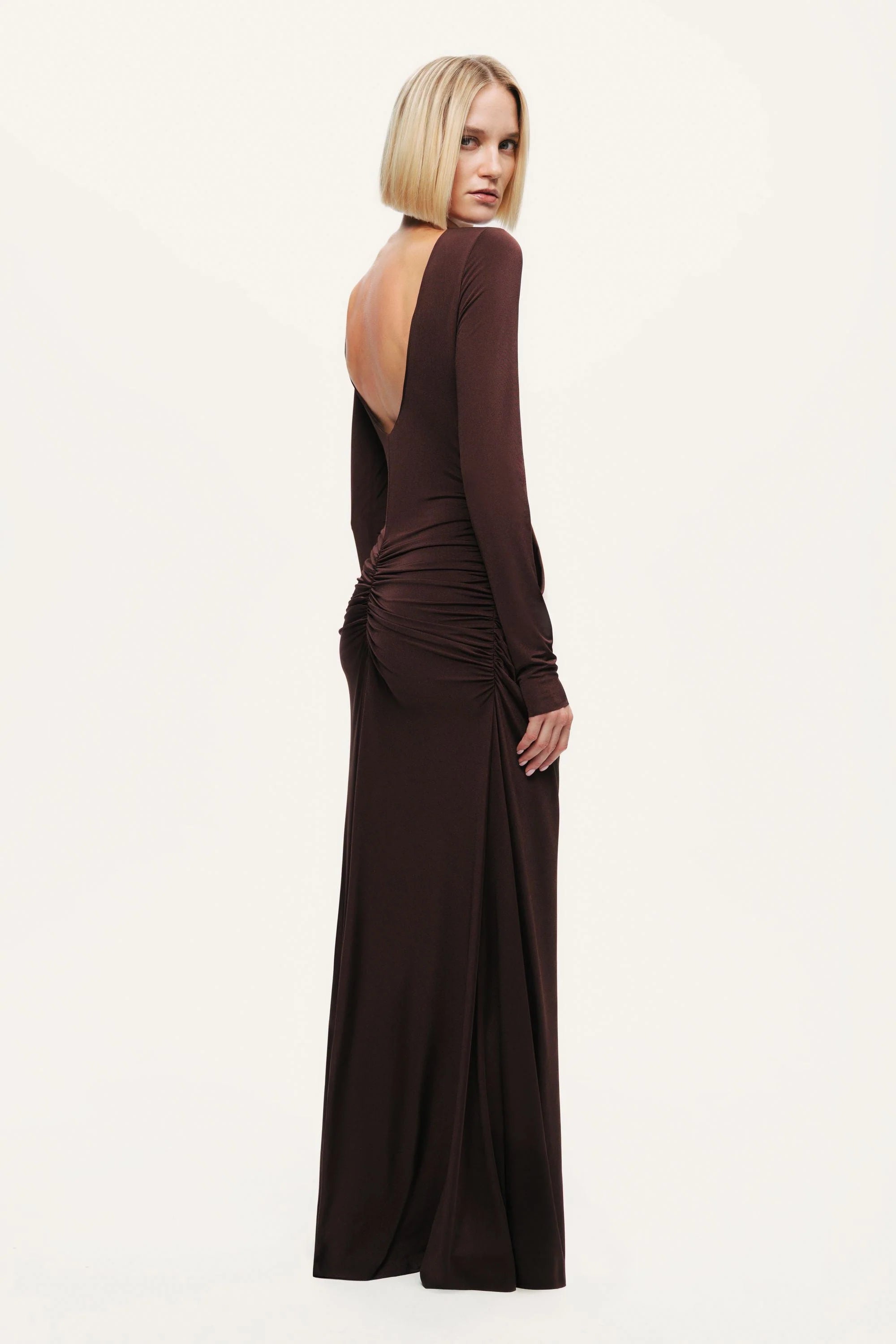 Elegantly fluid and alluring, this full-length dress features a bateau neckline and long sleeves balanced by an...
