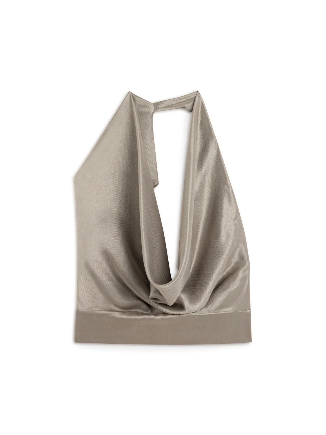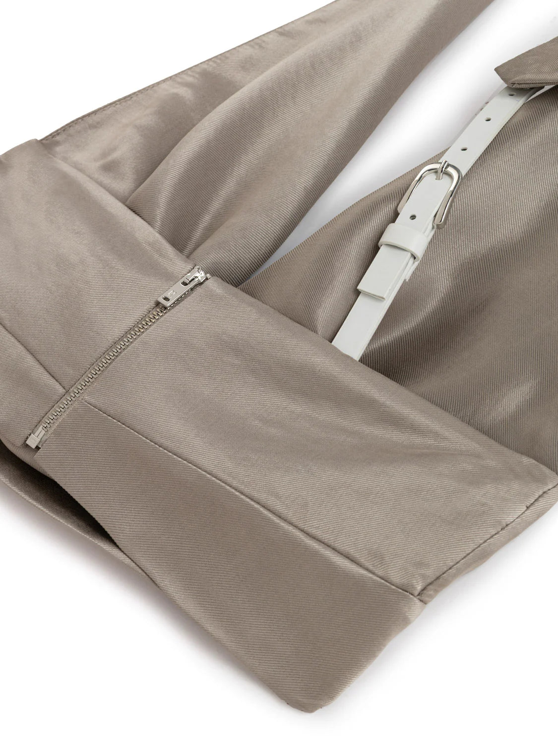 A bold yet elegant statement piece, this backless blouse features a gracefully draped cowl collar for a refined touch. The metal zipper closure ensures a sleek and structured fit, while the self-dressed design adds a seamless, sophisticated look. The standout feature is the detachable belt accessory on the back, enhancing the silhouette with a unique and adjustable detail. Perfect for modern, chic styling with a daring edge.