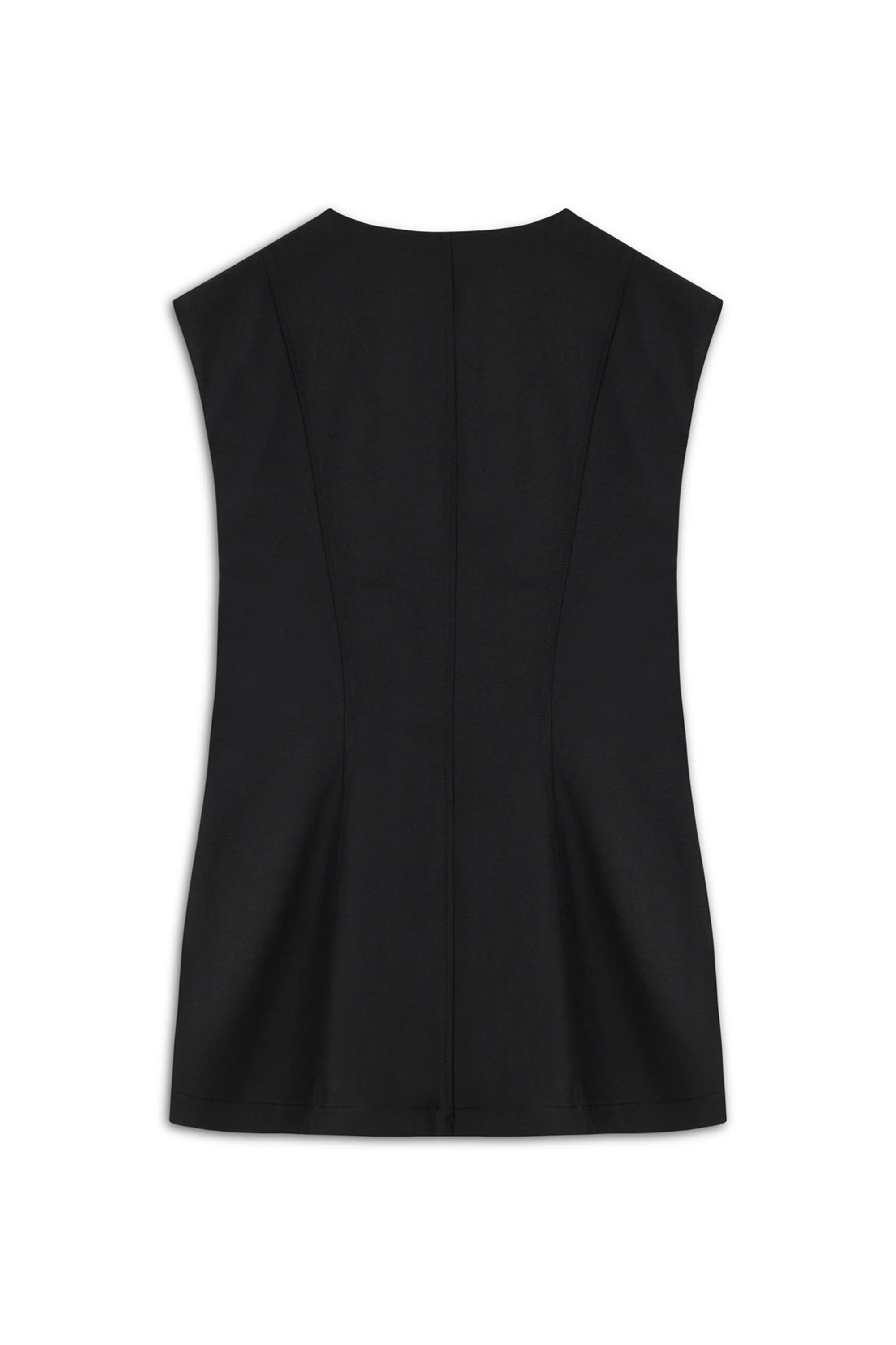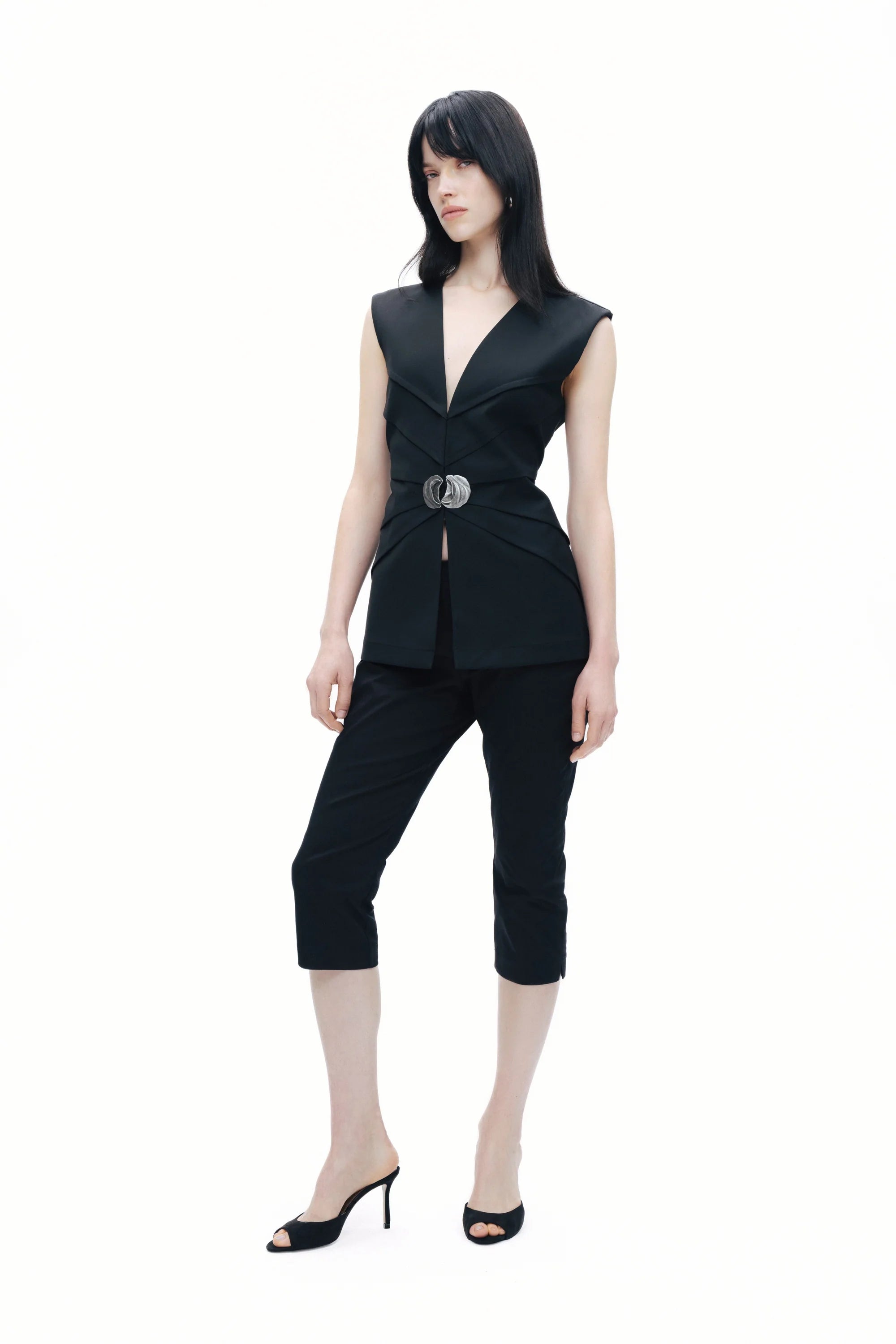 A sleek and structured staple, this regular-fit vest offers a true-to-size silhouette with a sharp V-neckline. Designed with pleated detailing for added texture, it features a hidden hook closure for a seamless look. The metal accessory details add a modern edge, while the lined construction ensures comfort and a polished finish. Perfect for layering or standout styling.