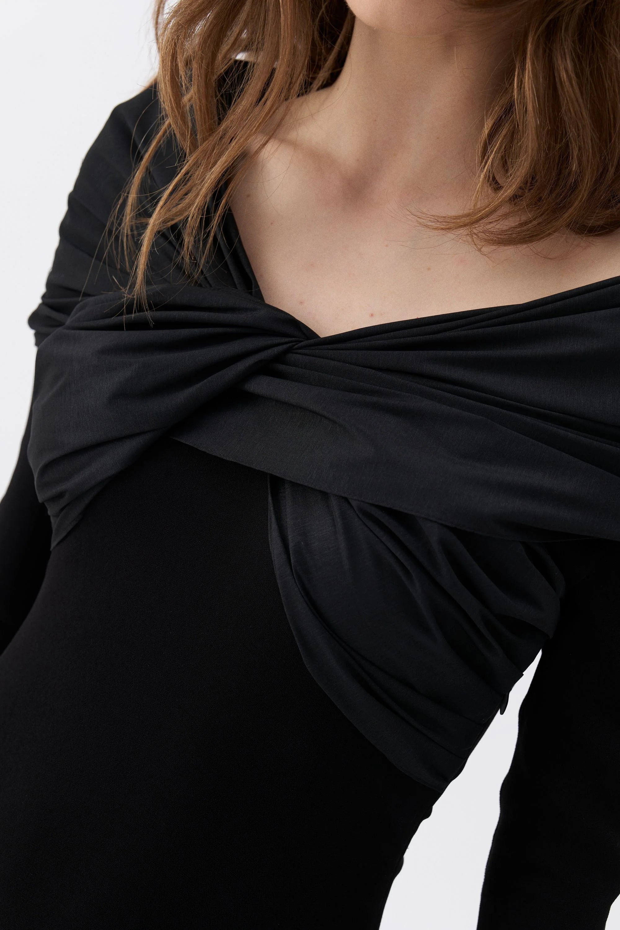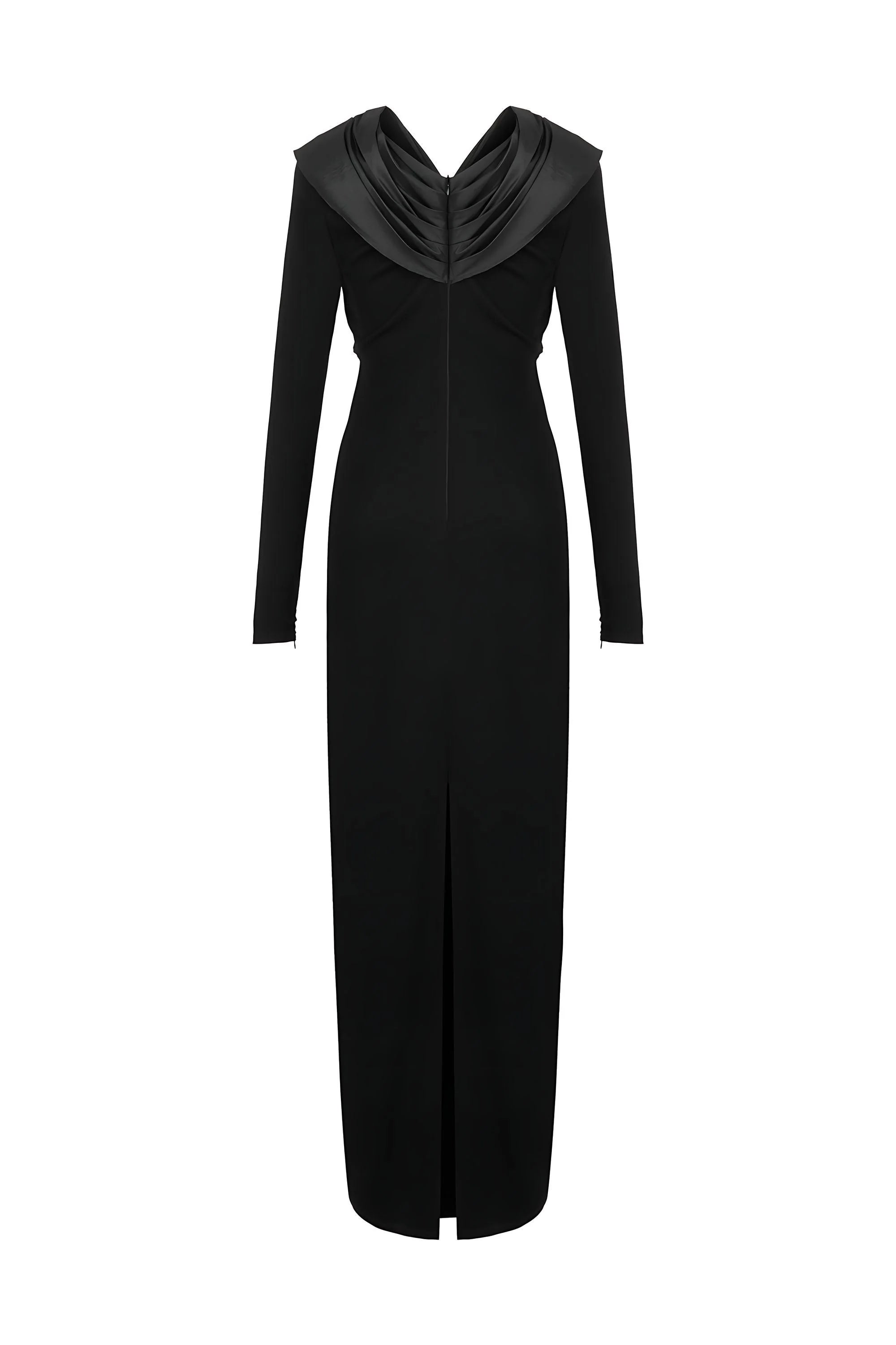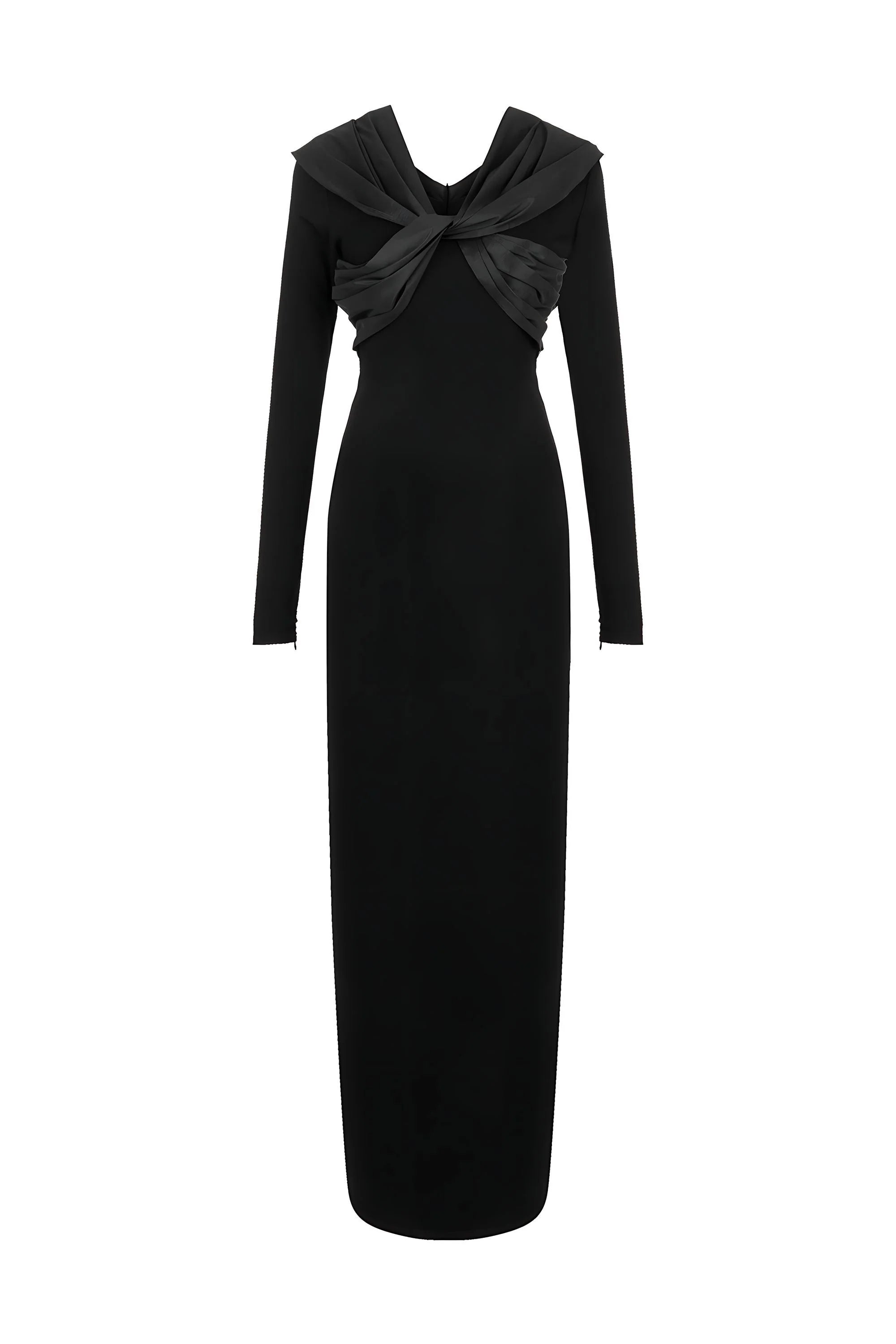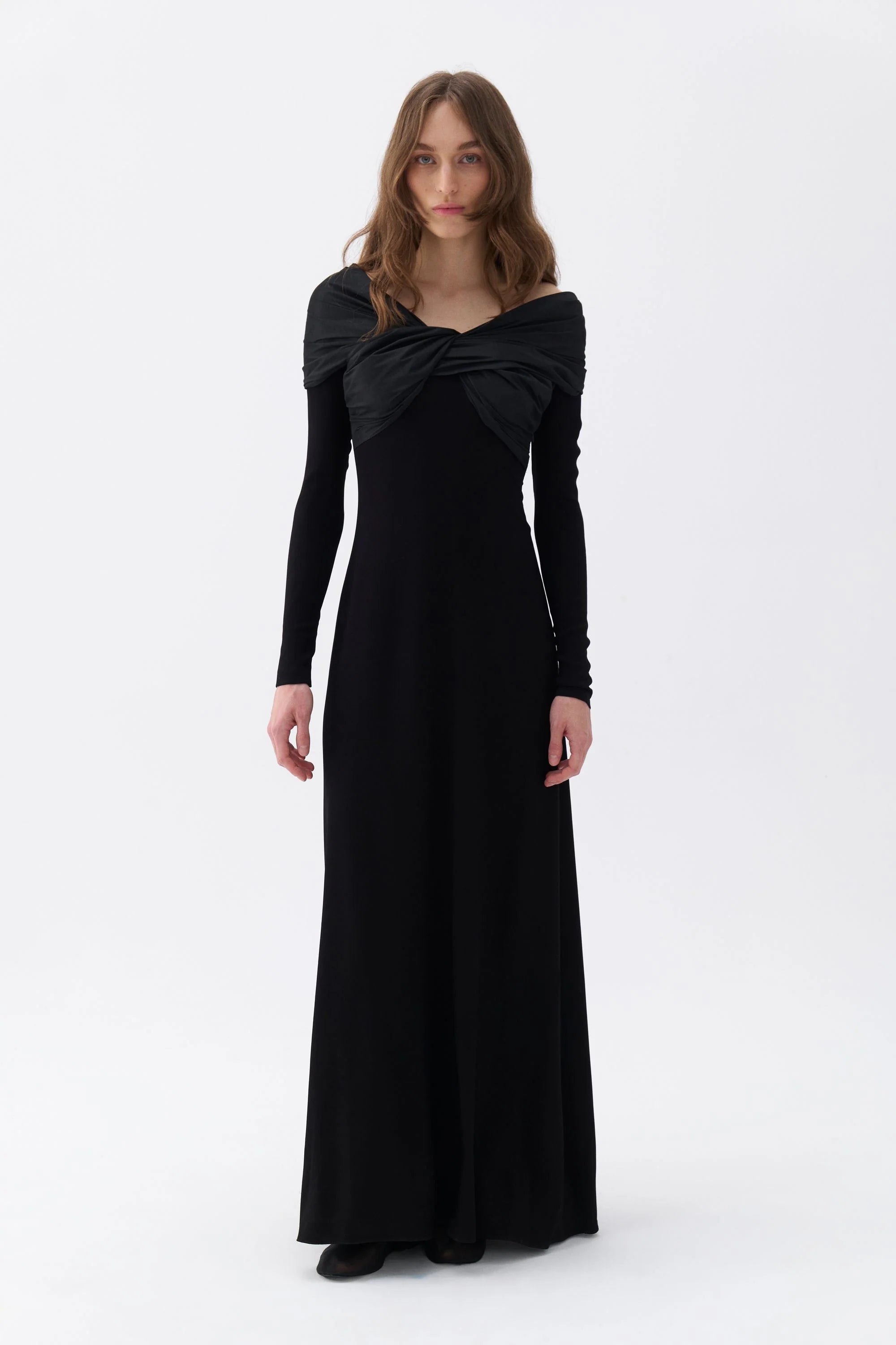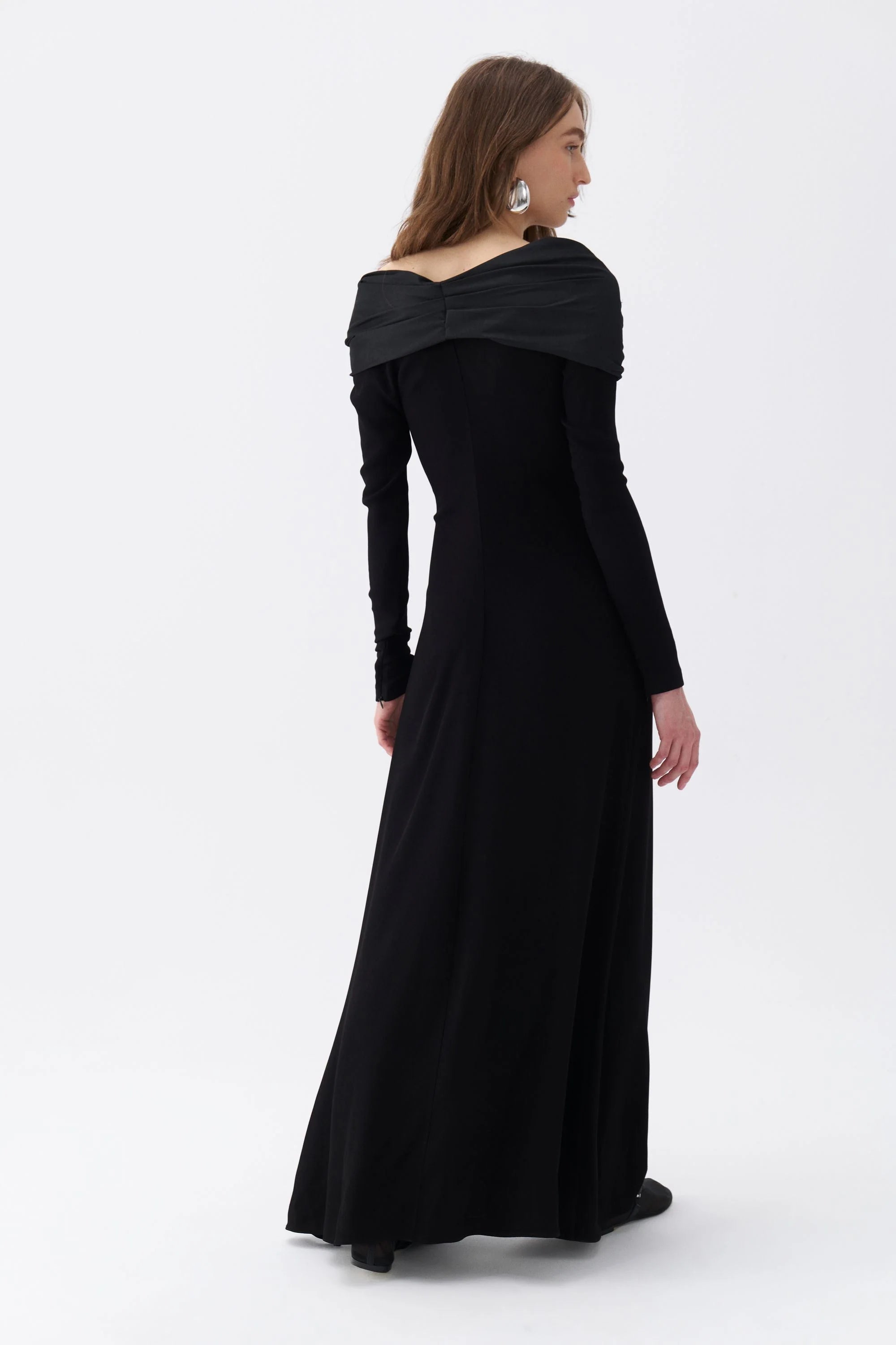An off-the-shoulder neckline lends a flirtatious touch to this long dress with a knotted collar and a beautifully flared skirt. The dress features a skinny fit, is unlined, and is adorned with sleeves that have a hidden zipper design. It also boasts a concealed zipper closure at the back, open shoulders, and lacks pockets.