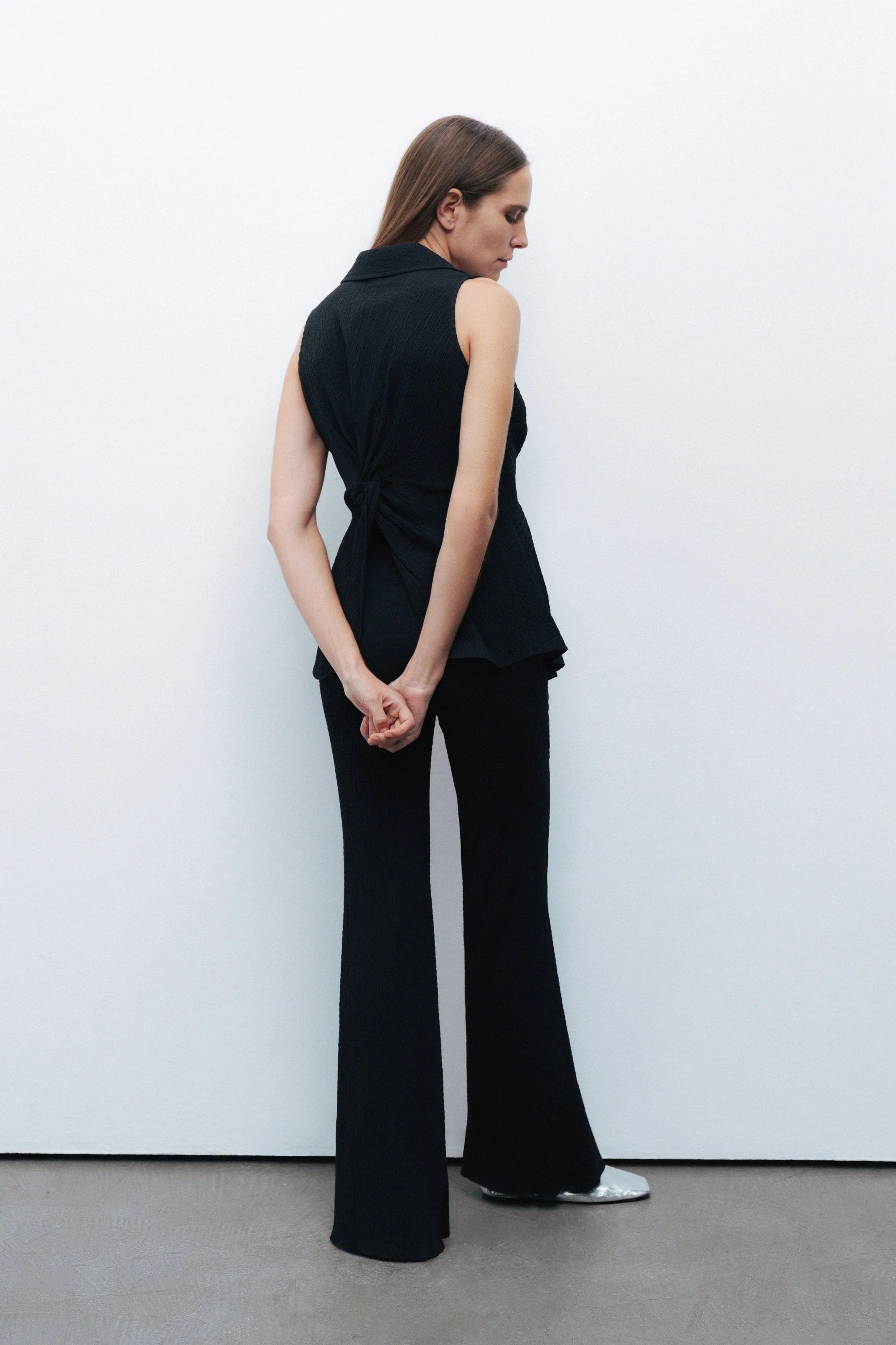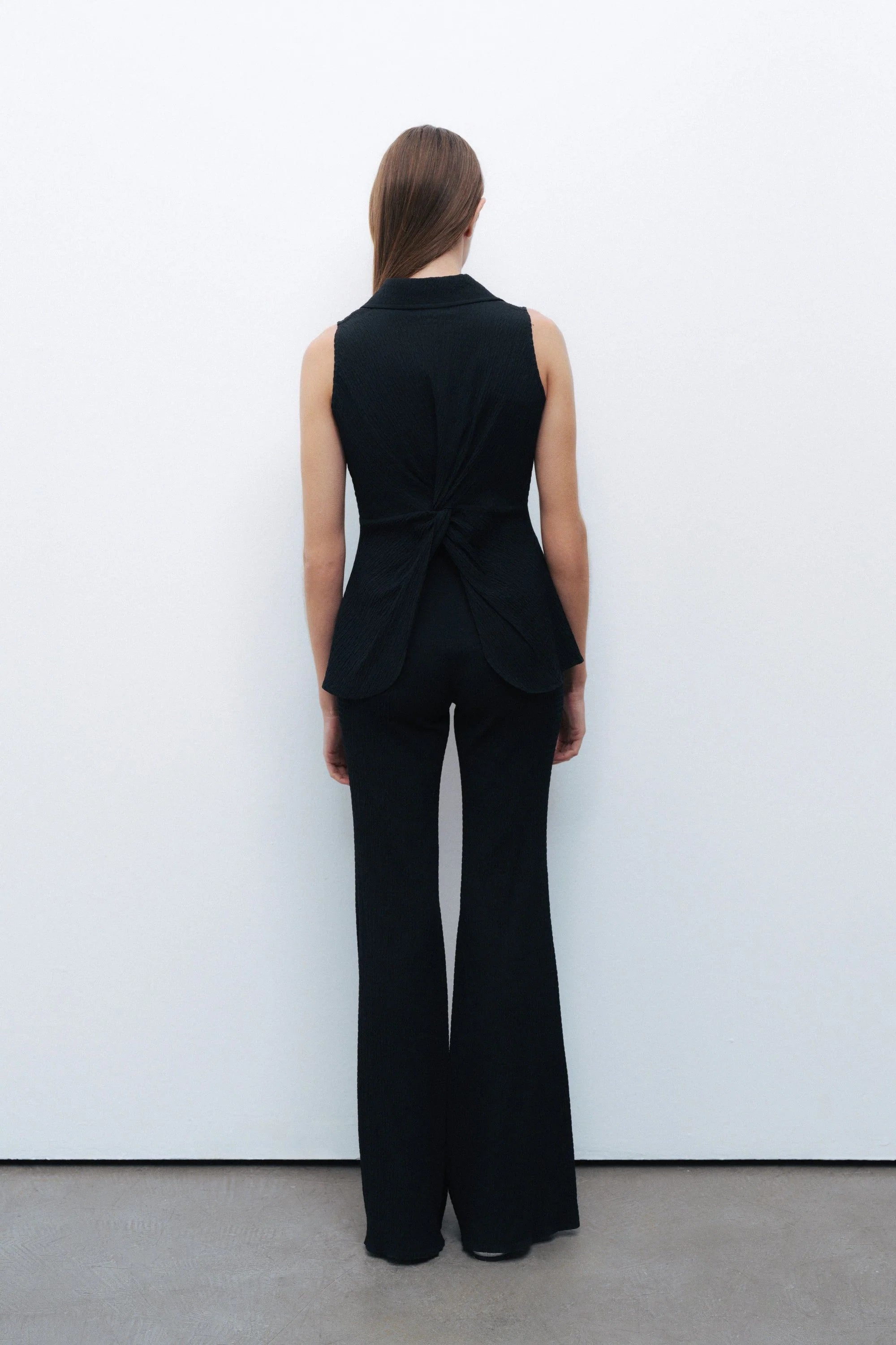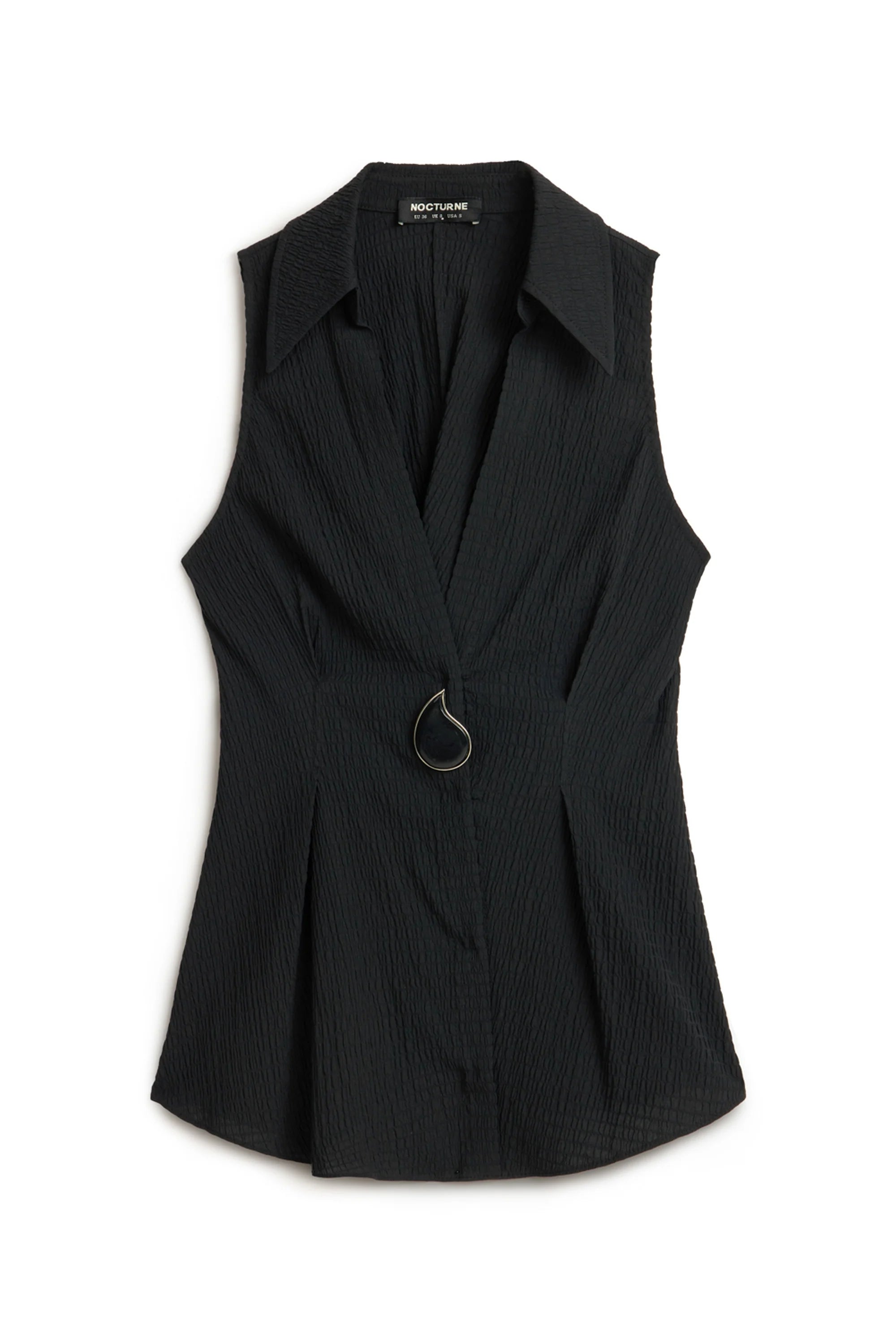 A sophisticated blend of elegance and modern design, this slim-fit blouse offers a true-to-size silhouette with a refined V-neckline. The shirt collar design adds a classic touch, while the twisted back detail enhances its contemporary appeal. Featuring a snap-button front closure for a seamless look, this blouse is finished with a teardrop-shaped accessory detail, making it a standout piece for chic styling. Fully lined for comfort and structure.