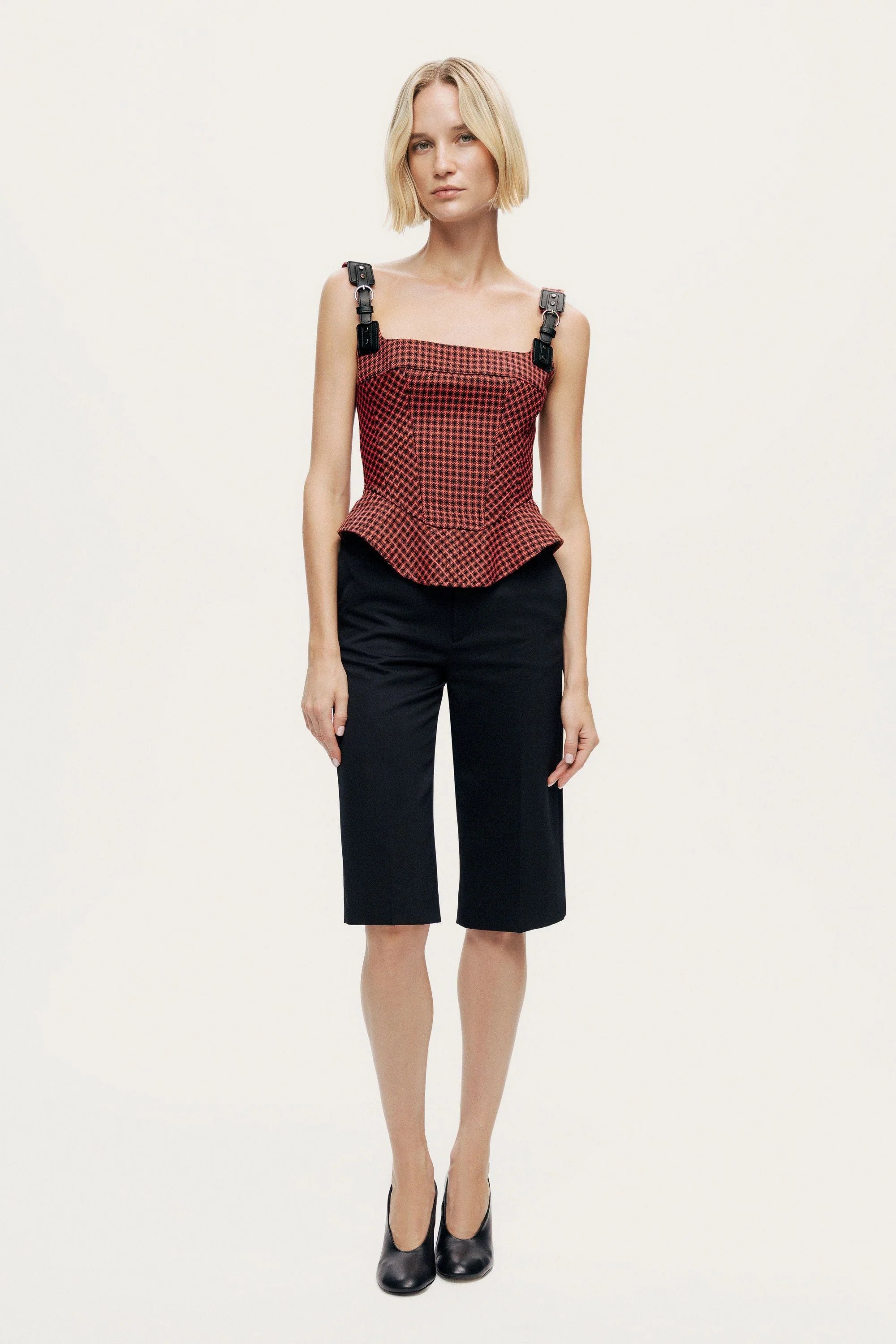A modern interpretation of classic tailoring, this corset-inspired top is crafted from woven check fabric in a slim, structured fit. Featuring a square neckline and adjustable buckle strap detail, it sculpts the waist before flaring into a subtle peplum hem. Effortlessly blending edge and elegance, it pairs perfectly with tailored trousers or matching plaid separates for a statement look.