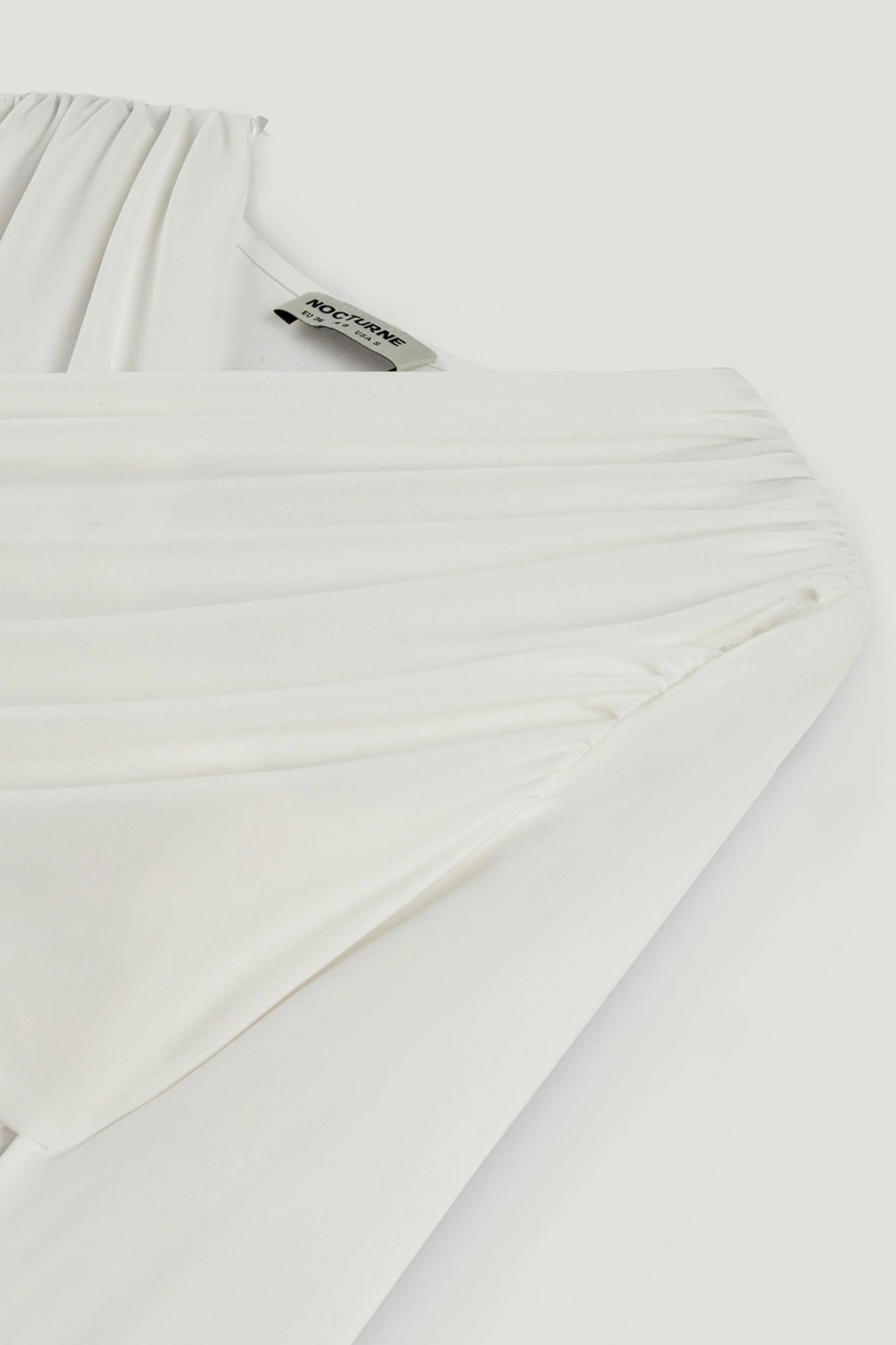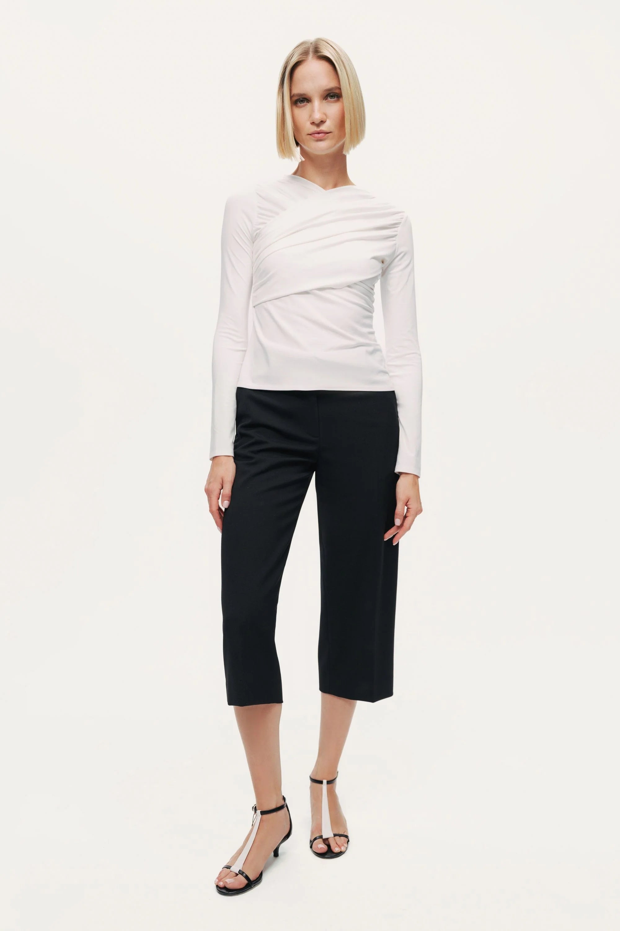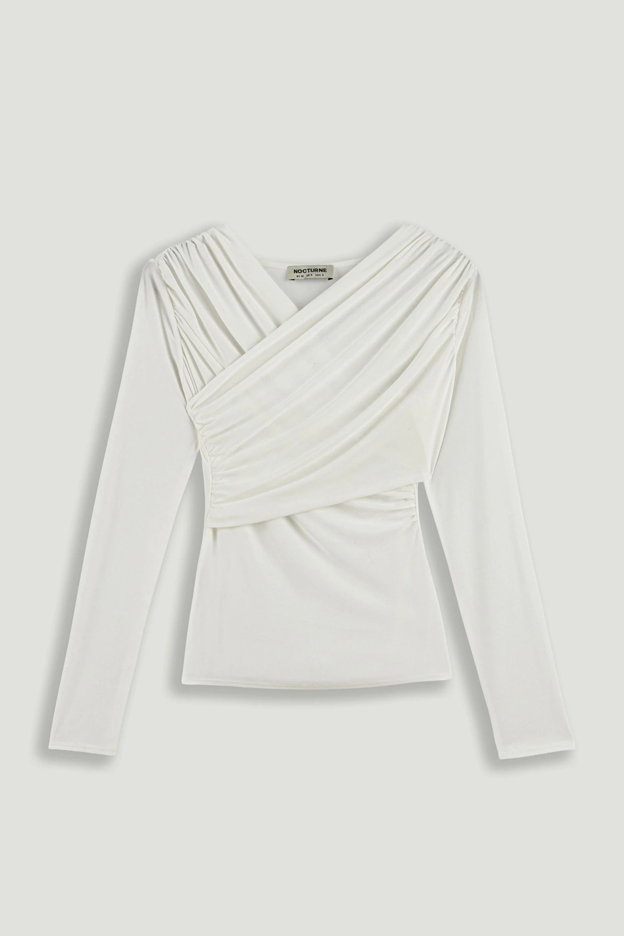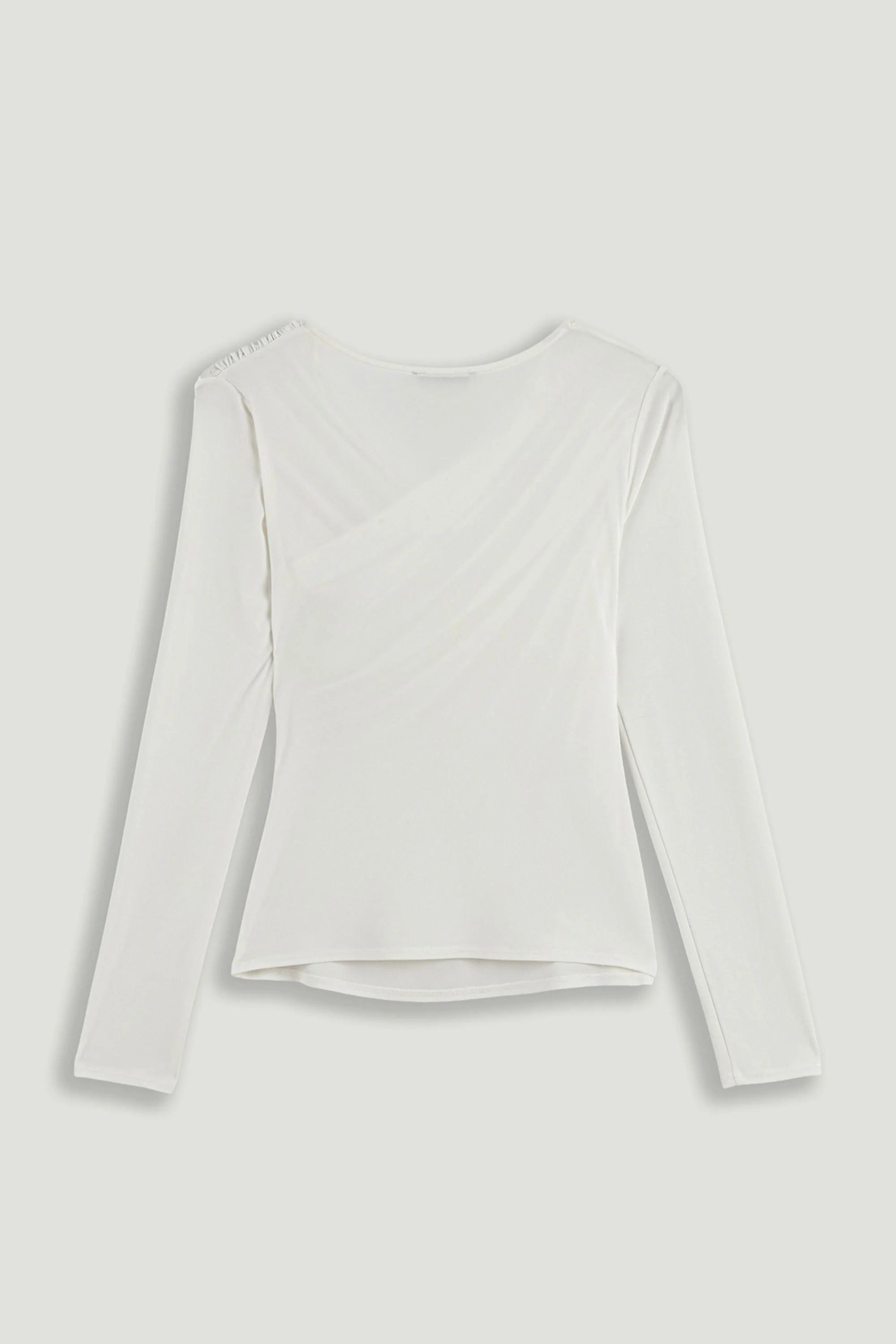 Designed for effortless sophistication, this slim-fit top is crafted from soft stretch fabric that flatters the figure. Featuring a round neckline and long sleeves, it stands out with an asymmetric draped front that adds depth and movement to the silhouette. Finished with a straight hem, it’s the perfect elevated essential for both sleek office looks and polished evening styling.