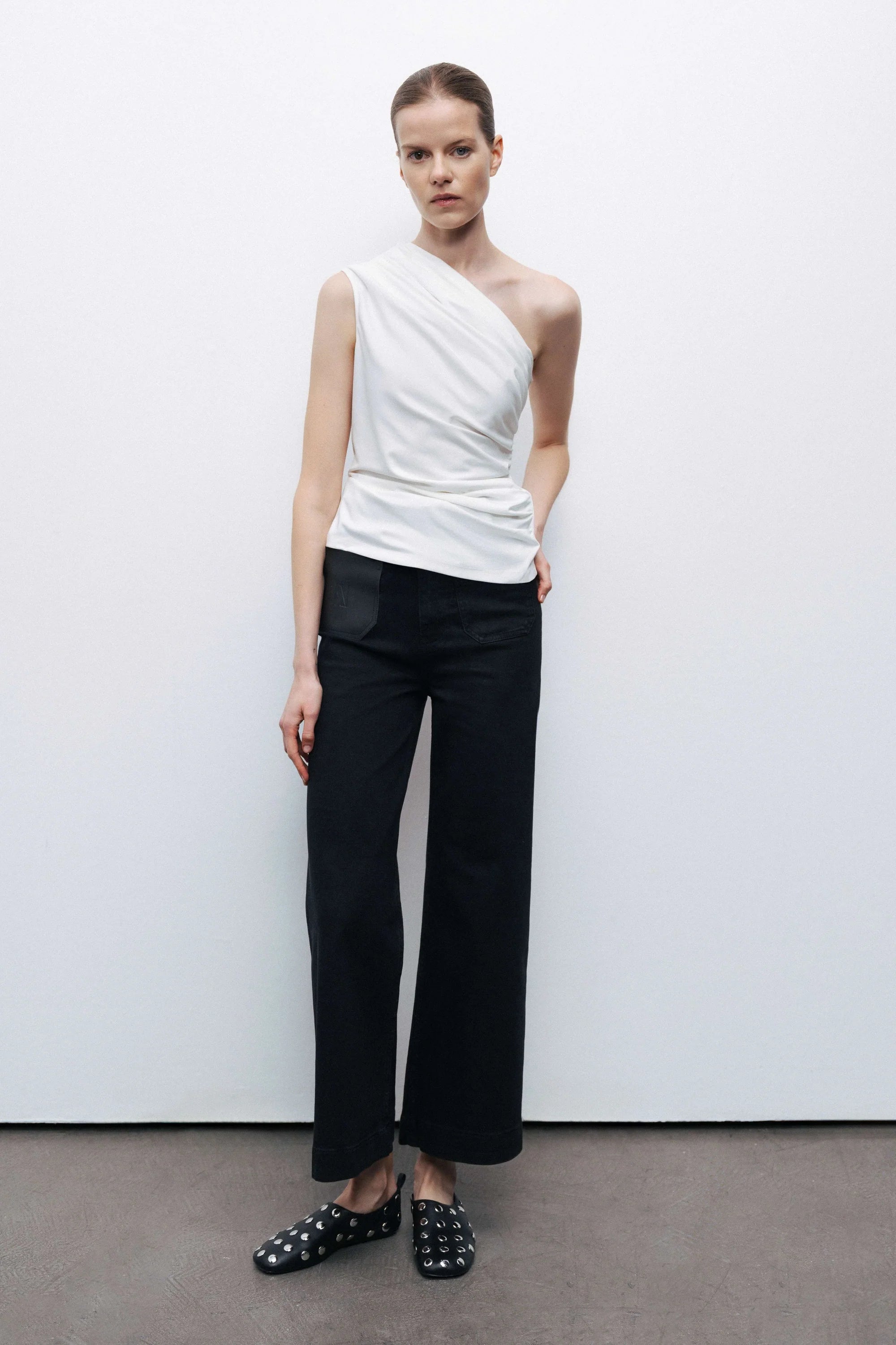 A modern and elegant statement piece, this slim-fit blouse offers a true-to-size silhouette with a chic asymmetric neckline. Designed with a one-shoulder cut, it exudes effortless sophistication. The smocked detailing adds texture and a flattering fit, while the unlined knitted fabric ensures lightweight comfort. Perfect for both casual and elevated styling, this blouse blends contemporary flair with timeless elegance.