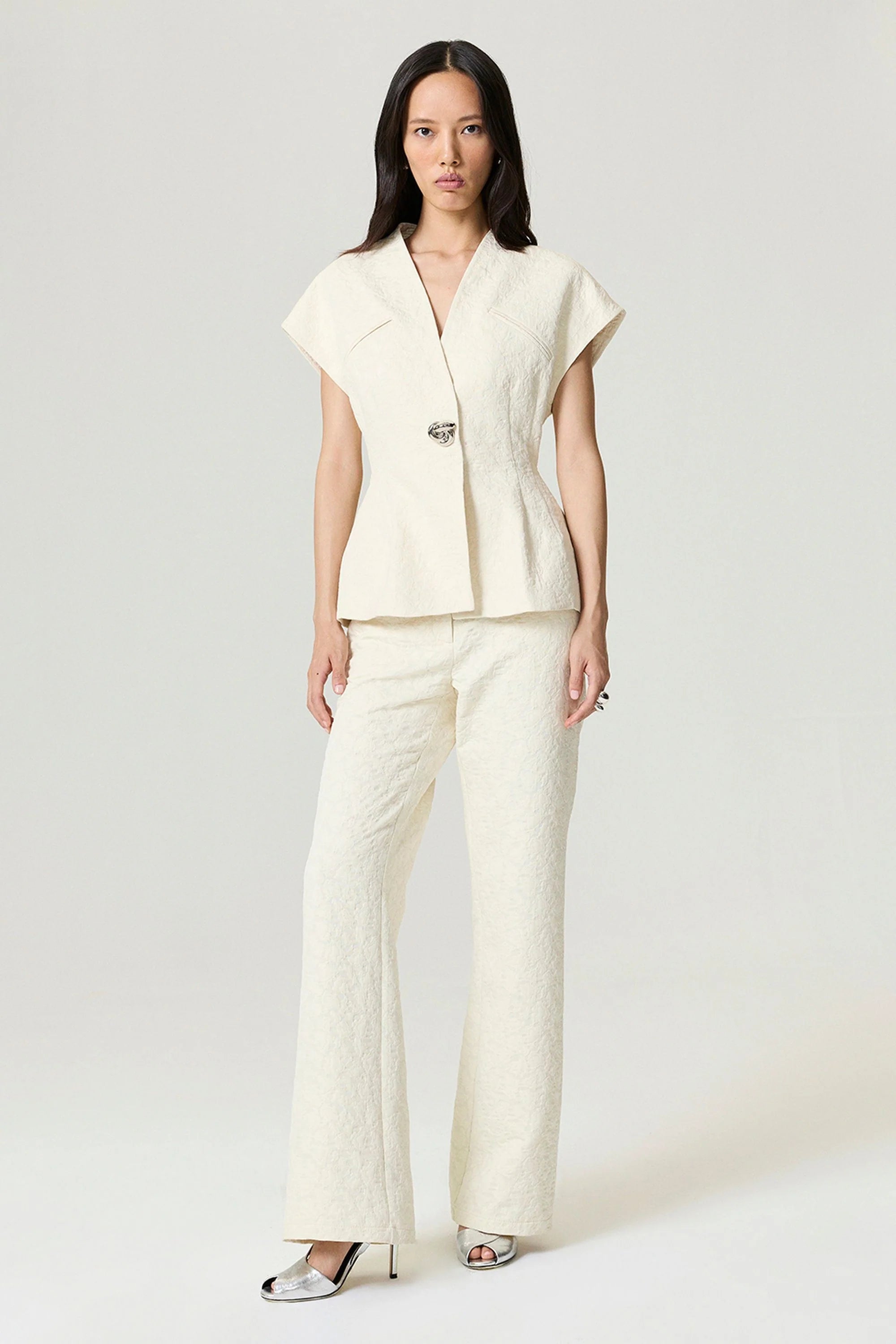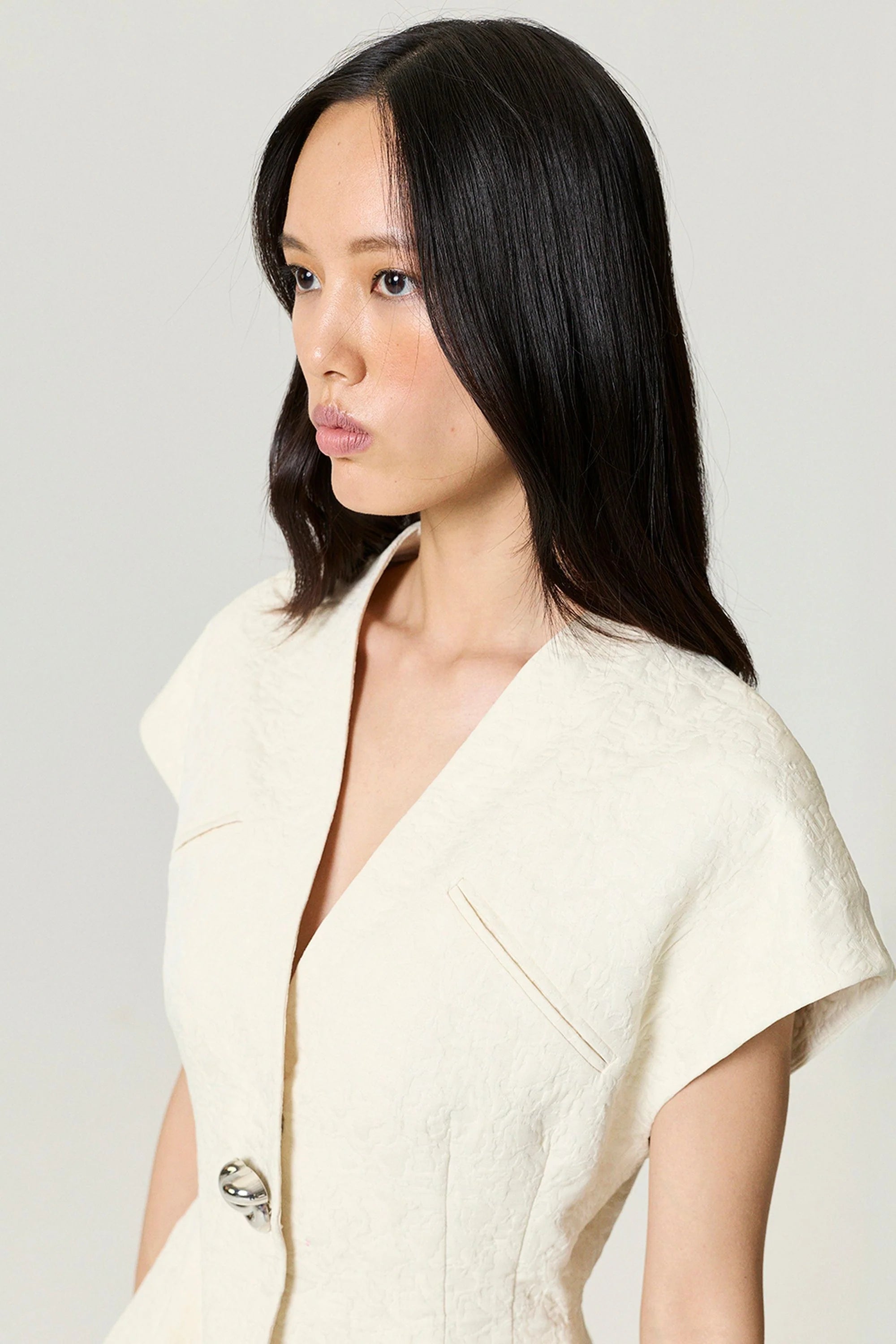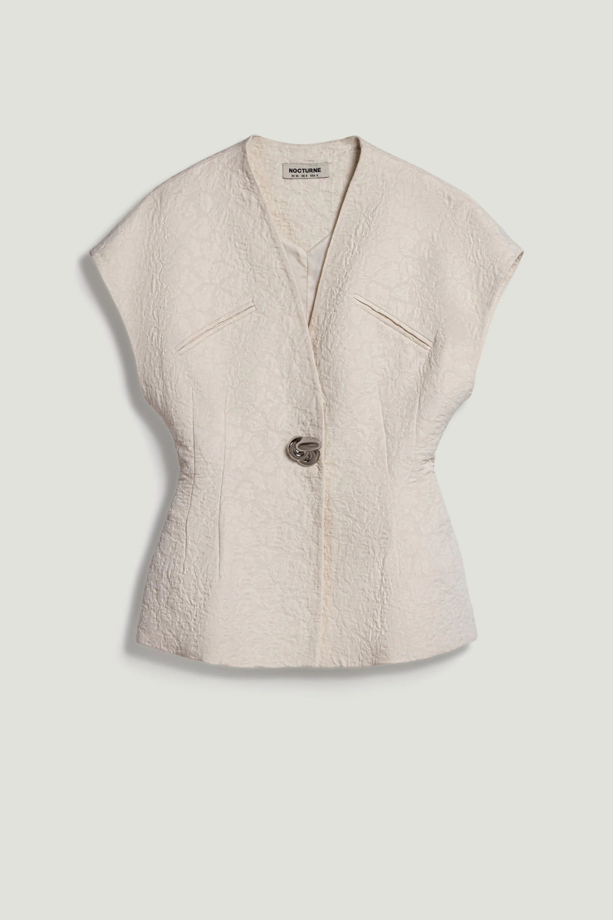 Chic and versatile, this accessory detailed vest is tailored from woven fabric in a regular fit with full lining for a polished finish. Designed with a V-neckline, snap-button closure, and faux welt pockets, it features a sleeveless silhouette with dropped shoulders and subtle boning for structure. The accessory detailing elevates the design, making it a refined layering piece for office wear, evening looks, or modern everyday styling.