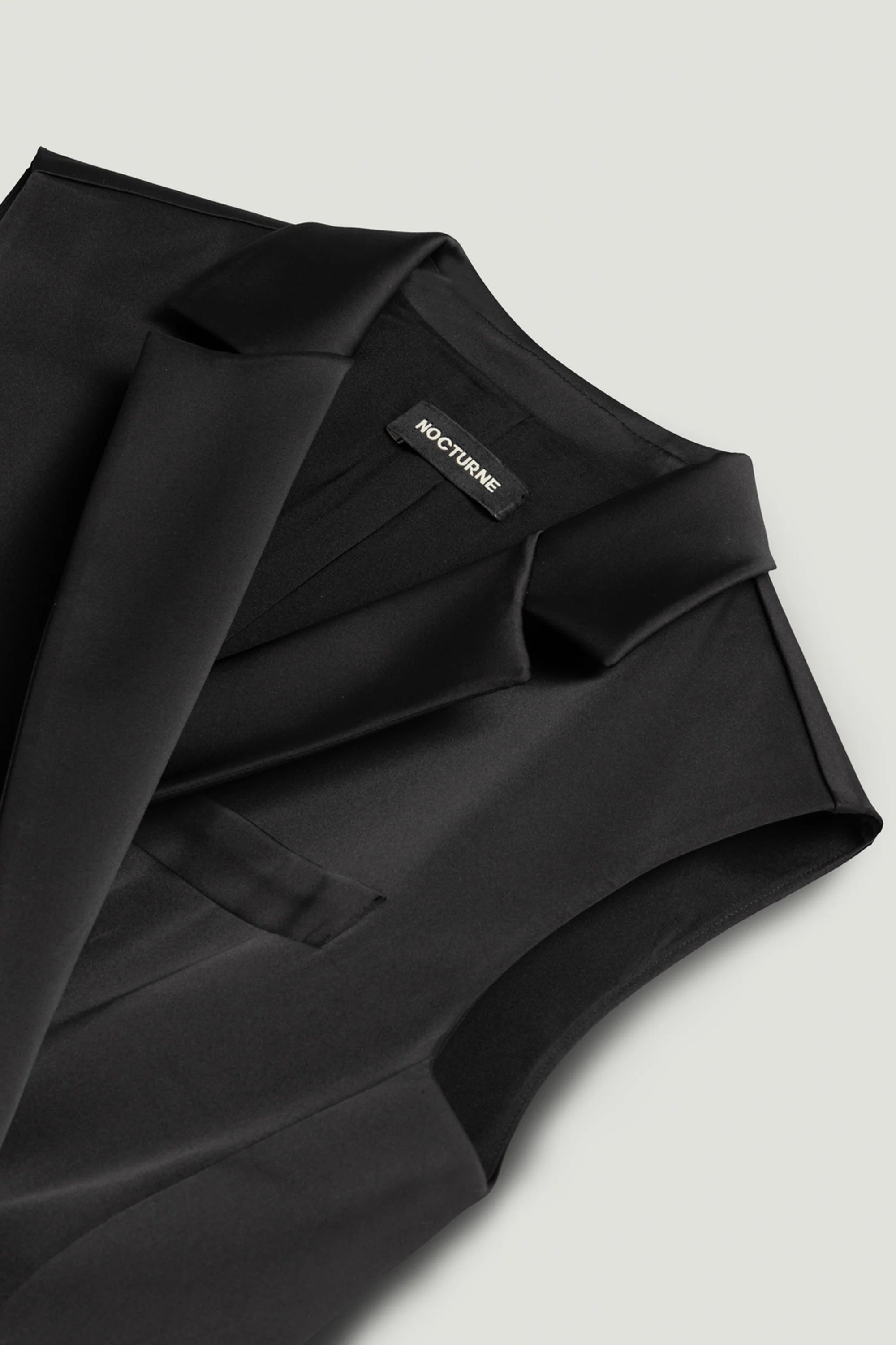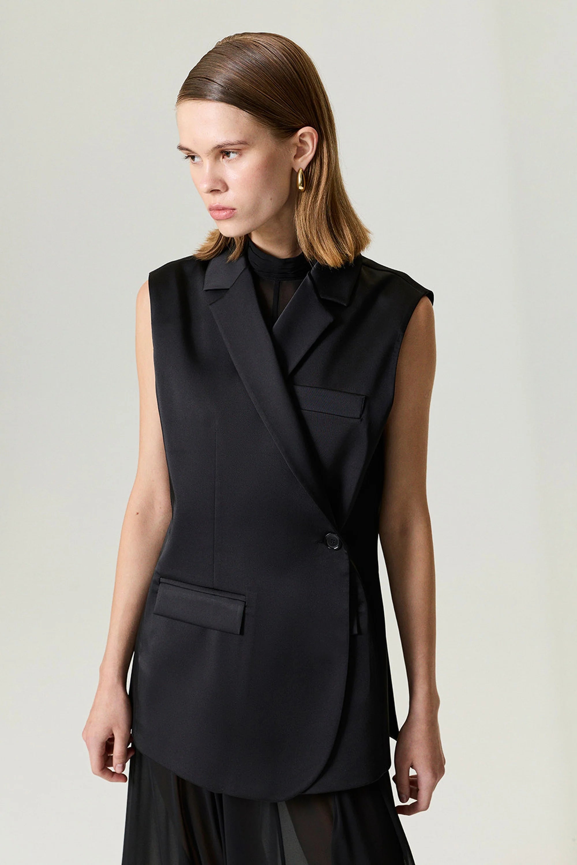 This tailored longline vest is a modern wardrobe essential, cut in a regular fit with a structured silhouette. Crafted from premium woven fabric, it features a sharp notched lapel, asymmetric front button closure, and both flap and welt pockets for added polish. Sleeveless and versatile, it layers effortlessly over blouses or knits, delivering sophistication with a contemporary edge — from boardroom chic to elevated casual.