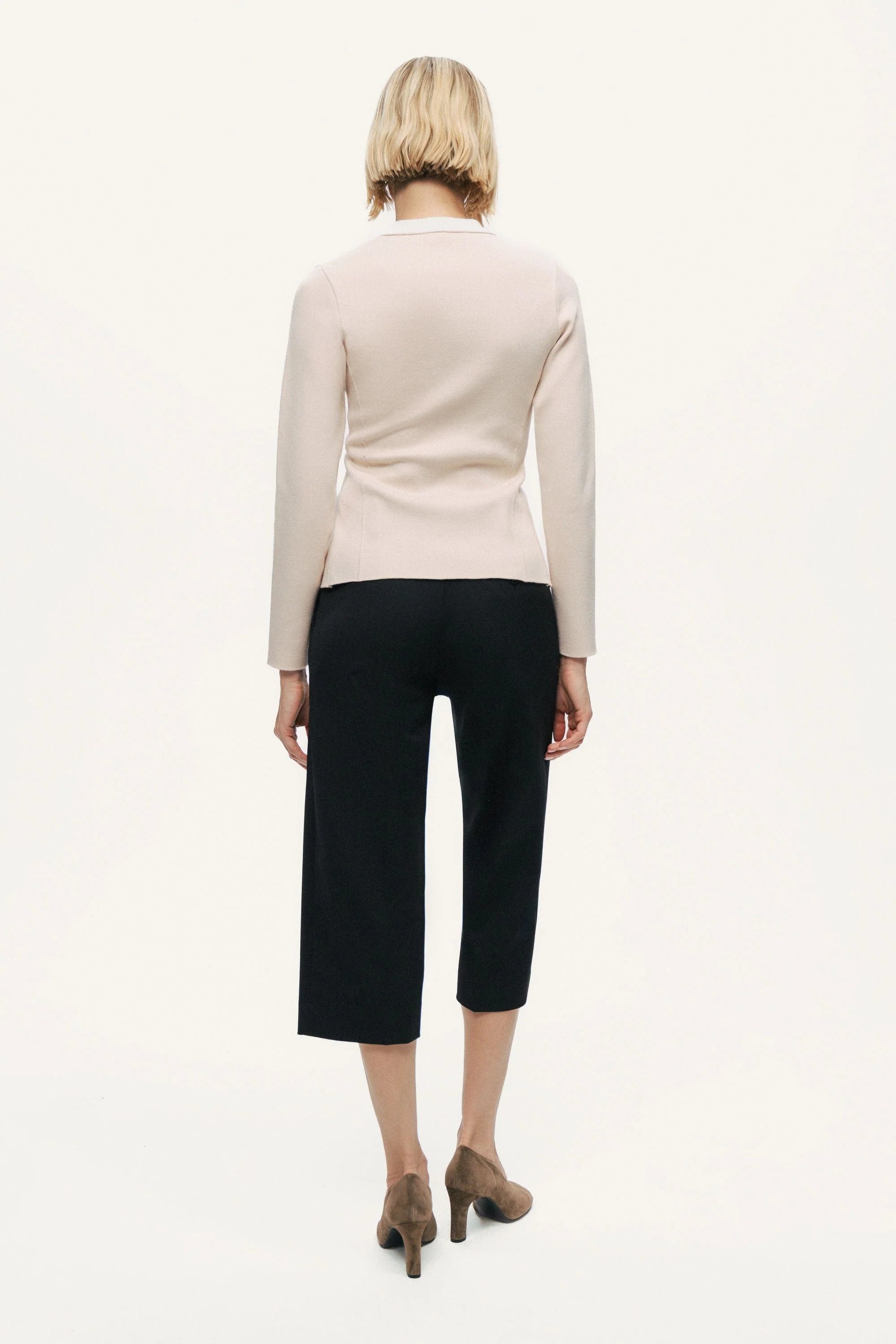 A sophisticated twist on classic knitwear. Crafted from mid-weight stretch knit, this slim-fit cardigan features a collared neckline and button-front closure, elevated by a striking asymmetric shoulder cape detail. Designed with a shaped waist and hip-length cut, it offers a refined silhouette that seamlessly balances structure and fluidity — perfect for layering over tailored trousers or sleek skirts.