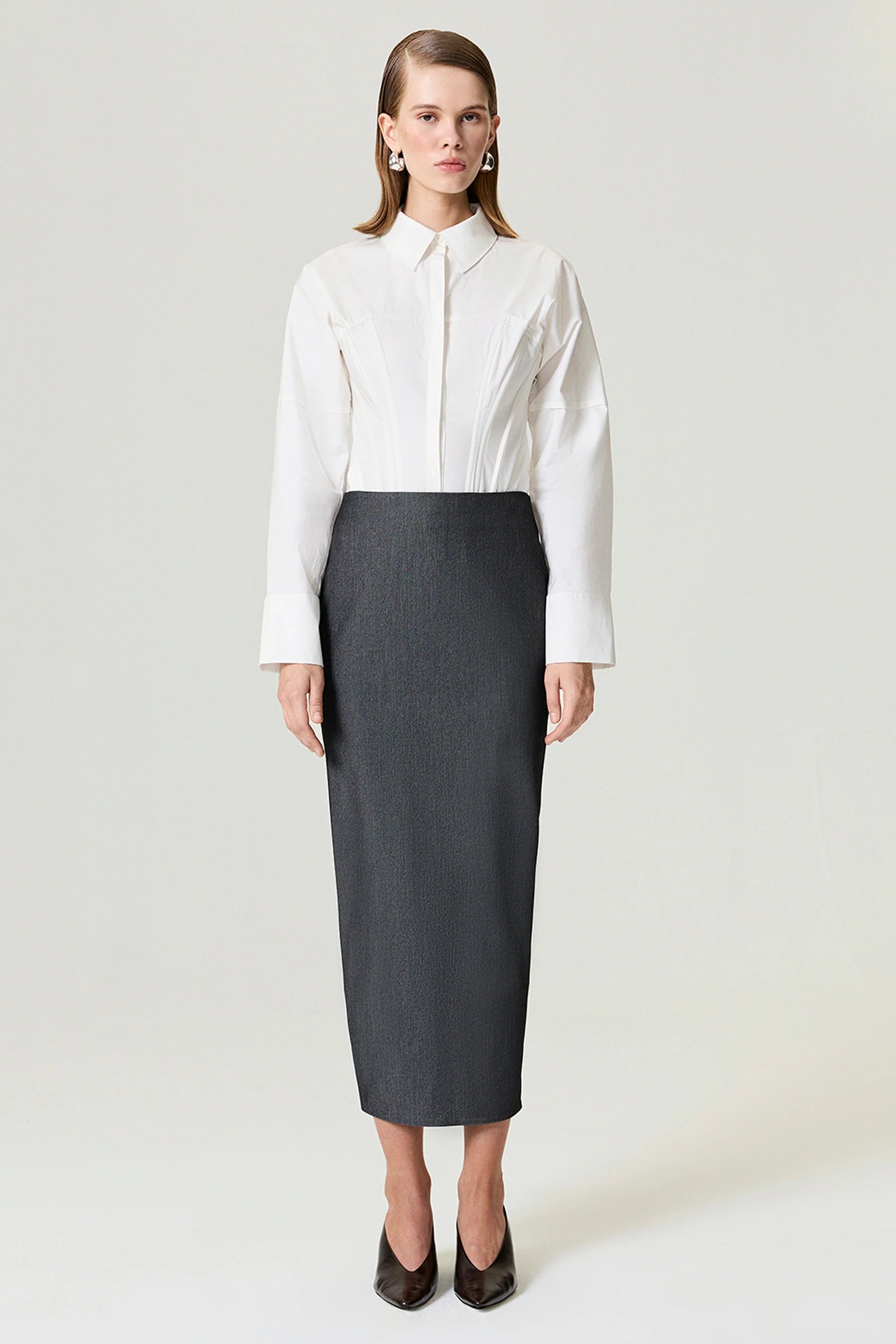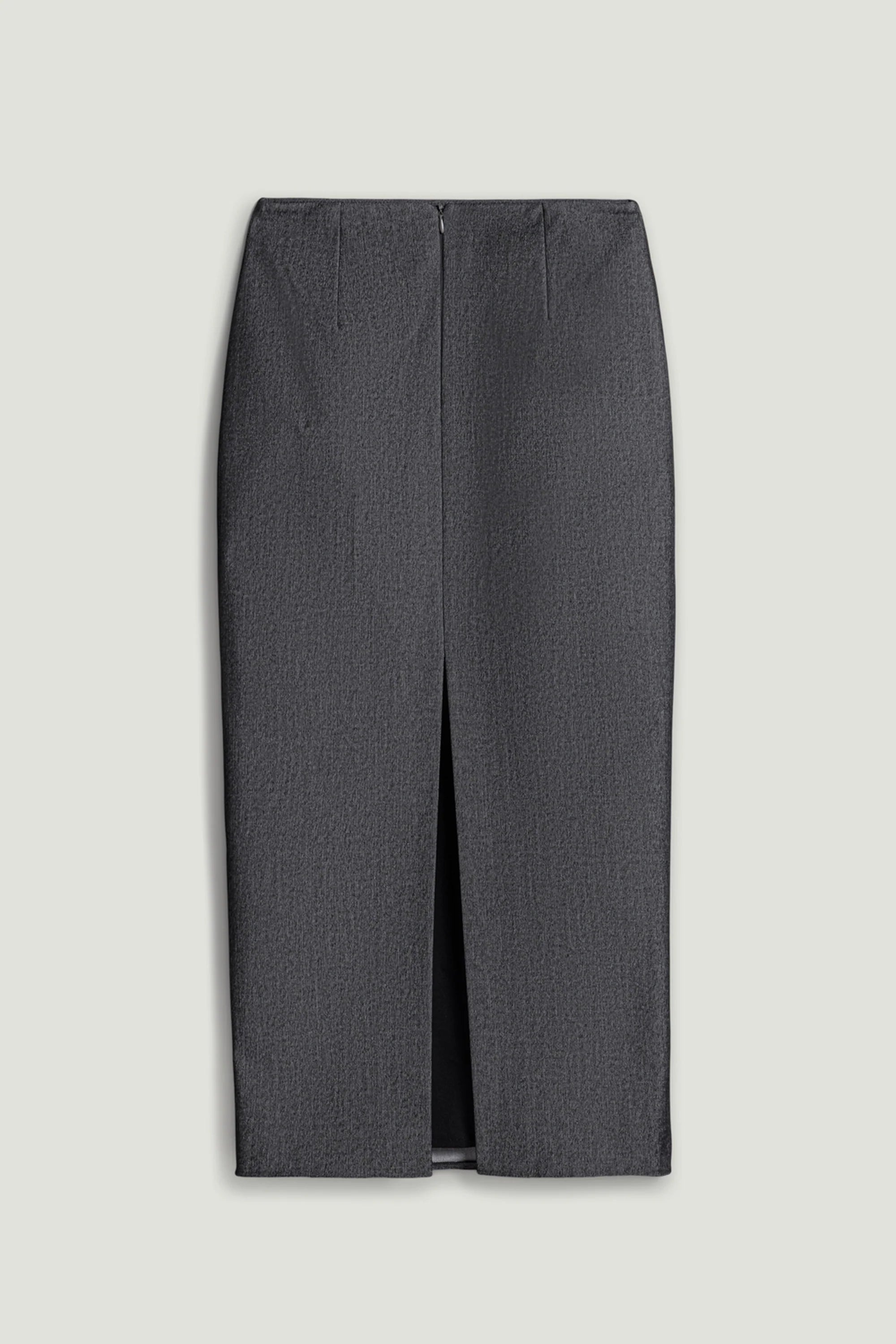 Effortlessly chic and tailored to perfection, this maxi skirt with a back slit is a seasonal must-have. Designed with a regular fit and crafted from a structured woven fabric, it offers a polished silhouette while allowing ease of movement with its elegant slit at the back. Featuring a mid-rise waist, delicate concealed zipper, and a fully lined interior, this piece is the ultimate blend of sophistication and comfort. Pair it with a fitted blouse or a chunky knit to elevate your autumn-winter looks with timeless flair.