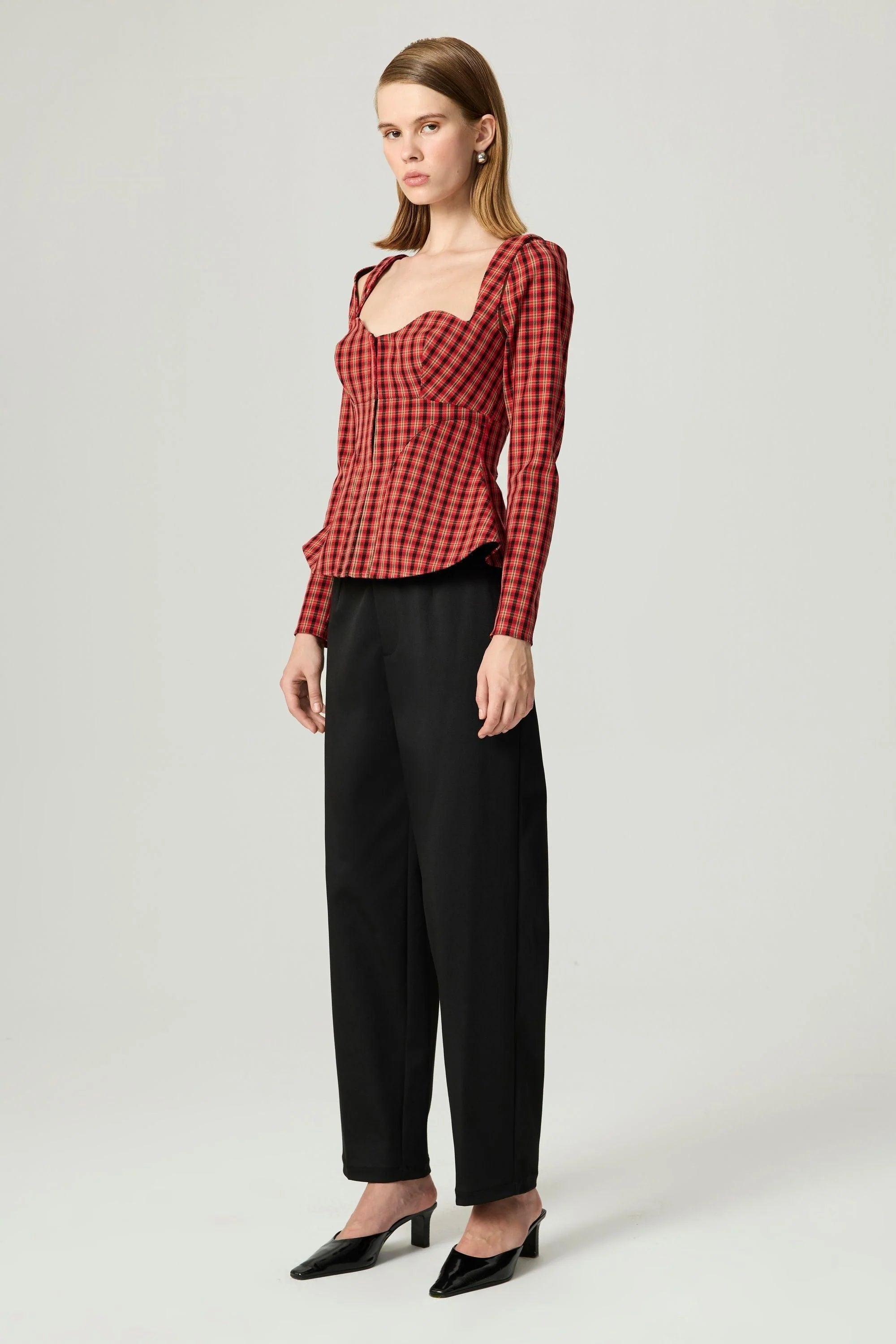 Structured and feminine, this corset-inspired top is crafted from woven check fabric in a slim, tailored fit. Designed with long sleeves and a sweetheart neckline featuring cut-out shoulder details, it’s finished with a front zip closure and a defined waist that flares into a subtle peplum hem. A modern statement piece that perfectly balances classic patterning with contemporary edge.