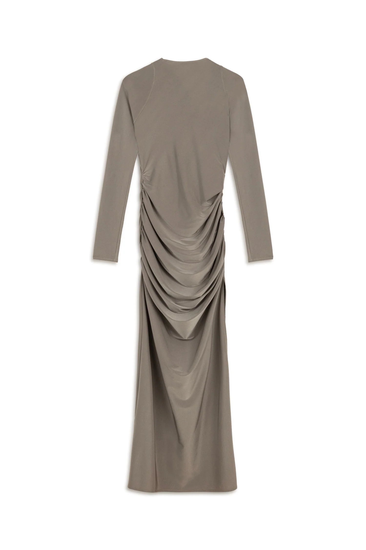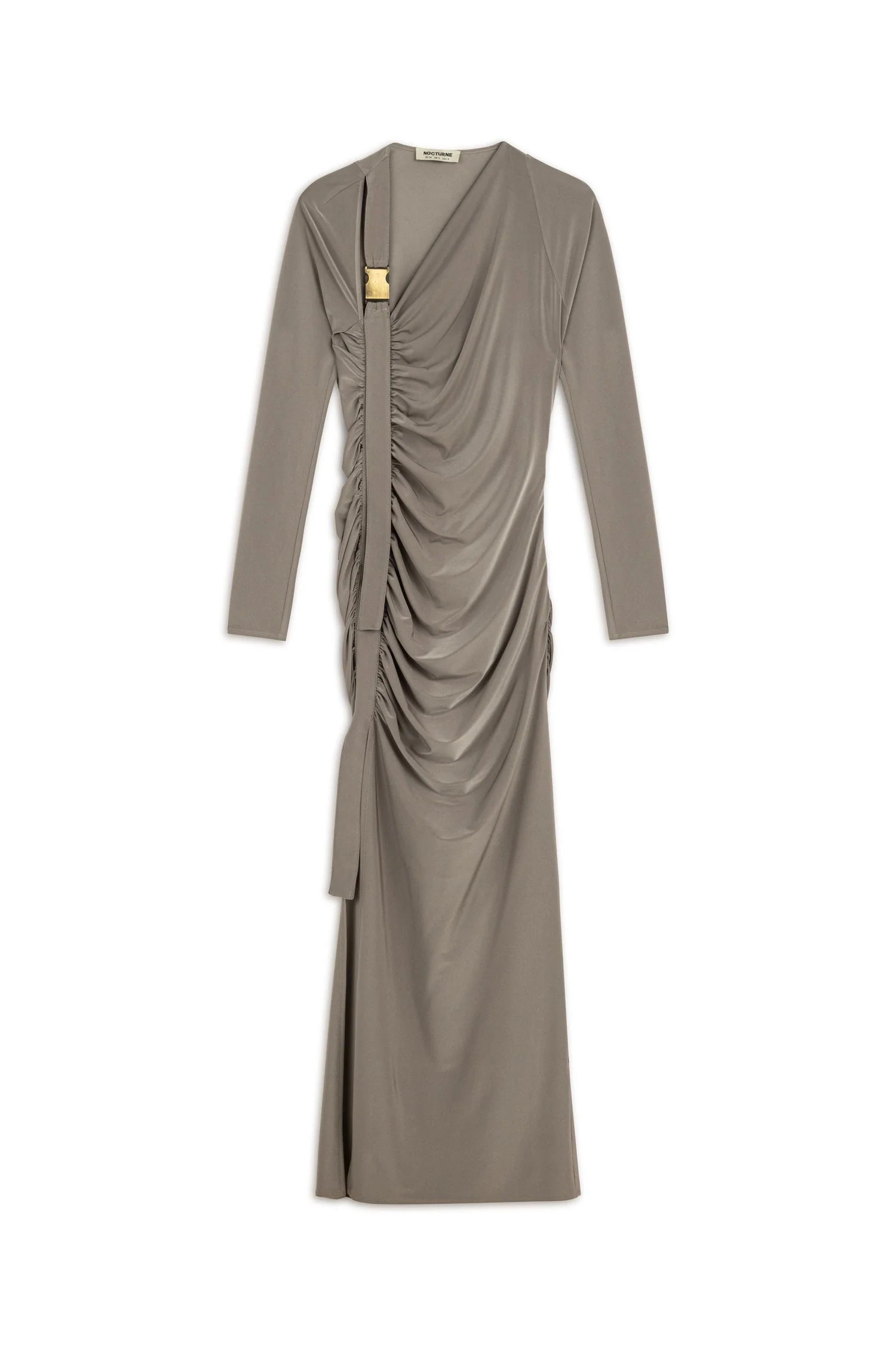 A bold yet elegant silhouette, this regular-fit maxi dressoffers a true-to-size shape with a striking asymmetric neckline. Designed without a zipper for a clean and fluid look, it features a side slit and draped detailing for graceful movement. The standout element is the removable metal buckle, adding a modern, customizable touch. Finished with long sleeves and crafted from a garnish-free, unlined fabric, this piece is perfect for sleek, statement-making occasions.