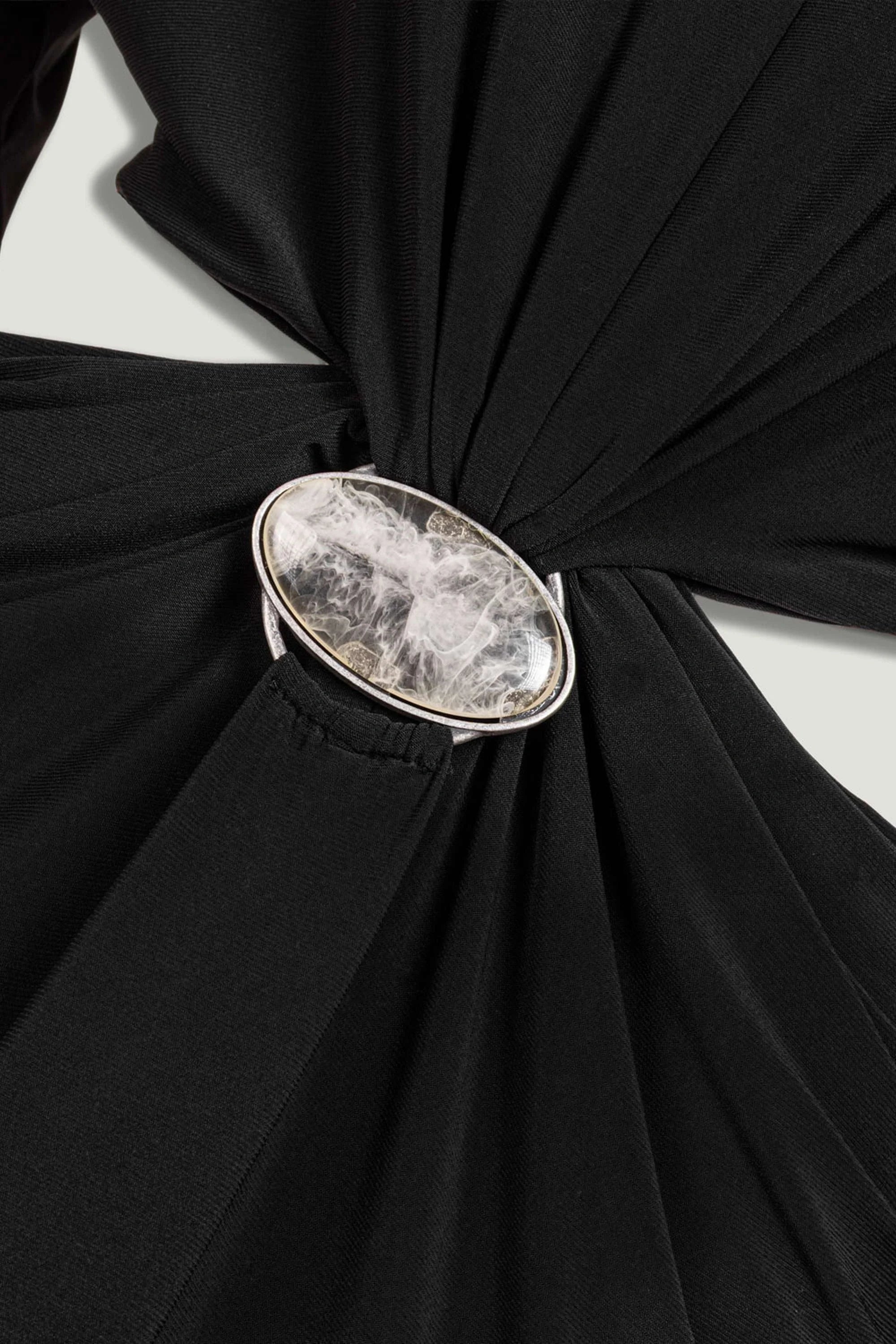 A sleek one-shoulder maxi dress with a fluid drape and a sculpted waist, defined by a subtle metal accent. Designed to highlight the silhouette with a modern, confident edge—perfect for evening occasions.