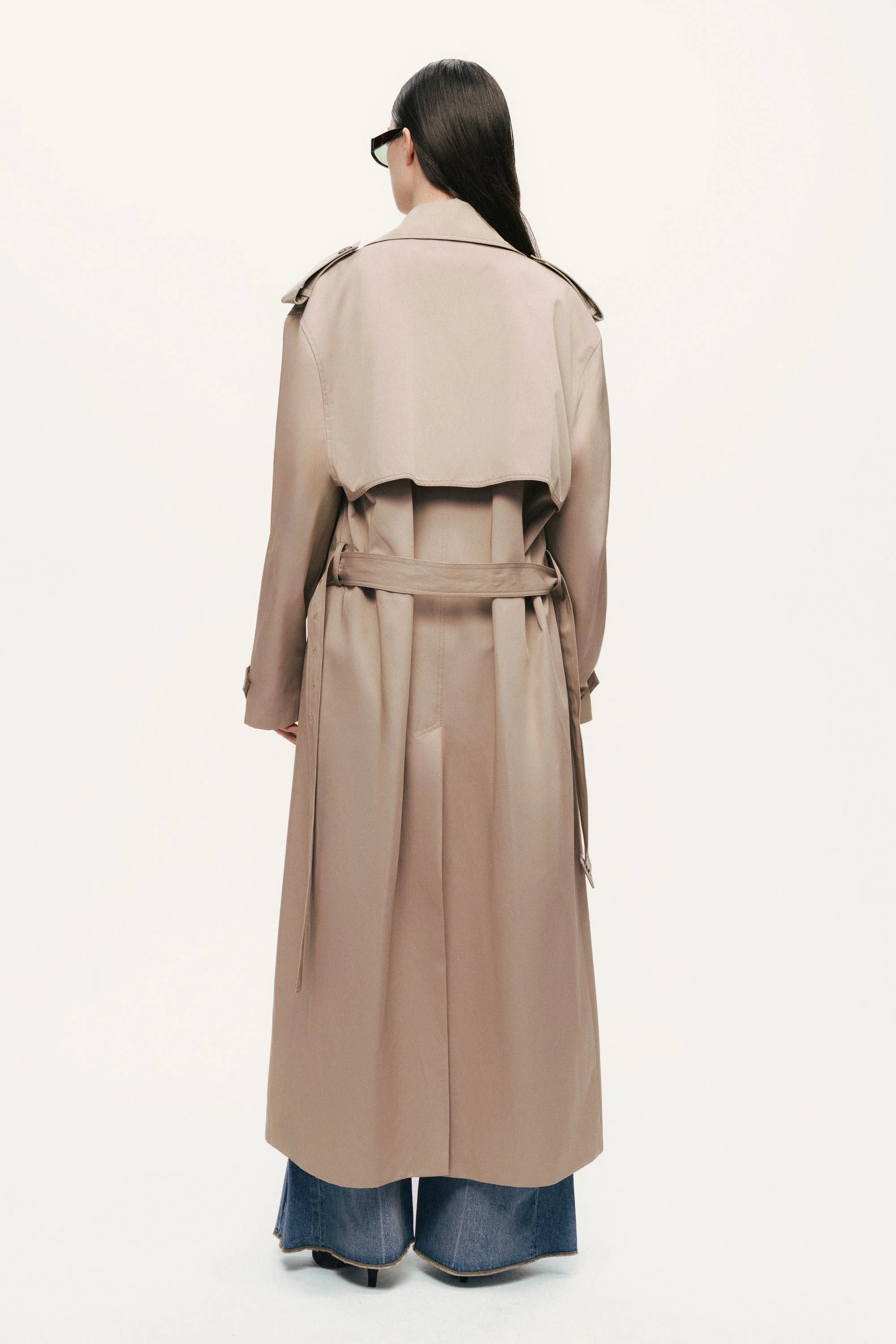 A modern take on a timeless classic, this ankle-length trench coat features an oversized silhouette with structured wide notch lapels and a double-breasted button front. Designed with traditional details like shoulder epaulettes, storm flaps, and adjustable cuff tabs, it also includes a removable waist belt to cinch the shape. Finished with side welt pockets, a back vent for movement, and full lining for comfort, it’s a refined outerwear staple that blends elegance with effortless utility.