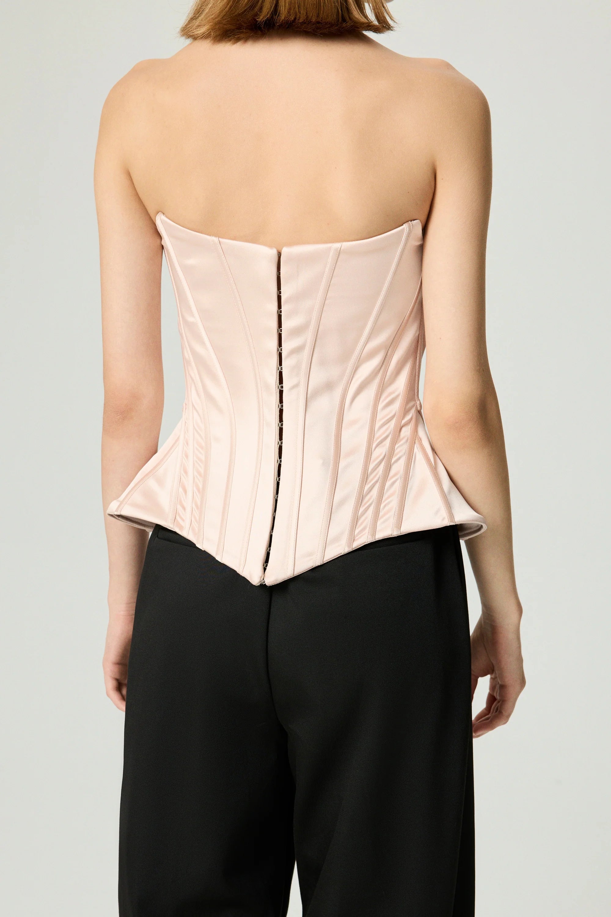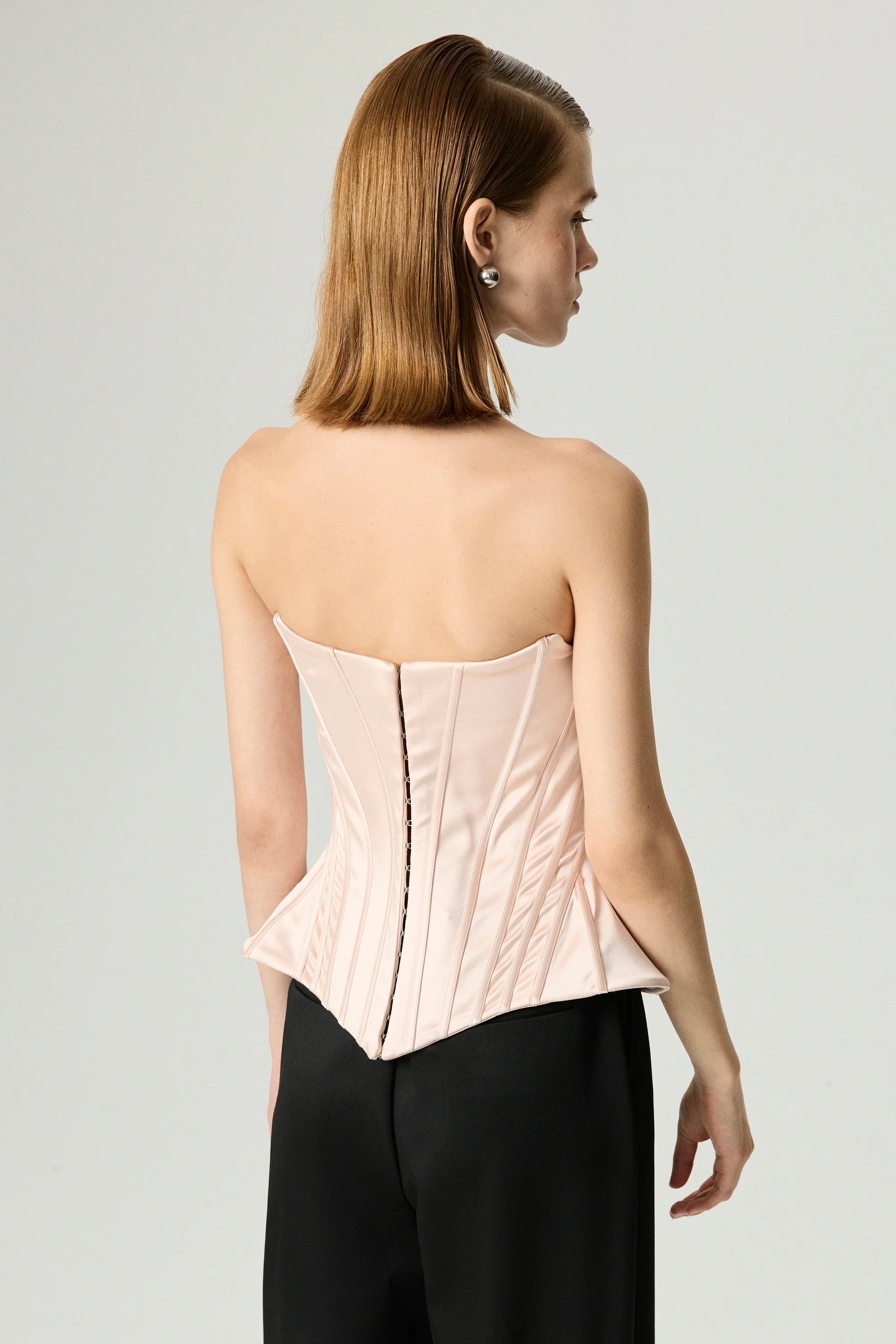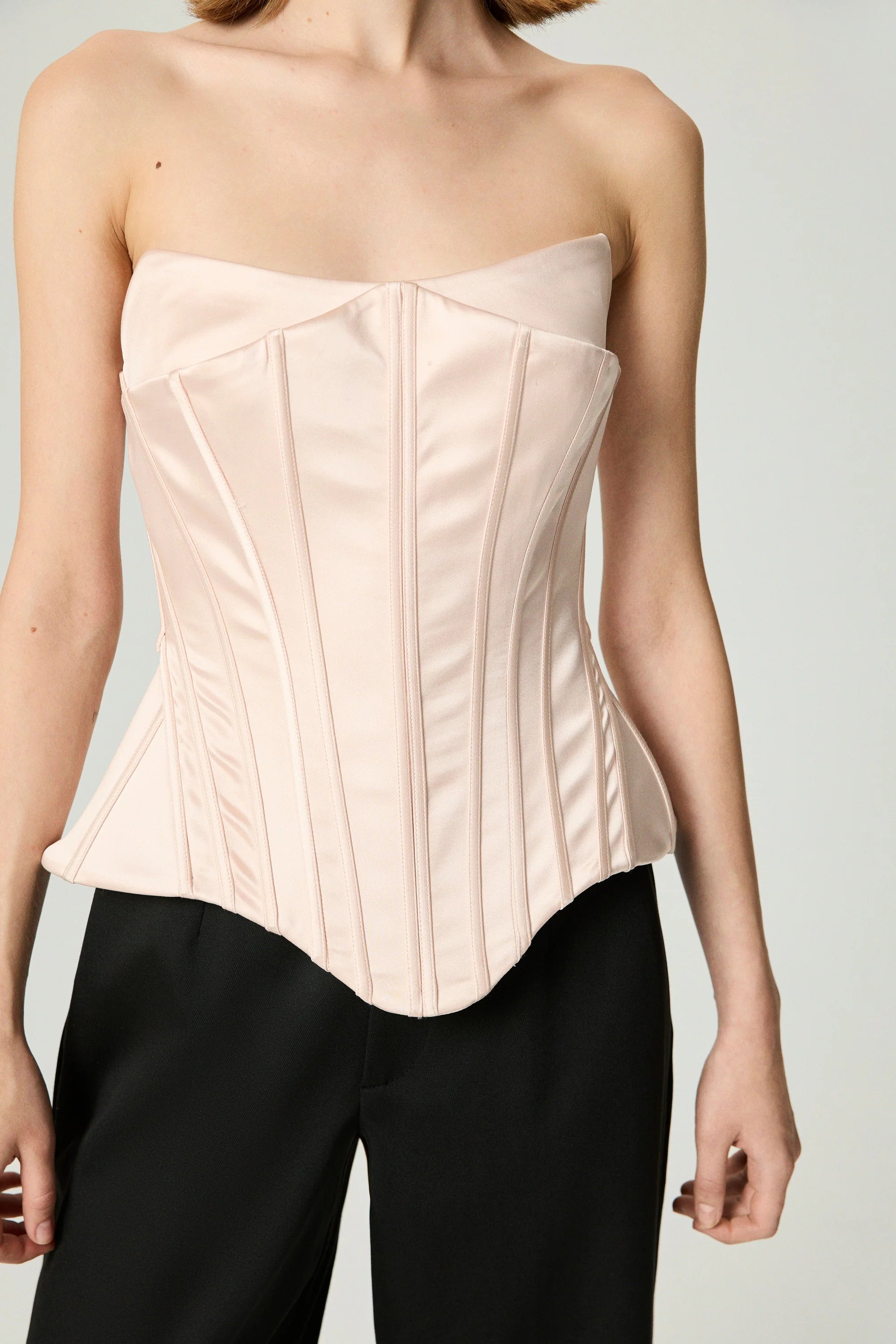 Crafted from lustrous satin, this strapless corset top features a contoured sweetheart neckline and sculpted boning that...