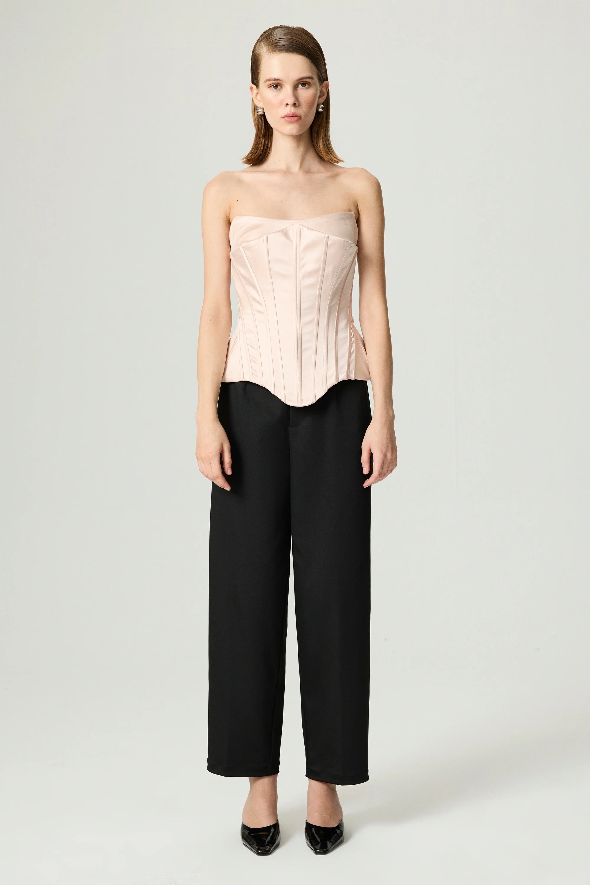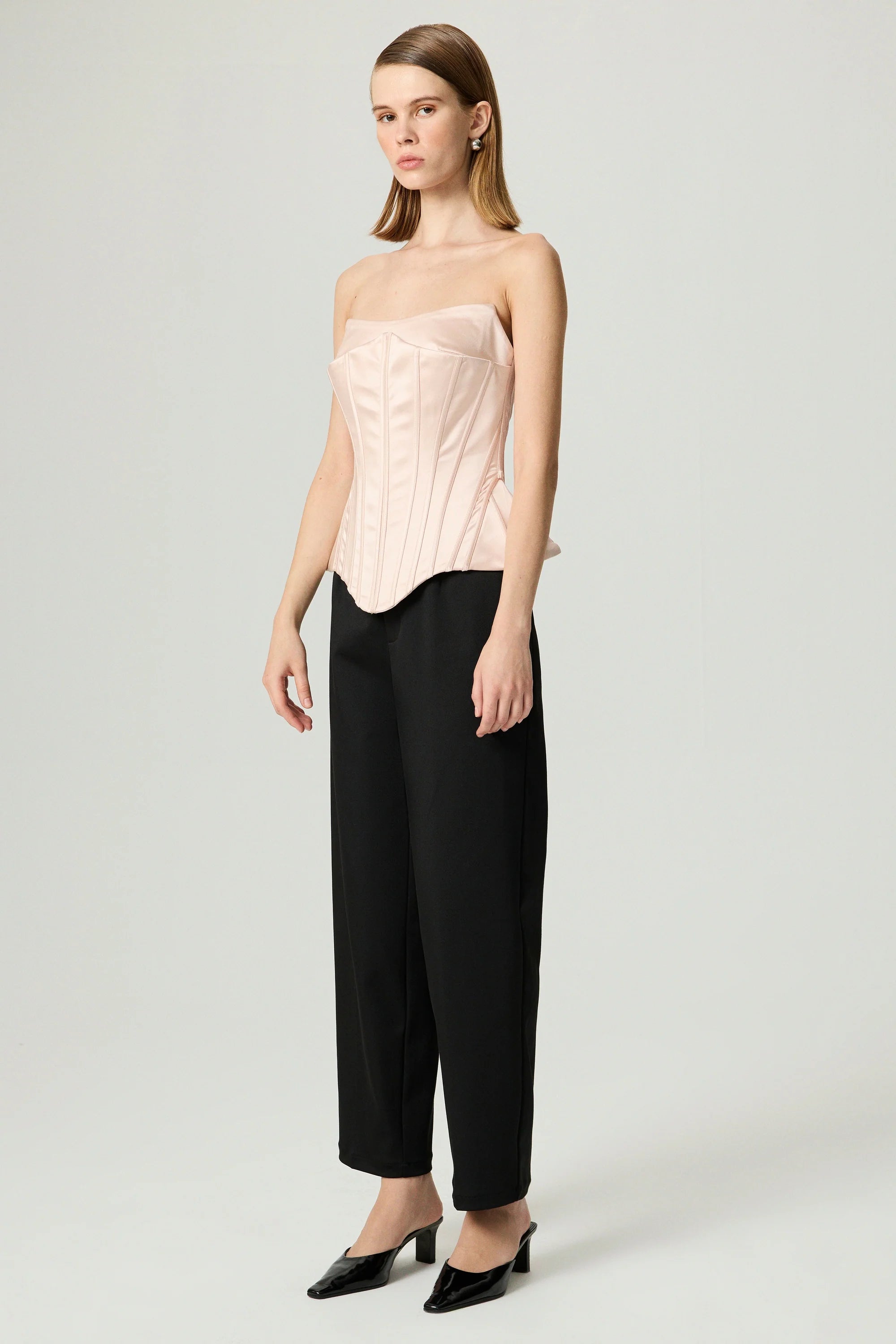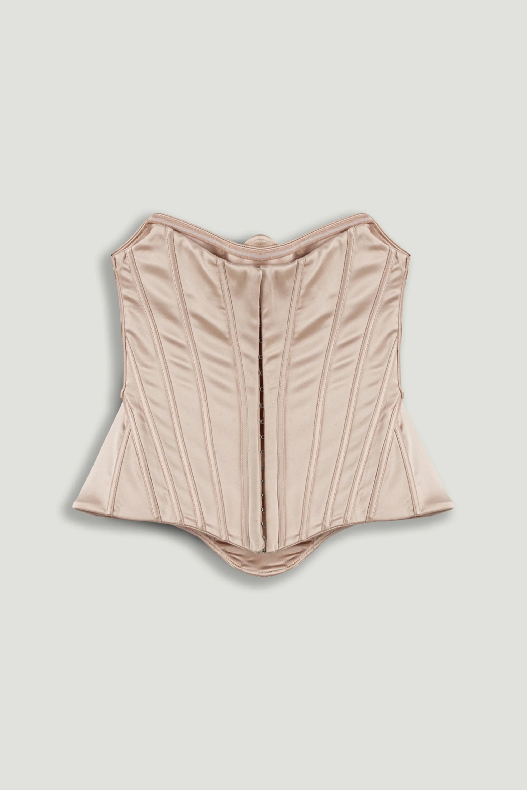 Crafted from lustrous satin, this strapless corset top features a contoured sweetheart neckline and sculpted boning that...