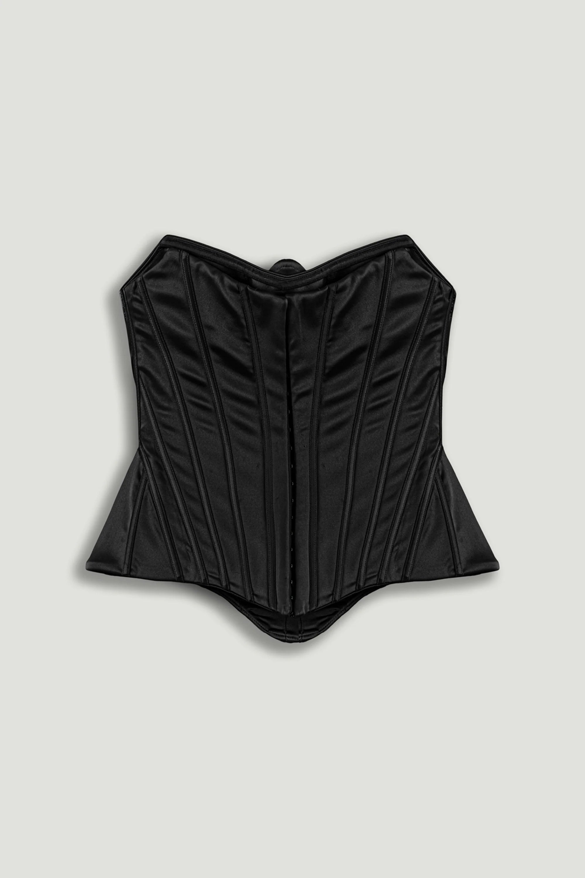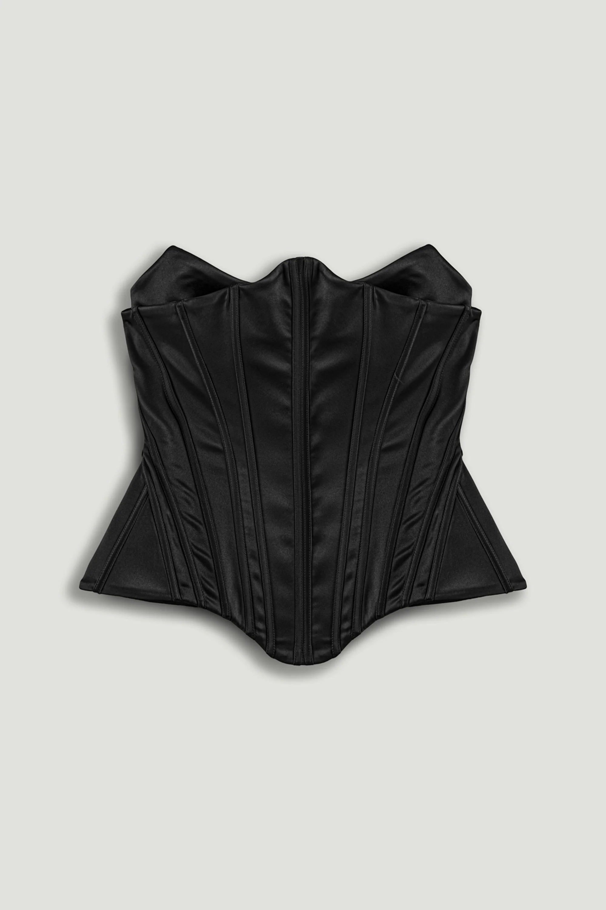Crafted from lustrous satin, this strapless corset top features a contoured sweetheart neckline and sculpted boning that...