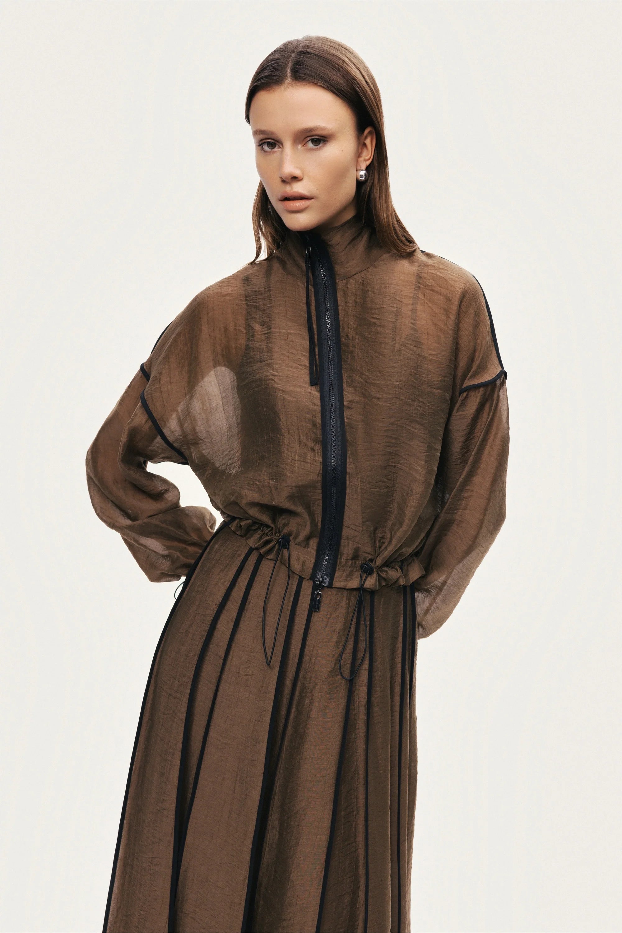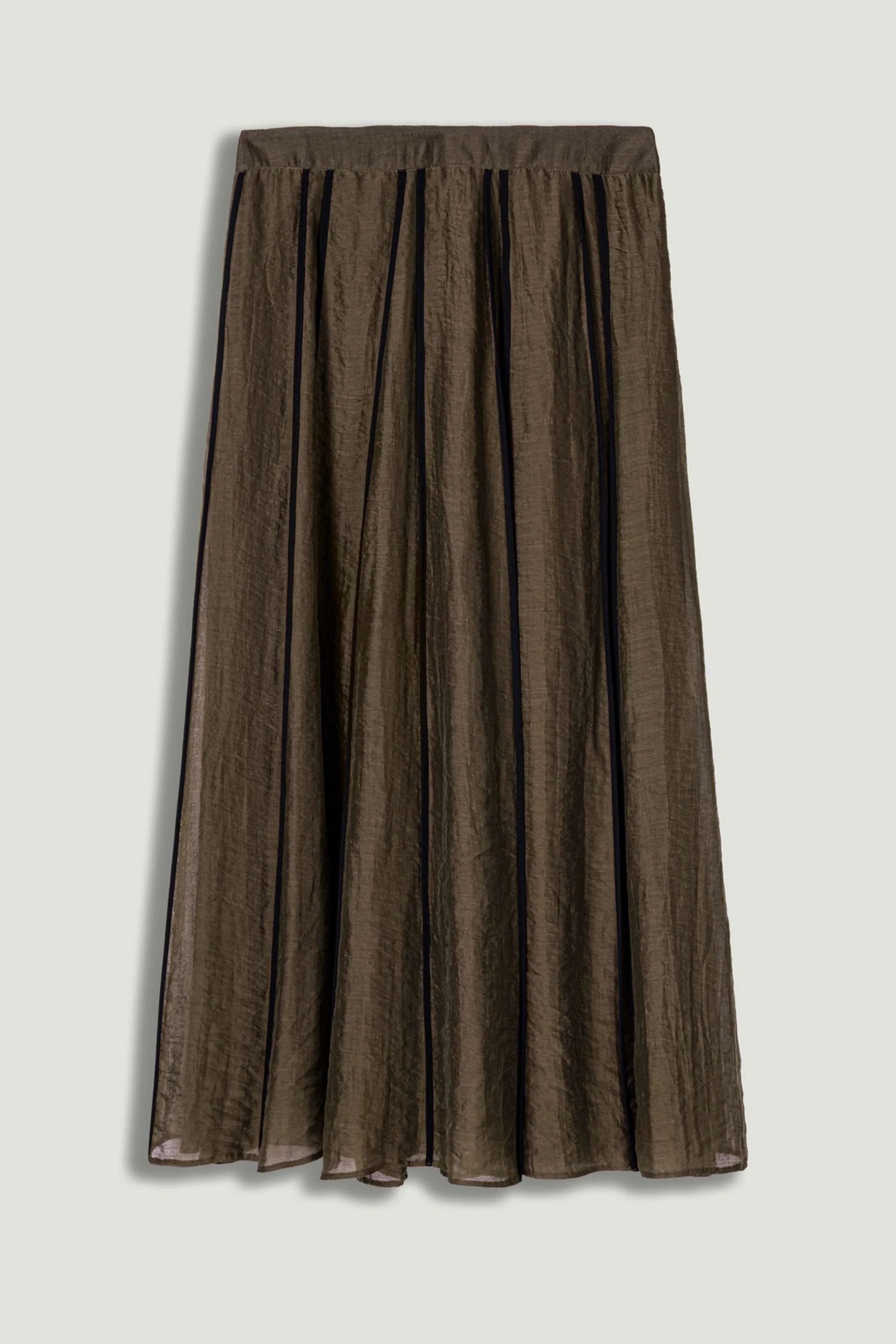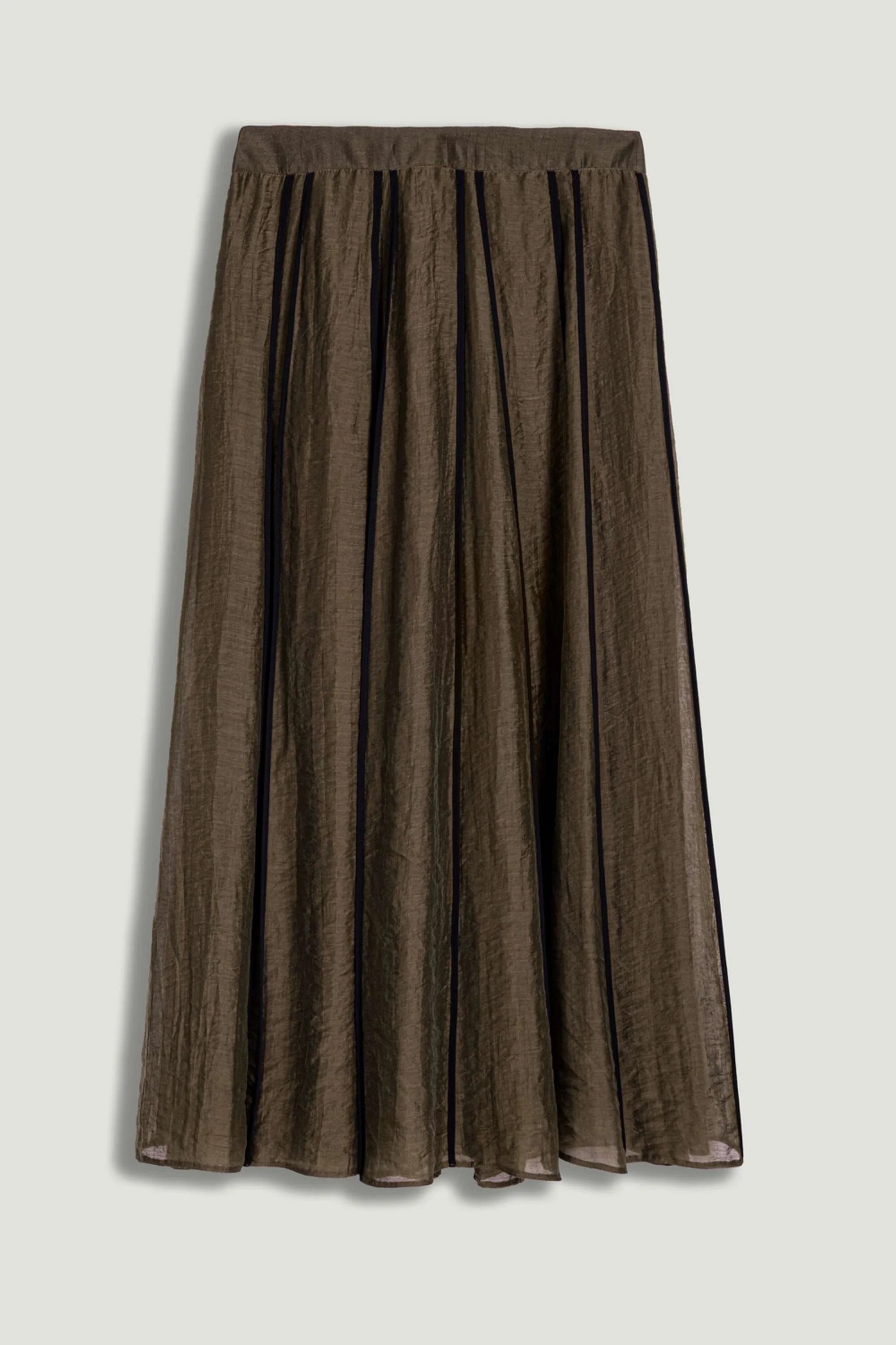 Lightweight and fluid with a softly pleated silhouette, this sheer midi skirt moves effortlessly with every step. Designed to sit elegantly at the waist, it adds a refined, modern touch to both day and evening looks.