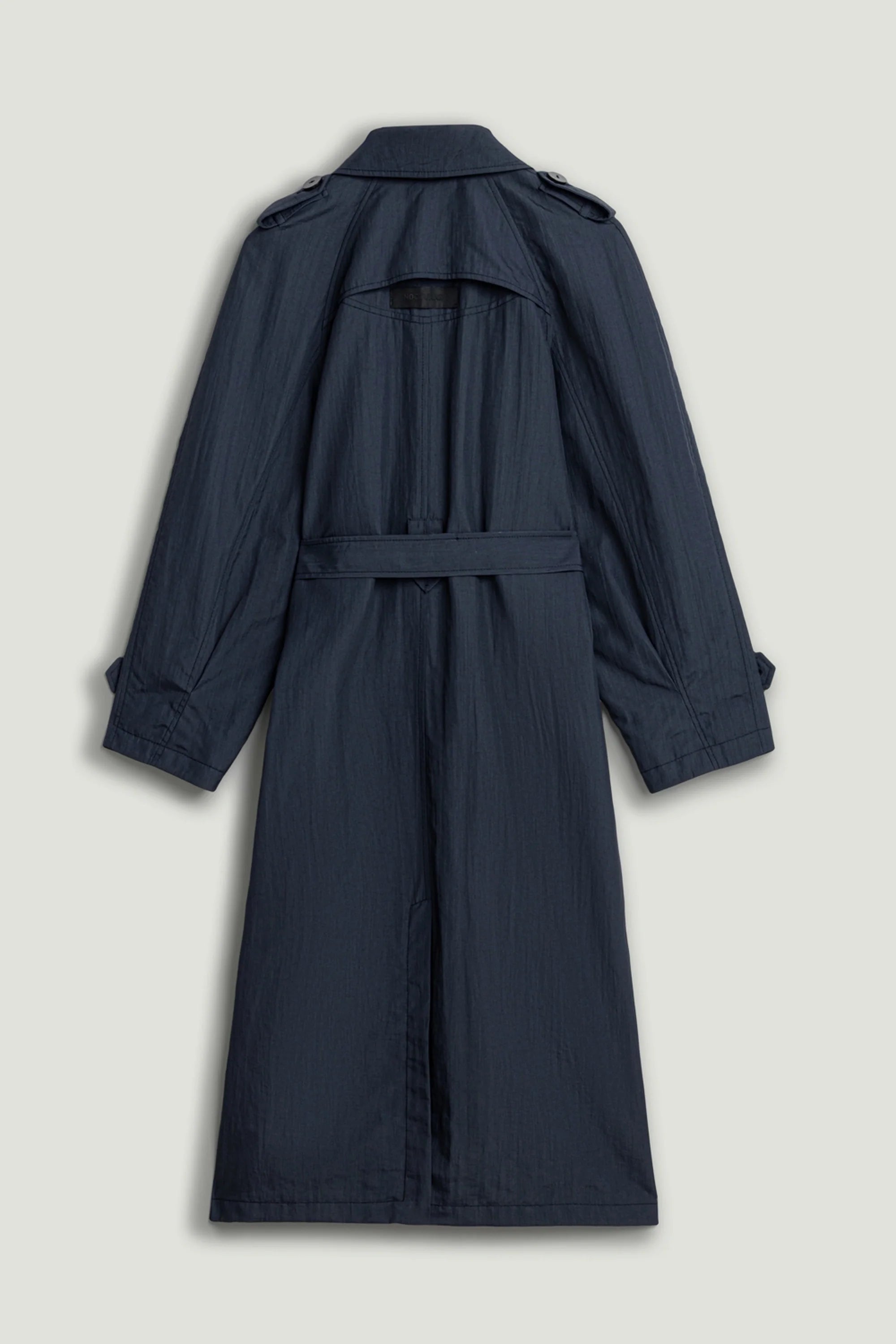 Regular fit; point collar with epaulettes; button front; back storm flap; cuff tabs; side pockets; back half-belt; center-back vent; midi length; lined.