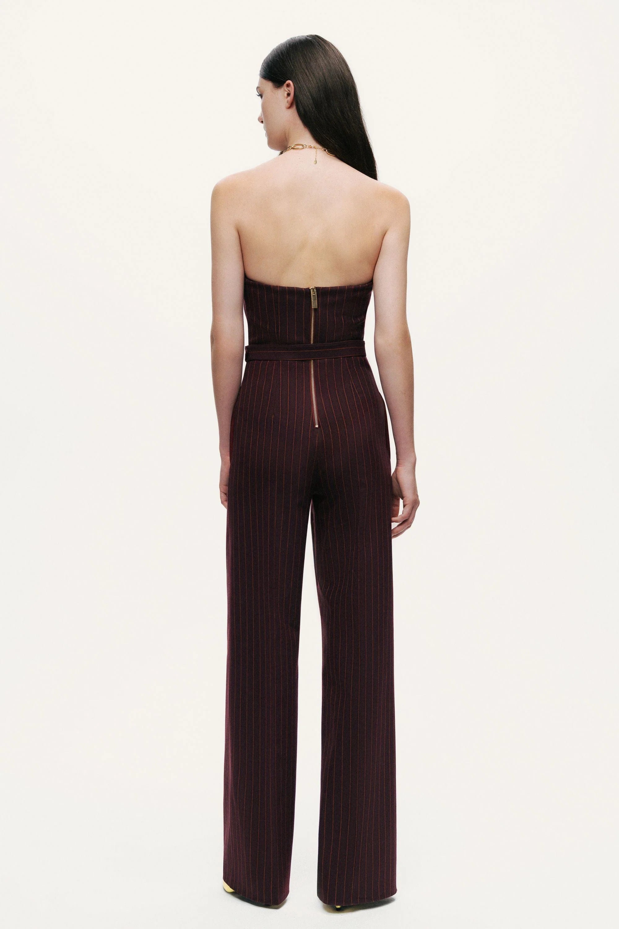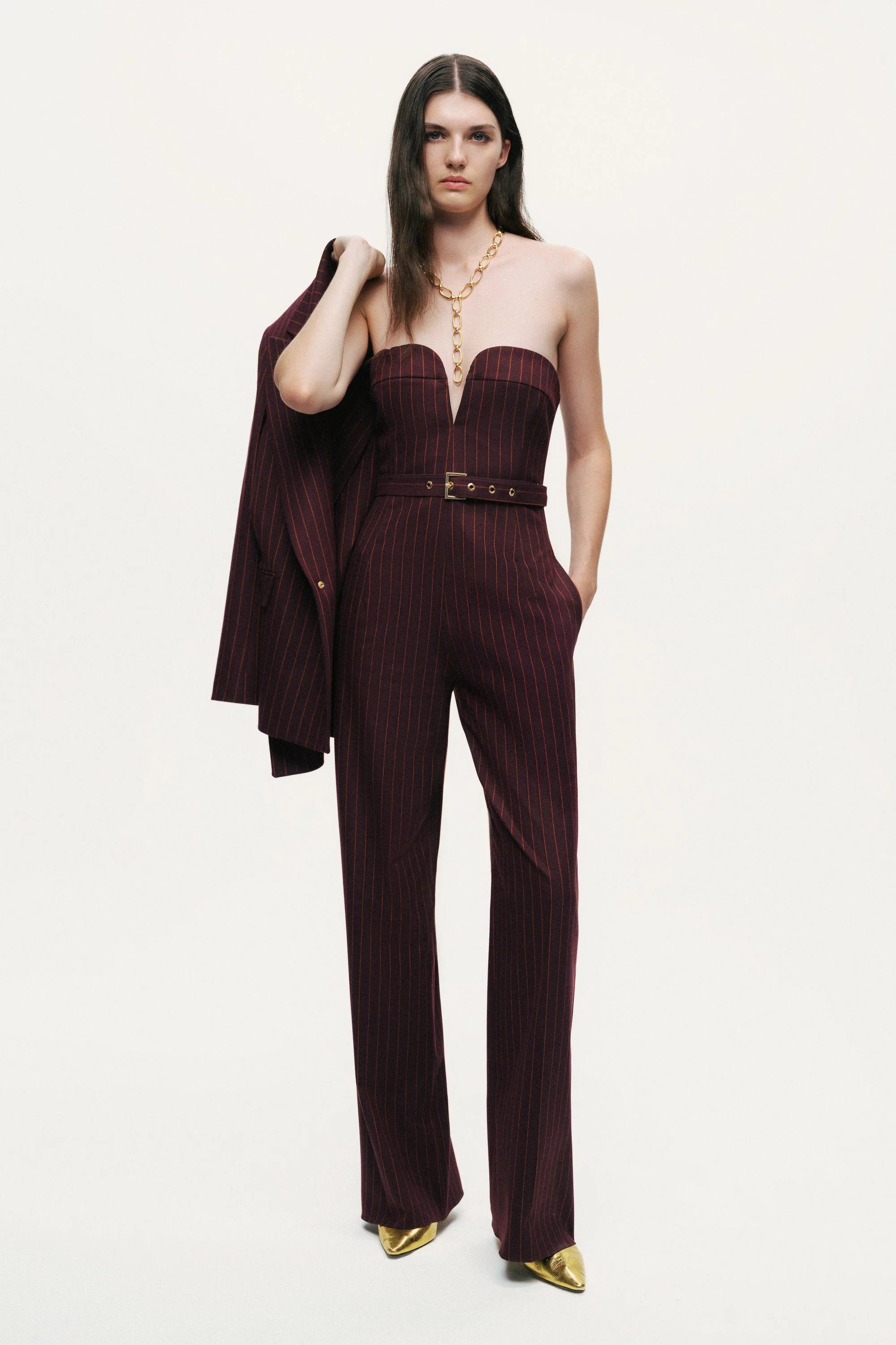 Crafted from sleek pinstripe suiting, this strapless jumpsuit brings a tailored, modern polish to one-piece dressing. The...