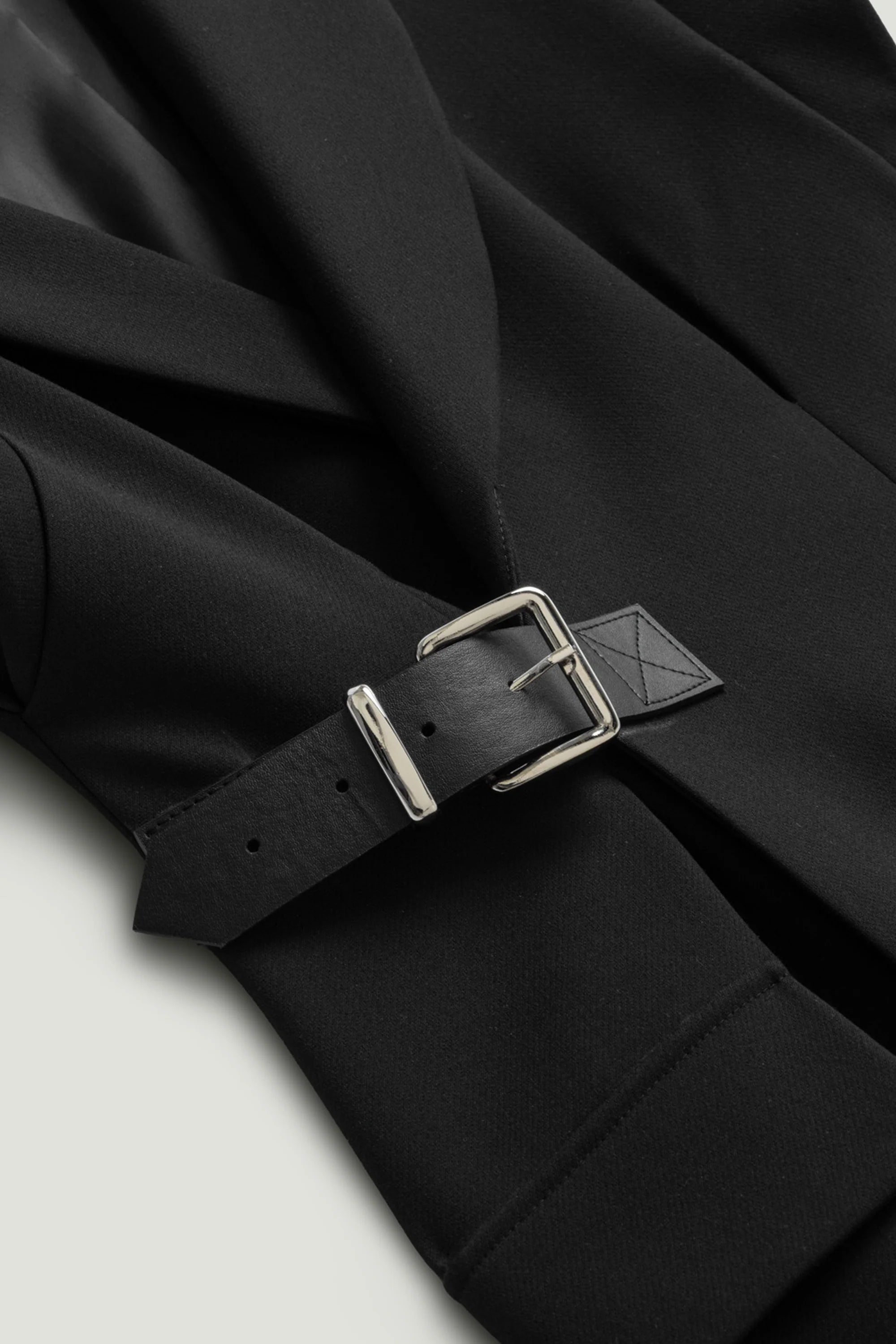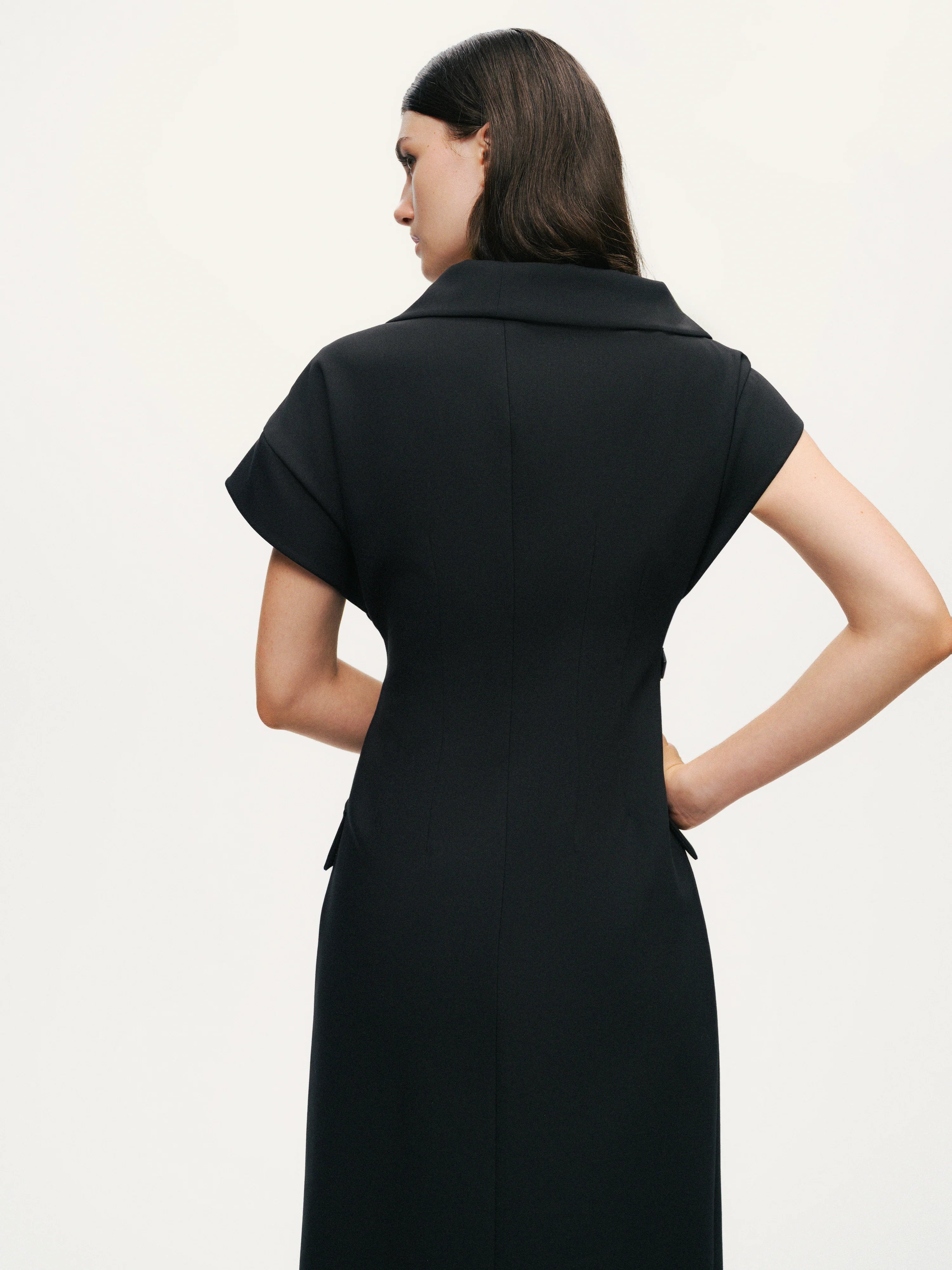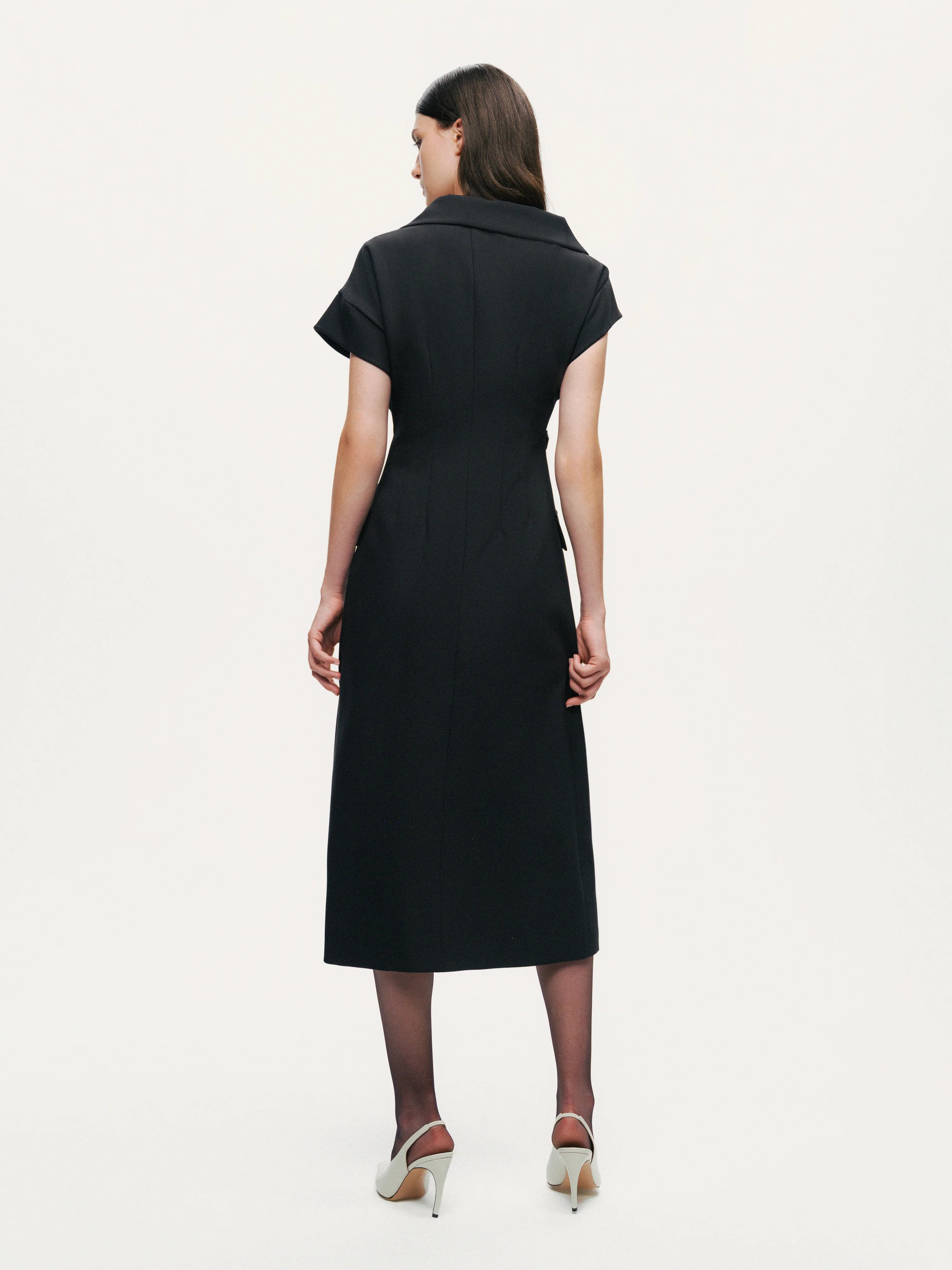 Step into sleek sophistication with this tailored buckle-wrap midi dress. Featuring a sharp V-neckline with lapel detailing...